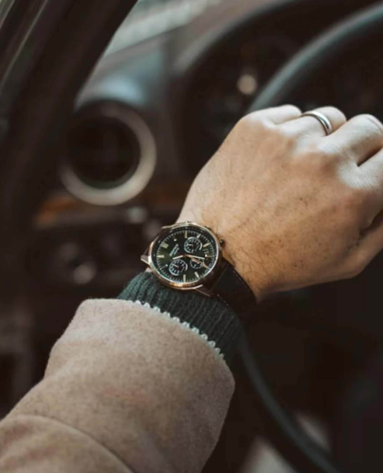 Завершает образ черный кожаный ремешок с перфорацией , обеспечивающий комфорт и дышащий эффект при ежедневном ношении. Застежка классическая, удобная и надёжная. В комплекте — батарейка, рассчитанная на 2 года автономной работы .