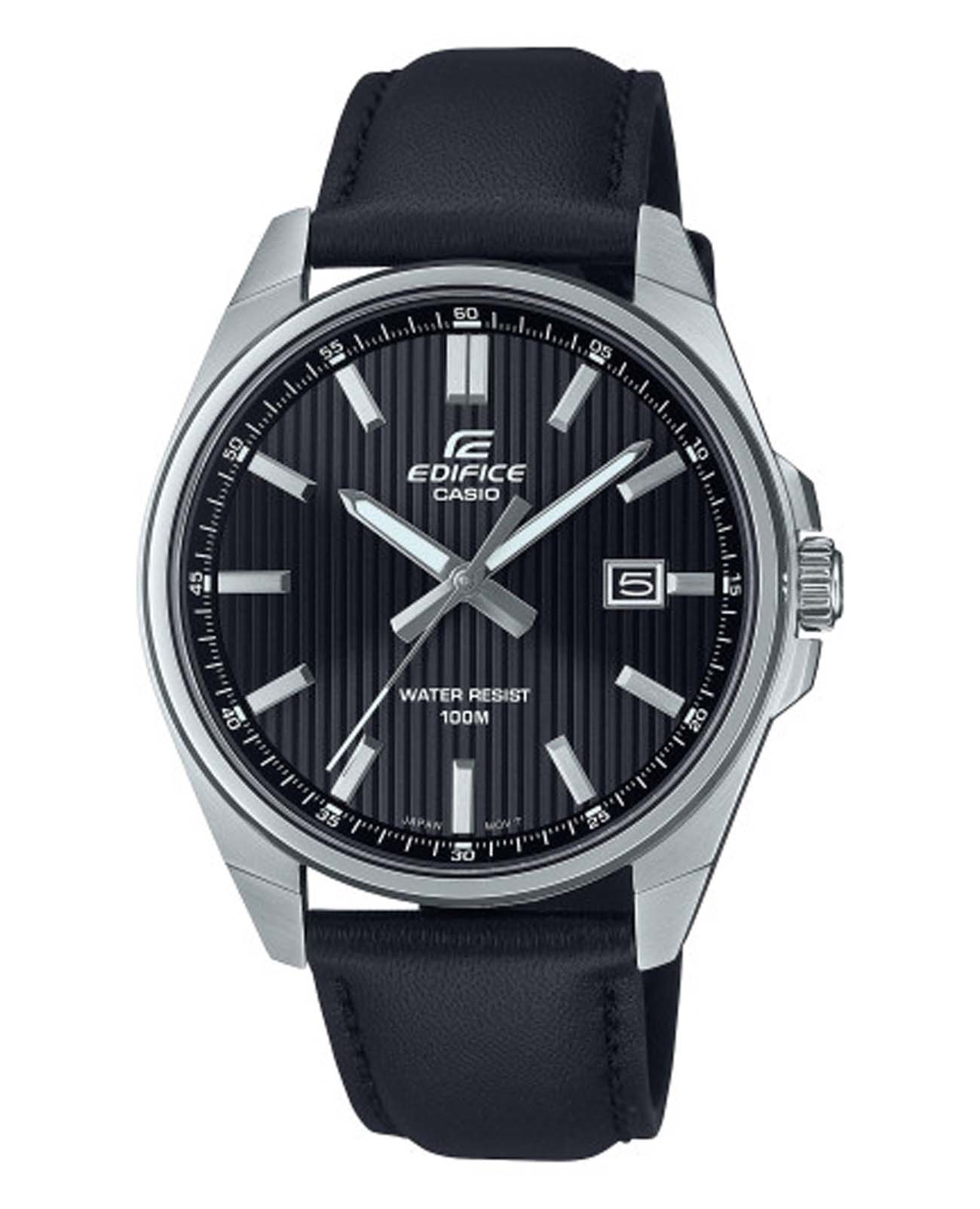 Японские мужские кварцевые часы Casio Edifice EFV-150L-1AVUDF, кварцевый механизм с высокой точностью. Минеральное стеклоМинеральное стеклоМинеральное стекло представляет собой искусственно выращенный минерал кварца. Такое стекло отличается особой устойчивостью к повреждениям и царапинам. Уступает по некоторым качествам сапфировому стеклу. устойчивое к мелким механическим повреждениям. Корпус часов изготовлен из нержавеющей стали. Подсветка NeobriteПодсветка NeobriteИспользование светонакопительных составов на основе сульфида цинка или алюмината стронция, яркий свет можно наблюдать на протяжении 6-10 часов после «зарядки» часов около источника света. обеспечивает длительное послесвечение в темноте даже после кратковременного нахождения на свету. Циферблат с метками в виде штрихов. Окошко даты в положении 3 часов. Класс водозащиты: 100 метров, позволит плавать, нырять и заниматься другими водными видами спорта. Кожаный ремешок на стандартной застежке.