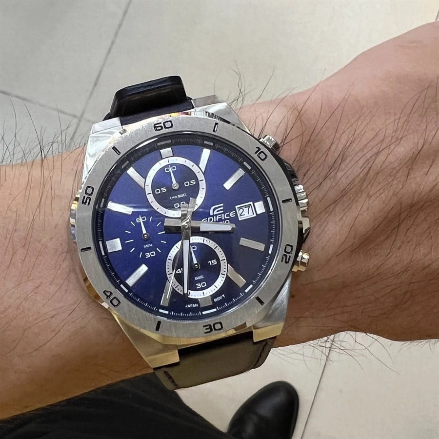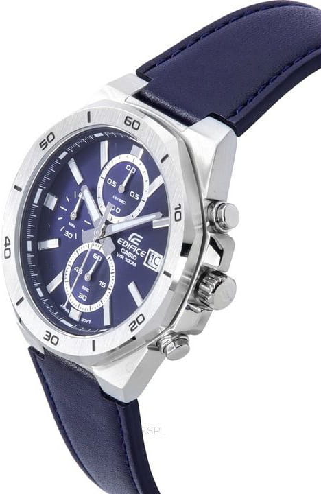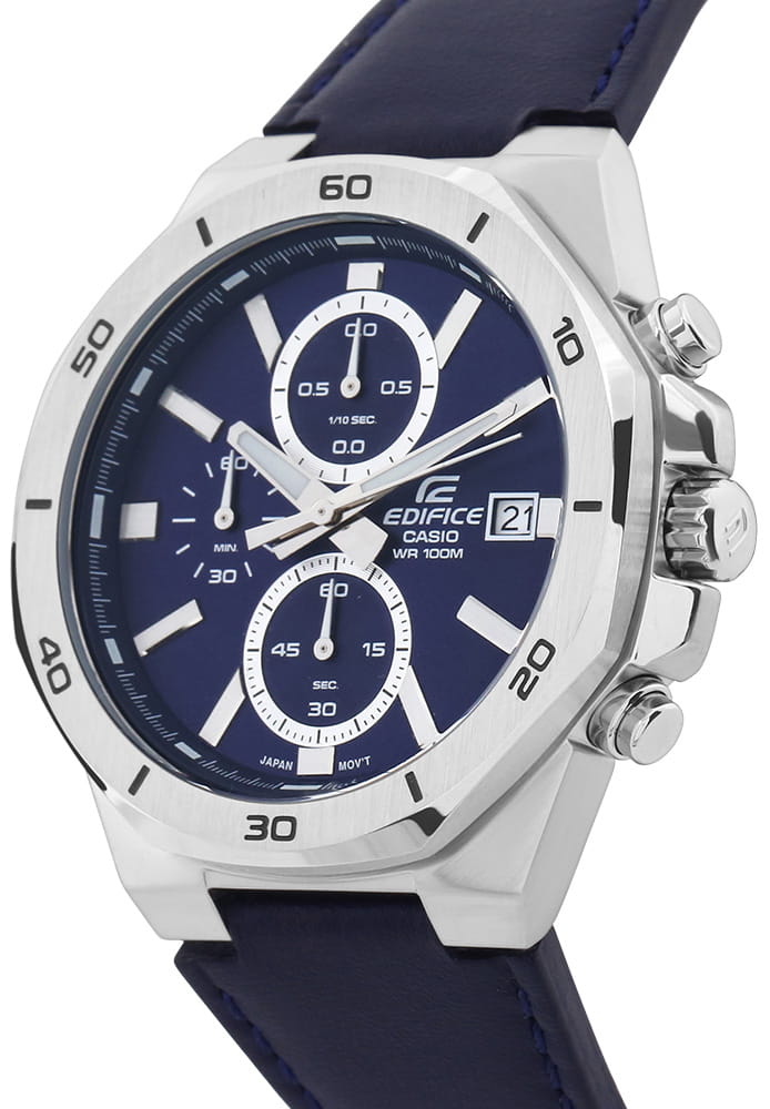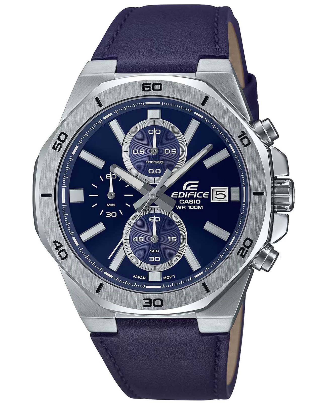 Японские мужские часы-хронографХронографФункция позволяет измерять отрезки времени с особой точностью: часы, минуты, секунды. Верным признаком хронографа является наличие на циферблате 3 дополнительных окошек-счётчиков. с секундомеромСекундомерСекундоме́р — прибор, способный измерять интервалы времени с точностью до долей секунды. Casio Edifice EFV-640L-2A, кварцевый механизм с высокой точностью. Класс водозащиты: 100 метров, позволит плавать, нырять и заниматься другими водными видами спорта. Корпус часов изготовлен из стали. Кожаный ремешок на стандартной застёжке. В этих часах от Casio гармонично сочетается функциональность и стильный дизайн. Подсветка NeobriteПодсветка NeobriteИспользование светонакопительных составов на основе сульфида цинка или алюмината стронция, яркий свет можно наблюдать на протяжении 6-10 часов после «зарядки» часов около источника света. обеспечивает длительное послесвечение в темноте даже после кратковременного нахождения на свету. СекундомерСекундомерСекундоме́р — прибор, способный измерять интервалы времени с точностью до долей секунды. с точностью показаний 1/10с и временем измерения 1ч. Циферблат выполнен по технологии Sunray (солнечные лучи). Метки в виде штрихов. Окошко даты находится в положении 3 часа. Заводная головка с защитой. Батарея рассчитана на 2 года. Водонепроницаемость 10 Бар в соответствии с ISO 2281. Неподвижный стальной безельБезельВнешний ободок, закрепляющий стекло. В спортивных часах так называется поворотное кольцо с делениями на циферблате, выполняет роль таймера – замеряет отрезки времени на шкале. Неподвижный безель – элемент декора. Однонаправленно вращающийся безель на дайверских часах позволяет фиксировать моменты погружения и выныривания на поверхность..