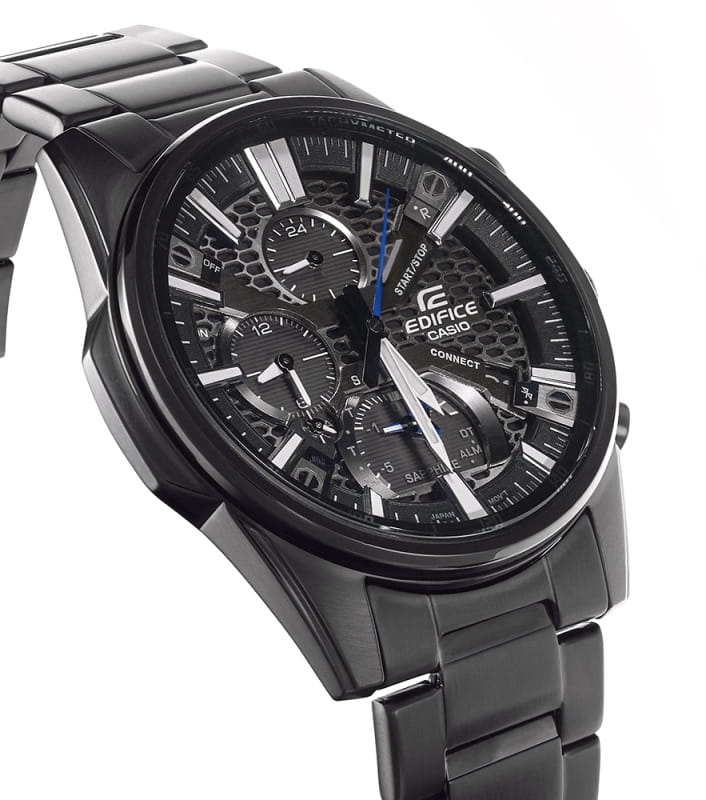Карбоновый безель гармонируют с серым фоном. Часы выполнены в спортивном стиле, ссылаясь на дизайн эксклюзивных спорткаров и автомобильных деталей. Они основаны на технологии , оснащены расширенными функциональными возможностями: BluetoothBluetoothСовременная технология, позволяющая синхронизировать часы с телефоном и переносить данные. Часы с Bluetooth расширяют возможности вашего смартфона и делают его использование ещё более удобным. нового поколения с низким потреблением энергии, автоматический календарь, хронографХронографФункция позволяет измерять отрезки времени с особой точностью: часы, минуты, секунды. Верным признаком хронографа является наличие на циферблате 3 дополнительных окошек-счётчиков., секундомер, индикатор последнего круга дистанции Last Lap Indicator, мировое время. Модель комплектуется надёжным браслетом из нержавеющей стали. Заводная головка с защитой. Ударопрочный корпусУдаропрочный корпусМеханизм заключён в корпус, выполненный из современных материалов, устойчивых к ударам, механическим повреждениям и падению с высоты: инновационный пластик, карбон, нержавеющая сталь, титан.. Сапфировое стекло с антибликовым покрытием. Водонепроницаемость WR 100. Подсветка NeobriteПодсветка NeobriteИспользование светонакопительных составов на основе сульфида цинка или алюмината стронция, яркий свет можно наблюдать на протяжении 6-10 часов после «зарядки» часов около источника света.. Габариты: 50 x 45,2 x 9,6 мм.