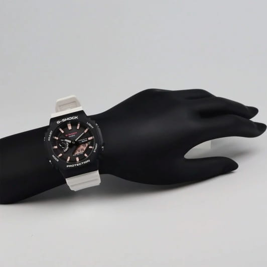 Мужские кварцевые часы Casio GA-B2100CD-1A7 — это лимитированная модель из коллекции G-Shock, посвящённая фауне Галапагосских островов. Модель выполнена в черном цвете с белым полимерным ремешком, а её размеры составляют 45,5x48,5 мм при толщине 11,9 мм. Корпус усилен углеродным волокном, изготовленным по технологии Carbon Core GuardCarbon Core Guard Новейшая структура корпуса, разработанная Casio. Полиуретановая пластина дополнительно усилена карбоновыми вставками, что придаёт специальную защиту от механических повреждений. Карбон отличается лёгкостью и прочностью., что делает его прочным и устойчивым к царапинам. Защиту механизма обеспечивает минеральное стеклоМинеральное стеклоМинеральное стекло представляет собой искусственно выращенный минерал кварца. Такое стекло отличается особой устойчивостью к повреждениям и царапинам. Уступает по некоторым качествам сапфировому стеклу., устойчивое к повреждениям. Стрелки покрыты необритовым люминесцентным напылениемПодсветка NeobriteИспользование светонакопительных составов на основе сульфида цинка или алюмината стронция, яркий свет можно наблюдать на протяжении 6-10 часов после «зарядки» часов около источника света., обеспечивающим длительное свечение даже после кратковременного нахождения на свету. Функциональность модели включает таймер обратного отсчёта, хронограф, секундомер с точностью 1/100 секунды, будильник, мировое время (48 городов, 31 часовой пояс), вечный календарь до 2099 года, функцию летнего времени (DST), сигнал начала часа, двойную диодную подсветку циферблата с возможностью выбора времени свечения (1,5 или 3 секунды), функцию выключения звука нажатия кнопок (Mute) и беспроводную технологию Bluetooth® со сверхнизким потреблением энергии для синхронизации со смартфоном. Индикатор режима на девяти часах выполнен в виде силуэта ныряющего пингвина — уникального вида пингвинов, обитающих на экваторе. Ремешок оснащён классической застёжкой, а водонепроницаемость позволяет использовать модель при плавании и других водных активностях без глубокого погружения. Эти часы станут универсальным аксессуаром для тех, кто ценит сочетание стиля, функциональности и надёжности — идеальный выбор для повседневной носки и активного образа жизни.