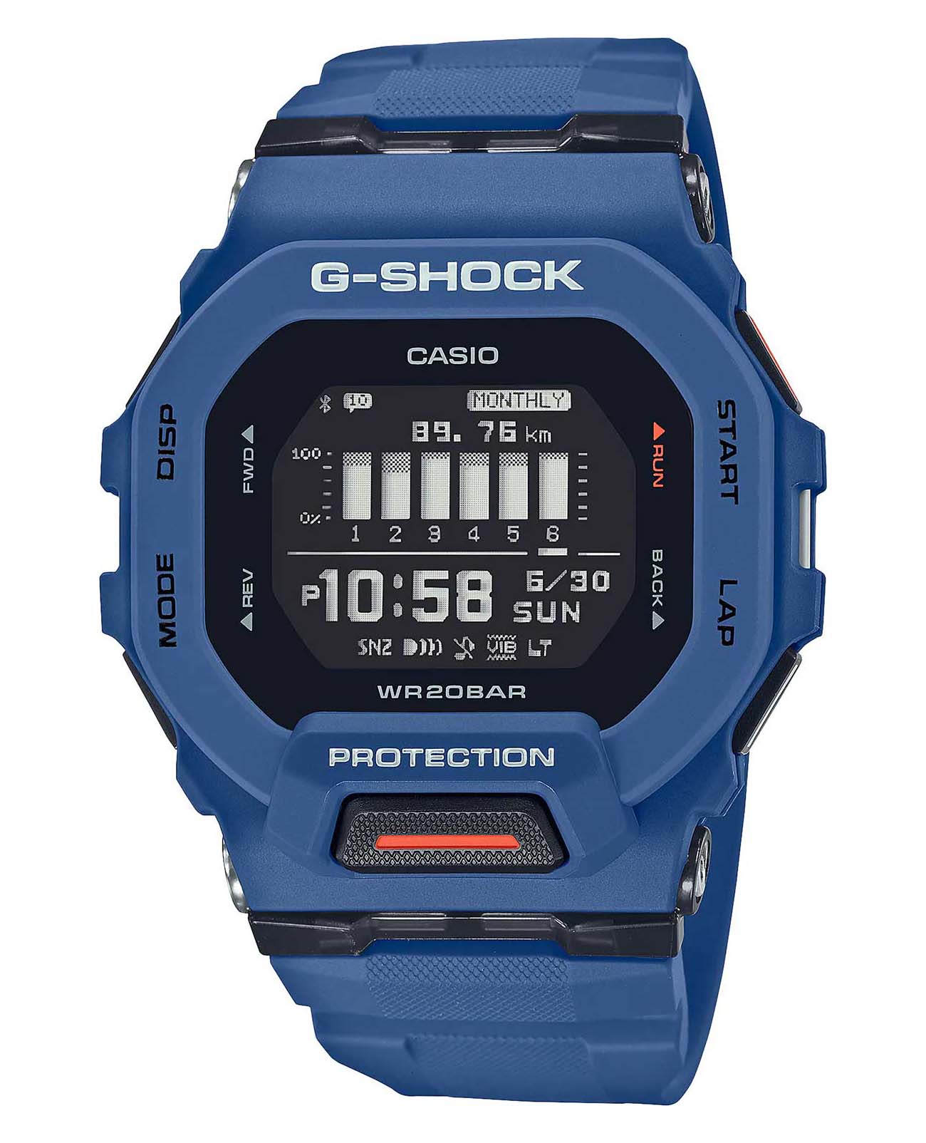 Японские мужские ударопрочные часы c функцией Bluetooth Casio G-Shock GBD-200-2DR (GBD-200-2), электронный механизм с высокой точностью. Класс водозащиты: 200 метров, позволит плавать, нырять и заниматься другими водными видами спорта. Корпус часов изготовлен из пластика, цвета.