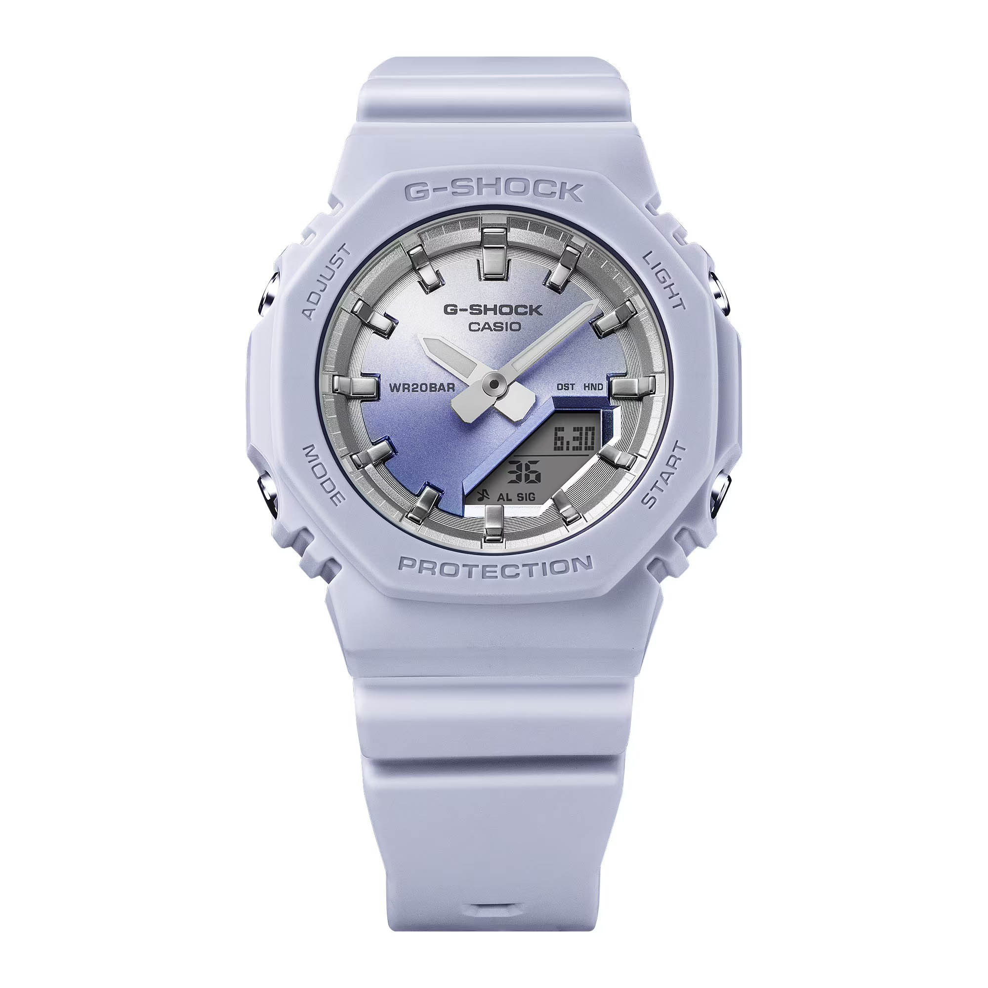 Женские кварцевые часы Casio G-Shock GMA-P2100SG-2A. Корпус часов изготовлен из пластика. Стрелки с люминесцентным покрытиемЛюминесцентное покрытиеПозволяет считывать показания времени в темноте. Производители наносят на стрелки, часовые индексы, безель или поверхность циферблата светонакопительный состав, дающий холодное свечение.. Водозащита: 200 метров, позволит плавать, нырять и заниматься другими водными видами спорта. Минеральное стеклоМинеральное стеклоМинеральное стекло представляет собой искусственно выращенный минерал кварца. Такое стекло отличается особой устойчивостью к повреждениям и царапинам. Уступает по некоторым качествам сапфировому стеклу. устойчивое к появлению царапин, обладающее высокой прозрачностью.
