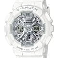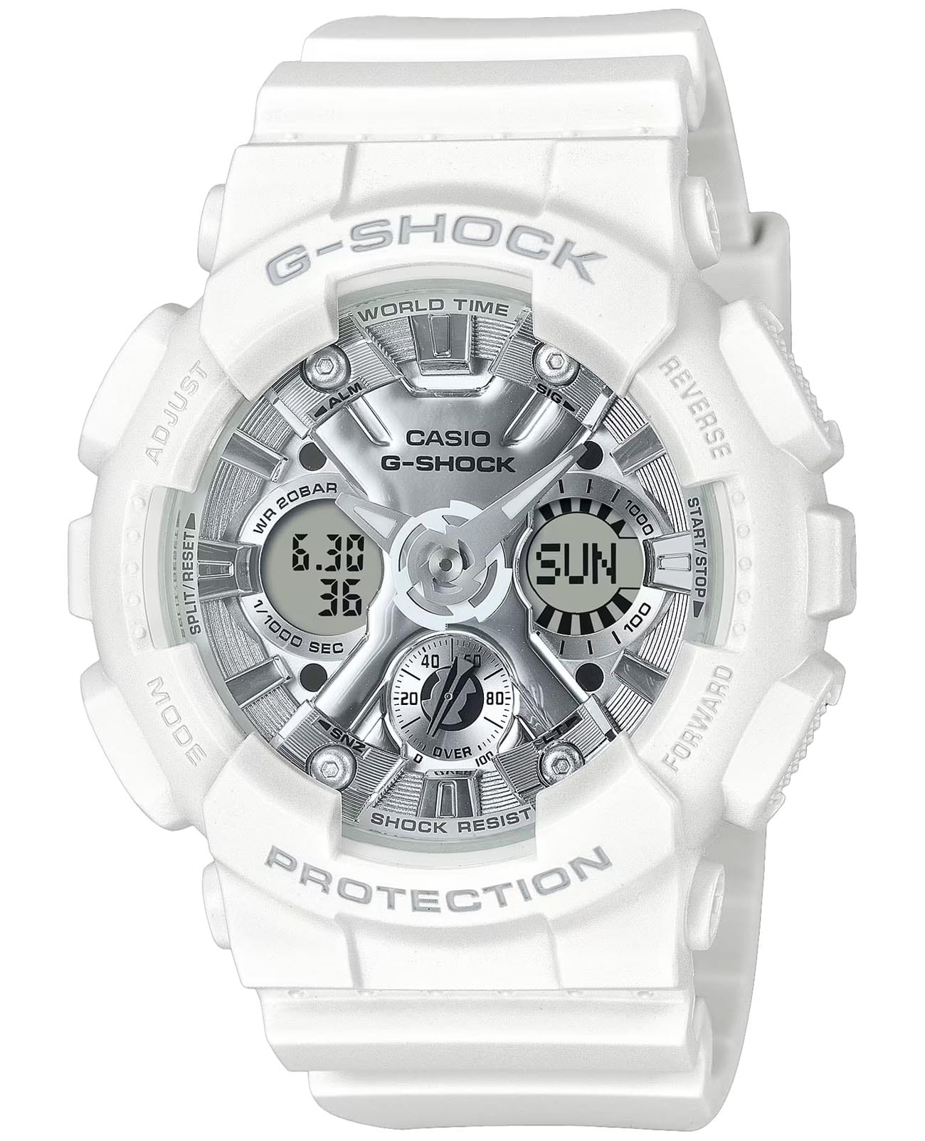 Японские женские часы GMA-S120VA-7A из коллекции G-Shock представлены в спортивном облачении. Кварцевые часы. Аналогово-цифровой циферблат. Наручные часы с противоударным корпусомУдаропрочный корпусМеханизм заключён в корпус, выполненный из современных материалов, устойчивых к ударам, механическим повреждениям и падению с высоты: инновационный пластик, карбон, нержавеющая сталь, титан. выполнены из полимерного материала, легко поглощающего силу удара и вибрации, что делает их надёжным и долговечным аксессуаром. Кварцевый механизм японского производства. Батарейка рассчитана на 3 года службы. Стрелки со светодиодной подсветкойСветодиодная подсветкаСветодиодная или LED-подсветка обеспечивает появление яркого холодного свечения за счёт LED-элементов - маленьких лампочек. Они потребляют минимальное количество энергии, чаще всего можно встретить 1 светодиод, в нижней части циферблата.. Минеральное стеклоМинеральное стеклоМинеральное стекло представляет собой искусственно выращенный минерал кварца. Такое стекло отличается особой устойчивостью к повреждениям и царапинам. Уступает по некоторым качествам сапфировому стеклу.. Защита от магнитных полей. Водонепроницаемость 200 метров, позволит плавать, нырять и заниматься другими водными видами спорта. Функциональные возможности: мировое времяМировое время Полезное часовое усложнение, отображающее время в основных городах и известных областях по всему миру, оно связано с часовыми поясами, удобно для путешественников и бизнесменов. , таймерТаймерОтсчитывает секунды в обратном направлении в заданном интервале времени. обратного отсчёта, будильникБудильникБуди́льник — часы, в заданный момент времени подающие звуковой, световой и/или в редких случаях другой сигнал., хронографХронографФункция позволяет измерять отрезки времени с особой точностью: часы, минуты, секунды. Верным признаком хронографа является наличие на циферблате 3 дополнительных окошек-счётчиков., автоматический календарь до 2099 года, UTCUTCВсемирное кординационное время, не имеющее привязки к географическому положению Гринвича, основывается на атомном отсчёте времени. Регулировка времени осуществляется более точно, чем устаревшее GMT.