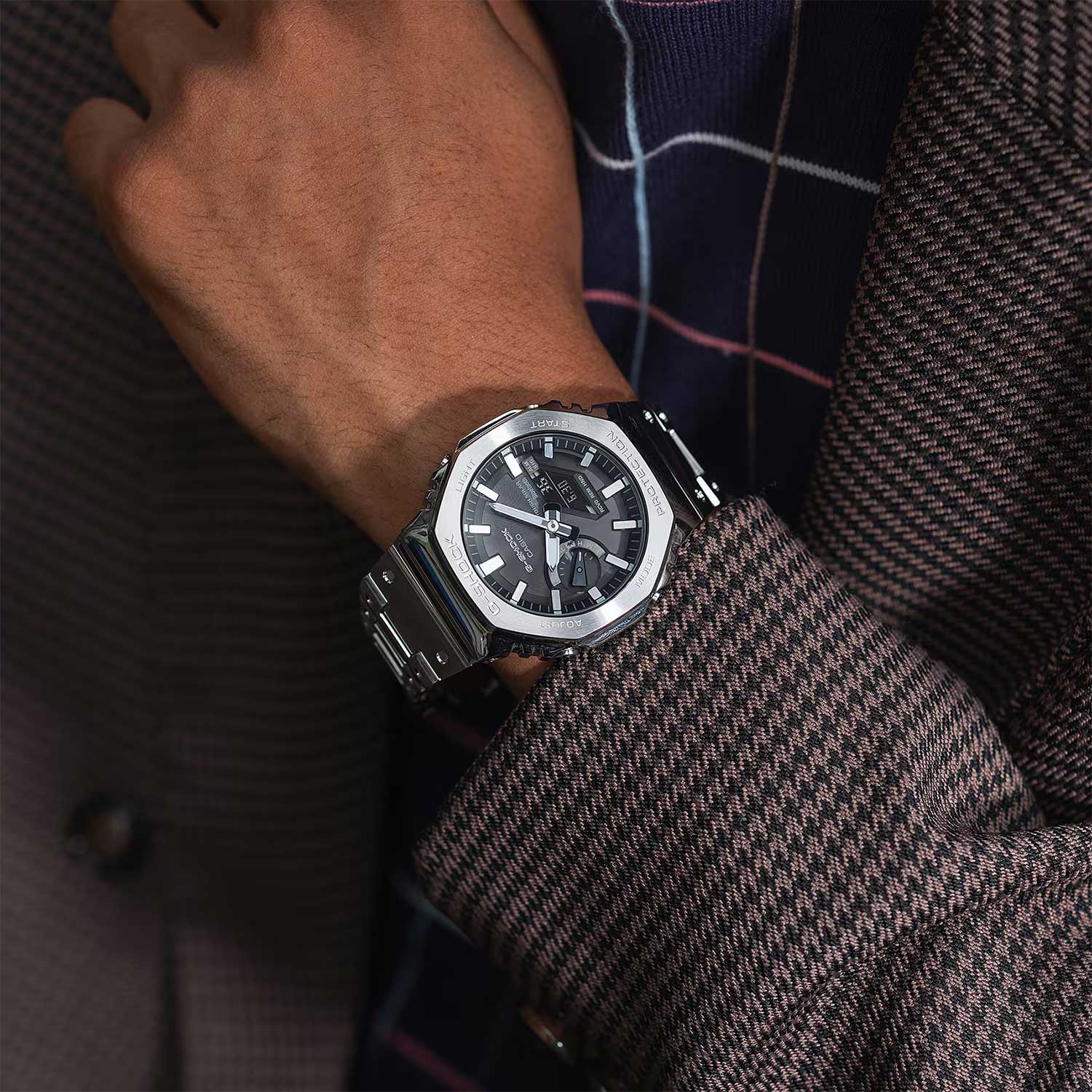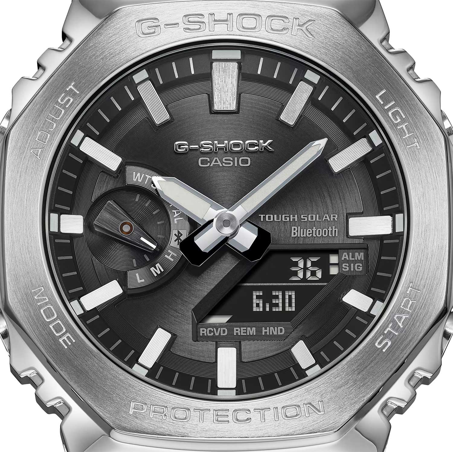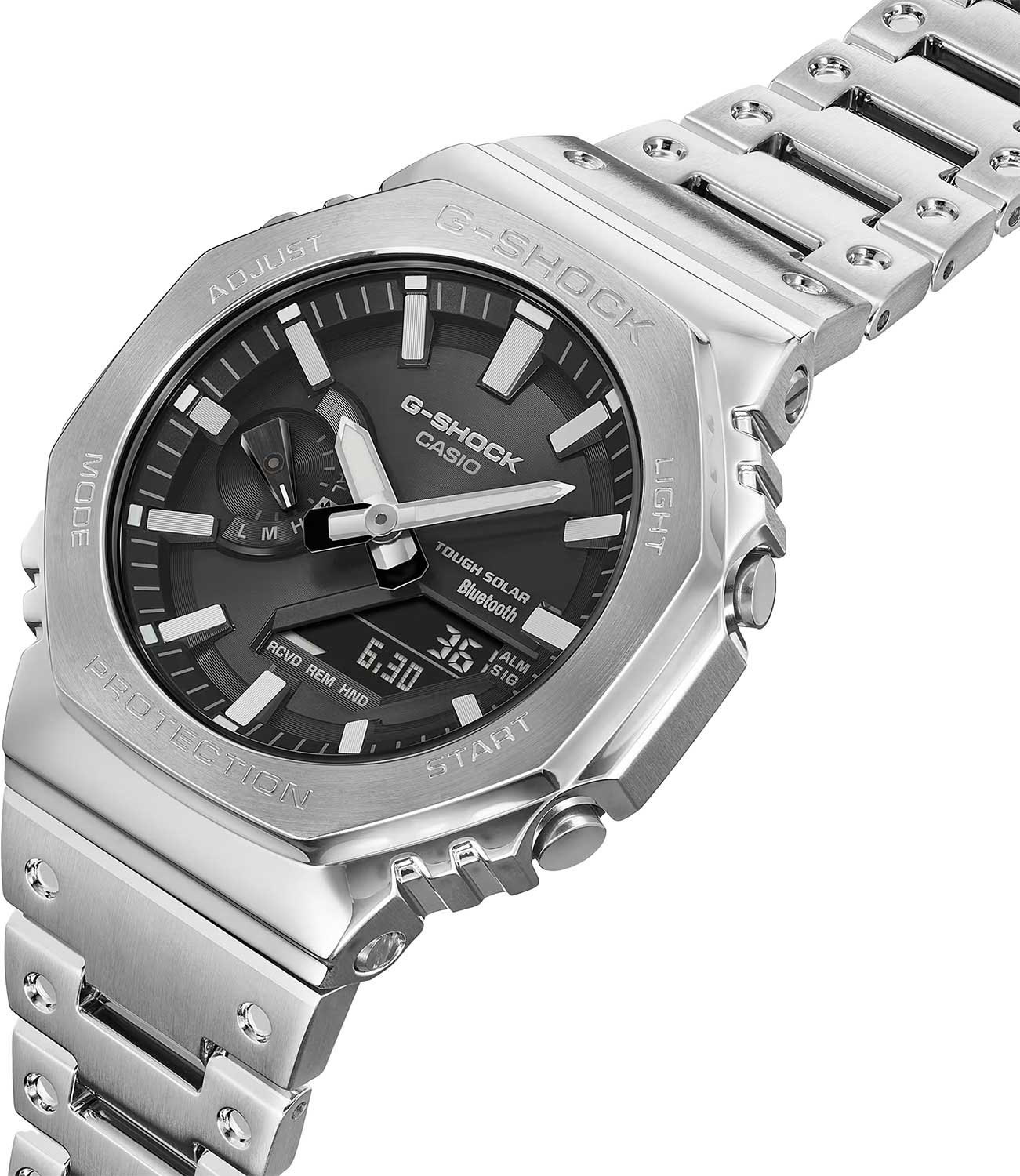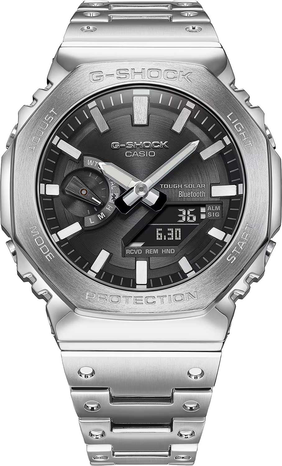 Модель Casio G-SHOCK GM-B2100SD-1A представляет собой эволюцию культовой серии 2100 в полнометаллическом исполнении. Восьмиугольный безельБезельВнешний ободок, закрепляющий стекло. В спортивных часах так называется поворотное кольцо с делениями на циферблате, выполняет роль таймера – замеряет отрезки времени на шкале. Неподвижный безель – элемент декора. Однонаправленно вращающийся безель на дайверских часах позволяет фиксировать моменты погружения и выныривания на поверхность., вдохновленный оригинальной моделью DW-5000C 1983 года, придает часам современный и минималистичный стиль. Корпус и браслет изготовлены из нержавеющей стали, а амортизирующие элементы из мелкозернистой смолы защищают механизм от ударов и вибраций, обеспечивая ударопрочностьУдаропрочный корпусМеханизм заключён в корпус, выполненный из современных материалов, устойчивых к ударам, механическим повреждениям и падению с высоты: инновационный пластик, карбон, нержавеющая сталь, титан.. Часы оснащены солнечным питанием Tough SolarTough SolarТехнология основана на подзарядке аккумулятора от источника солнечного света, специальная панель улавливает солнечные лучи и преобразует их в энергию для работы часов. Достаточно пары минут нахождения на солнце для функционирования часов в течении суток., позволяющим заряжать аккумулятор от солнечного света, а также Bluetooth®-синхронизациейBluetoothСовременная технология, позволяющая синхронизировать часы с телефоном и переносить данные. Часы с Bluetooth расширяют возможности вашего смартфона и делают его использование ещё более удобным., обеспечивающей автоматическую корректировку времени и управление настройками через приложение CASIO WATCHES. Дополнительные функции включают мировое времяМировое время Полезное часовое усложнение, отображающее время в основных городах и известных областях по всему миру, оно связано с часовыми поясами, удобно для путешественников и бизнесменов. , секундомерСекундомерСекундоме́р — прибор, способный измерять интервалы времени с точностью до долей секунды., таймер обратного отсчетаТаймерОтсчитывает секунды в обратном направлении в заданном интервале времени., будильникиБудильникБуди́льник — часы, в заданный момент времени подающие звуковой, световой и/или в редких случаях другой сигнал. и светодиодную подсветкуСветодиодная подсветкаСветодиодная или LED-подсветка обеспечивает появление яркого холодного свечения за счёт LED-элементов - маленьких лампочек. Они потребляют минимальное количество энергии, чаще всего можно встретить 1 светодиод, в нижней части циферблата.. Водонепроницаемость до 200 метров делает часы идеальными для плавания и активного отдыха. Casio G-SHOCK GM-B2100SD-1A — это сочетание классического дизайна, передовых технологий и непревзойденной надежности.