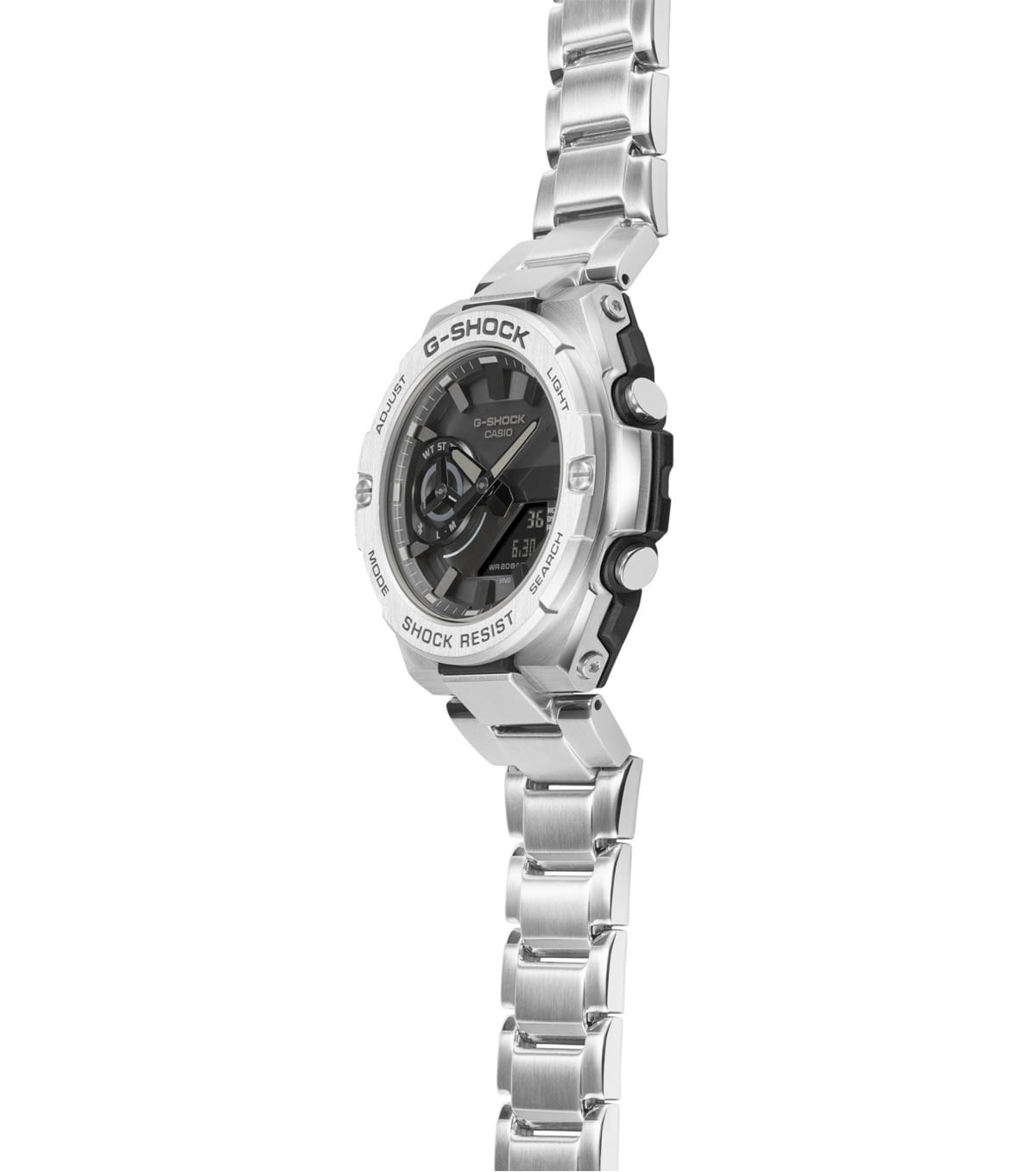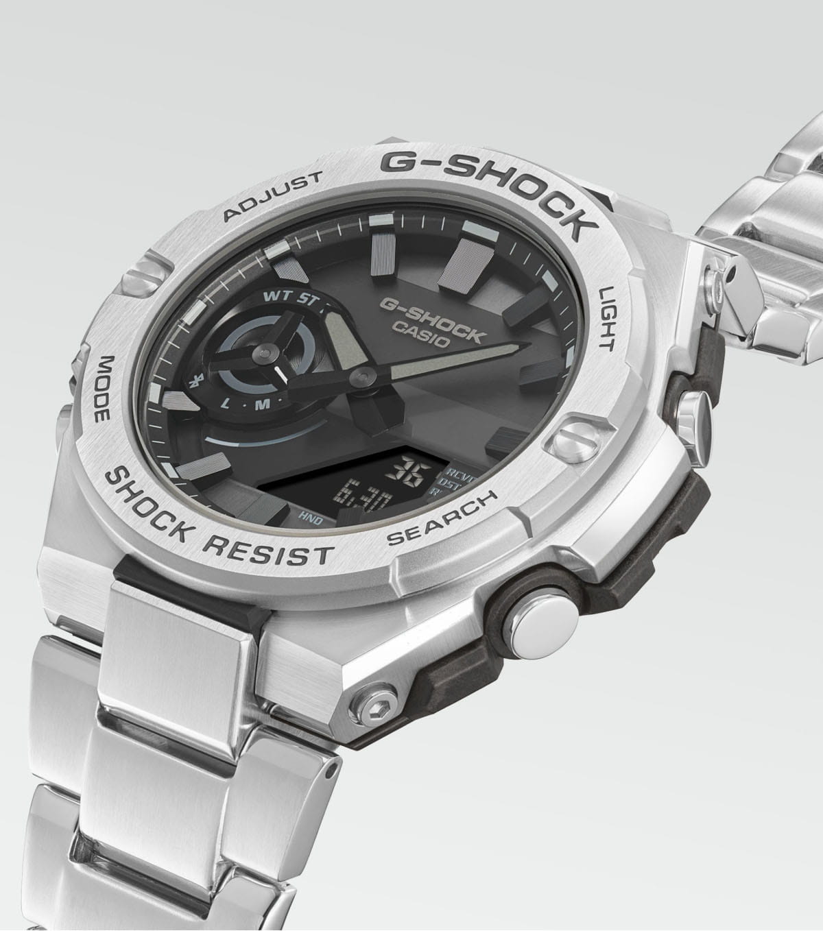 Японские мужские часы-хронографХронографФункция позволяет измерять отрезки времени с особой точностью: часы, минуты, секунды. Верным признаком хронографа является наличие на циферблате 3 дополнительных окошек-счётчиков. с минеральным стекломМинеральное стеклоМинеральное стекло представляет собой искусственно выращенный минерал кварца. Такое стекло отличается особой устойчивостью к повреждениям и царапинам. Уступает по некоторым качествам сапфировому стеклу. Casio G-Shock GST-B500D-1A1, кварцевый механизм с высокой точностью. Линейка GST-B500 объединяет в себе все самое необходимое, что нужно современным мужчинам. КарбоновыйКарбонОт «carbon», «carbone» - углерод, углепластик - полимерный композиционный материал из переплетённых под определенным углом между собой нитей углеродного волокна, применяется для изготовления лёгких, но прочных деталей. В часах часто используют для украшения циферблатов и ремешков. Так же карбон используется в изготовлении корпусов. Такие корпуса обладают антикоррозионным свойством, не поддаются электромагнитному излучению, обладают повышенной прочностью и противоударностью. каркас поглощает внешние удары, обеспечивая истинную прочность G-STEEL, а удобная посадка на запястье добавляет комфорта. Уменьшенная защита кнопок позволила создать тонкие, но в то же время широкие кнопки, которые легко нажимать. БезельБезельВнешний ободок, закрепляющий стекло. В спортивных часах так называется поворотное кольцо с делениями на циферблате, выполняет роль таймера – замеряет отрезки времени на шкале. Неподвижный безель – элемент декора. Однонаправленно вращающийся безель на дайверских часах позволяет фиксировать моменты погружения и выныривания на поверхность. подвергался многократной обработке для создания исключительной металлической текстуры, видимой под любым углом, что позволяет добиться изысканного вида. Питание от солнечной энергии Tough SolarTough SolarТехнология основана на подзарядке аккумулятора от источника солнечного света, специальная панель улавливает солнечные лучи и преобразует их в энергию для работы часов. Достаточно пары минут нахождения на солнце для функционирования часов в течении суток. солнечные батарейки большой мощности, индикатор заряда батареи. Функция автоматического сохранения энергии. Время работы аккумулятора без подзарядки приблизительно 7 месяцев, при включенной функции сохранения энергии приблизительно 18 месяцев. Механизм часов помещен в корпус из прочного материала, который надежно защищает от внешних воздействий, от ударов и вибрации. Carbon Core GuardCarbon Core Guard Новейшая структура корпуса, разработанная Casio. Полиуретановая пластина дополнительно усилена карбоновыми вставками, что придаёт специальную защиту от механических повреждений. Карбон отличается лёгкостью и прочностью. объединяет корпус и заднюю крышку в единый карбоновый моноблок. Ударопрочный корпусУдаропрочный корпусМеханизм заключён в корпус, выполненный из современных материалов, устойчивых к ударам, механическим повреждениям и падению с высоты: инновационный пластик, карбон, нержавеющая сталь, титан. из стали и полимерного материала защищает механизм от ударов и вибрации. Двойная светодиодная белая подсветка Super Illuminator с функцией Afterglow, одновременно подсвечивается аналоговый циферблат и цифровой дисплей. Све