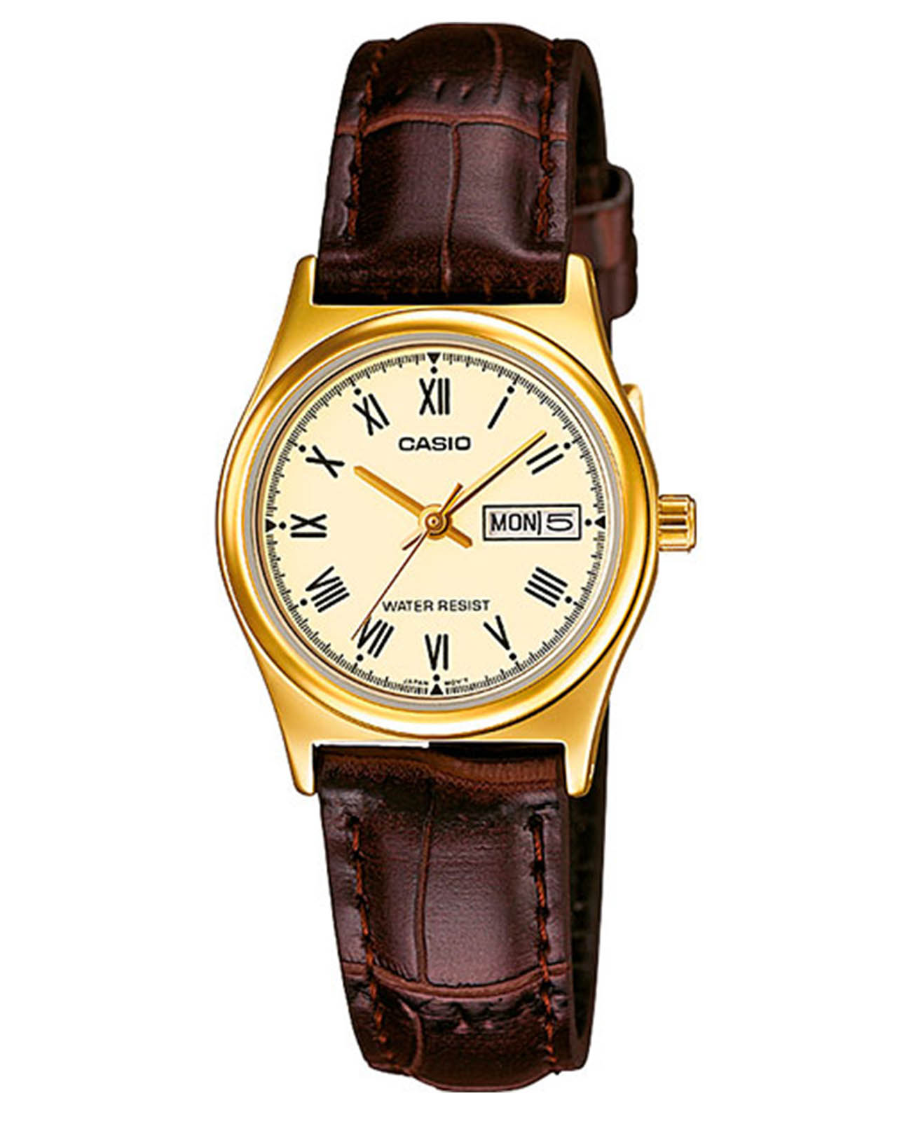 Японские женские часы LTP-V006GL-9B с минеральным стекломМинеральное стеклоМинеральное стекло представляет собой искусственно выращенный минерал кварца. Такое стекло отличается особой устойчивостью к повреждениям и царапинам. Уступает по некоторым качествам сапфировому стеклу. из коллекции LTP изящно смотрятся на запястье, они привлекают классическим исполнением и правильной геометрией. Минималистичная модель станет отличным решением для любого случая: на работу, переговоры с деловыми партнёрами, прогулку с друзьями или праздничный вечер. Отсутствуют лишние детали, что позволяет часам быть актуальными на долгие годы. Корпус выполнен из нержавеющей стали 316L с IP-покрытиемIP-покрытиеМетод ионного напыления. Демонстрирует повышенную устойчивость к истиранию, окислению и химическим веществам. Под воздействием высокого давления и температуры около 1500°C молекулы металла надёжно соединяются с частицами корпуса часов., отличающейся долговечностью и устойчивостью к повреждениям и царапинам. Модель комплектуется надёжным механизмом, точность хода которого составляет +/- 20 сек/мес. Кожаный ремешок на стандартной застёжке.