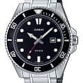 Японские мужские кварцевые часы с минеральным стекломМинеральное стеклоМинеральное стекло представляет собой искусственно выращенный минерал кварца. Такое стекло отличается особой устойчивостью к повреждениям и царапинам. Уступает по некоторым качествам сапфировому стеклу. Casio Collection MDV-107D-1A1, кварцевый механизм с высокой точностью. Корпус часов изготовлен из нержавеющей стали. Вращающийся безельБезельВнешний ободок, закрепляющий стекло. В спортивных часах так называется поворотное кольцо с делениями на циферблате, выполняет роль таймера – замеряет отрезки времени на шкале. Неподвижный безель – элемент декора. Однонаправленно вращающийся безель на дайверских часах позволяет фиксировать моменты погружения и выныривания на поверхность. из нержавеющей стали с IP-покрытиемIP-покрытиеМетод ионного напыления. Демонстрирует повышенную устойчивость к истиранию, окислению и химическим веществам. Под воздействием высокого давления и температуры около 1500°C молекулы металла надёжно соединяются с частицами корпуса часов.. Подсветка NeobriteПодсветка NeobriteИспользование светонакопительных составов на основе сульфида цинка или алюмината стронция, яркий свет можно наблюдать на протяжении 6-10 часов после «зарядки» часов около источника света. обеспечивает длительное послесвечение в темноте даже после кратковременного нахождения на свету. Окошко даты находится в положении 3 часа. Класс водозащиты: 200 метров, позволит плавать, нырять и заниматься другими водными видами спорта. Стальной браслет на раскладной застёжкеРаскладная застёжкаТакой тип застёжки используется только на браслетах из металла. Она никогда не раскрывается полностью, происходит разделение на 2 и более частей. Раскладывающая застёжка снизит вероятность потери часов к минимуму..