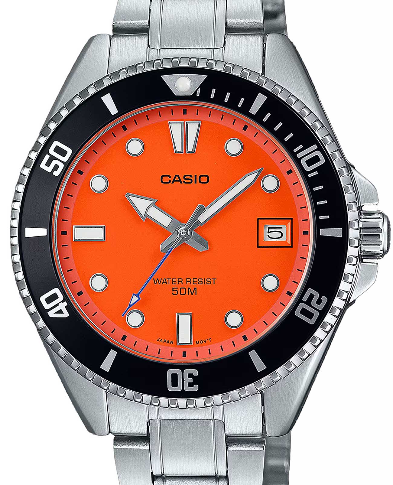 Японские мужские кварцевые часы с минеральным стекломМинеральное стеклоМинеральное стекло представляет собой искусственно выращенный минерал кварца. Такое стекло отличается особой устойчивостью к повреждениям и царапинам. Уступает по некоторым качествам сапфировому стеклу. Casio Collection MDV-10D-4A1V, кварцевый механизм с высокой точностью. Корпус и браслет часов изготовлены из нержавеющей стали. Вращающийся безельБезельВнешний ободок, закрепляющий стекло. В спортивных часах так называется поворотное кольцо с делениями на циферблате, выполняет роль таймера – замеряет отрезки времени на шкале. Неподвижный безель – элемент декора. Однонаправленно вращающийся безель на дайверских часах позволяет фиксировать моменты погружения и выныривания на поверхность. из нержавеющей стали с IP-покрытиемIP-покрытиеМетод ионного напыления. Демонстрирует повышенную устойчивость к истиранию, окислению и химическим веществам. Под воздействием высокого давления и температуры около 1500°C молекулы металла надёжно соединяются с частицами корпуса часов.. Стрелки и метки с люминесцентным покрытиемЛюминесцентное покрытиеПозволяет считывать показания времени в темноте. Производители наносят на стрелки, часовые индексы, безель или поверхность циферблата светонакопительный состав, дающий холодное свечение.. Окошко даты находится в положении 3 часа. Класс водозащиты: 50 метров, позволит защитить корпус от случайных брызг или капель дождя.