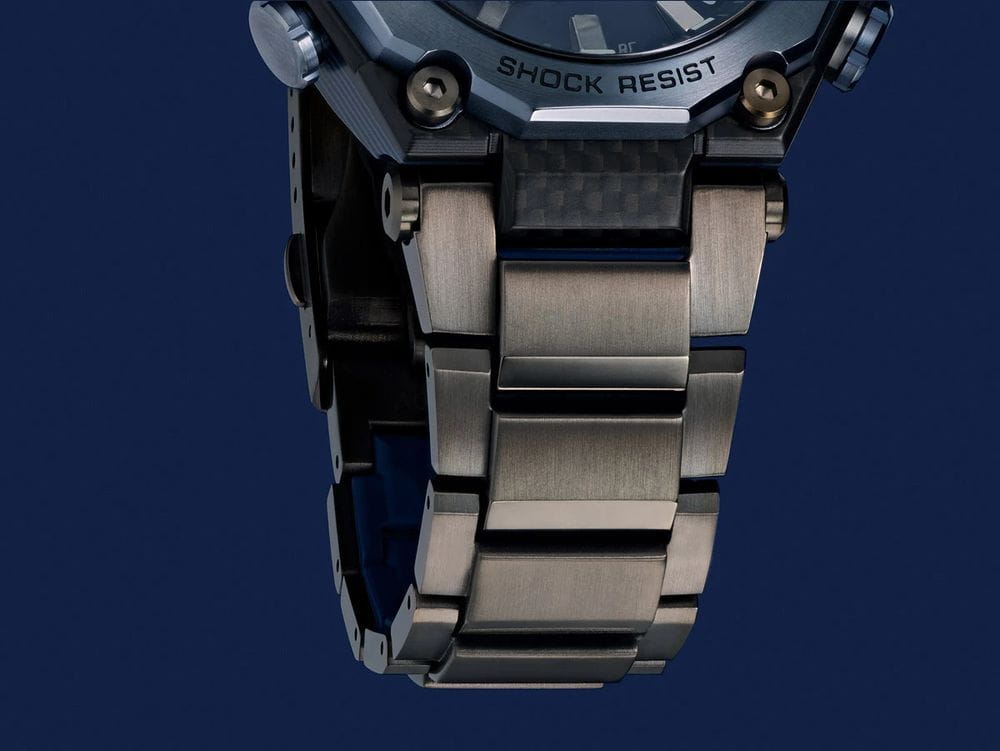 Модель Casio G-Shock MTG-B2000YBD-2A из премиальной серии MT-G сочетает в себе передовые технологии и элегантный дизайн.  Корпус диаметром 55,1 мм выполнен из углеродного соединения с двойной защитной структурой Dual Core Guard, обеспечивая высокую прочность и лёгкость конструкции. Браслет представляет собой комбинацию нержавеющей стали и тонкого синего слоя смолы, обеспечивая комфорт при носке.