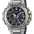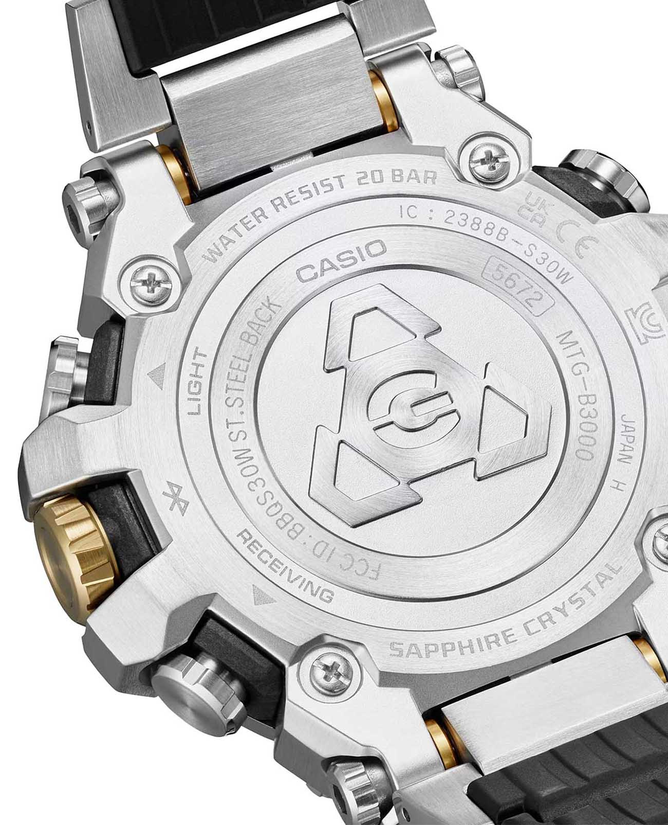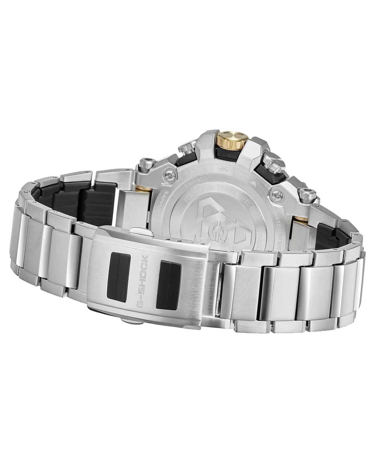 Спортивные японские мужские часы с секундомеромСекундомерСекундоме́р — прибор, способный измерять интервалы времени с точностью до долей секунды. и хронографомХронографФункция позволяет измерять отрезки времени с особой точностью: часы, минуты, секунды. Верным признаком хронографа является наличие на циферблате 3 дополнительных окошек-счётчиков. Casio G-Shock MTG-B3000D-1A9ER, кварцевый механизм с высокой точностью. Питание от солнечной энергии Tough Solar - солнечные батарейки большой мощности, индикатор заряда батареи. Функция автоматического сохранения энергии. Время работы аккумулятора без подзарядки приблизительно 5 месяцев, при включенной функции сохранения энергии приблизительно 18 месяцев. Ударопрочный корпусУдаропрочный корпусМеханизм заключён в корпус, выполненный из современных материалов, устойчивых к ударам, механическим повреждениям и падению с высоты: инновационный пластик, карбон, нержавеющая сталь, титан. защищает механизм от ударов и вибрации. . СекундомерСекундомерСекундоме́р — прибор, способный измерять интервалы времени с точностью до долей секунды. с точностью показаний 1с и временем измерения 24ч. Мировое времяМировое время Полезное часовое усложнение, отображающее время в основных городах и известных областях по всему миру, оно связано с часовыми поясами, удобно для путешественников и бизнесменов. – 27 часовых поясов. Автоматический переход на зимнее и летнее время, возможность включения/отключения данной функции. Переключение между домашним и мировым временем. Беспроводная технология BluetoothBluetoothСовременная технология, позволяющая синхронизировать часы с телефоном и переносить данные. Часы с Bluetooth расширяют возможности вашего смартфона и делают его использование ещё более удобным. со сверхнизким потреблением энергии для синхронизации со смартфоном. При подключении к смартфону часы корректируют текущее время, настройки мирового времени (300 городов), таймера и будильника. Функция поиска телефона. Автоматическое подключение к серверу времени через смартфон для корректировки текущего и настроек мирового времени. Функции перемещения стрелок для беспрепятственного просмотра информации на дисплее, отключения/включения звука, поиска телефона. Задняя крышка и ушки крепятся на винтах. Класс водозащиты: 200 метров, позволит плавать, нырять и заниматься другими водными видами спорта. Стальной браслет с пластиковыми вставками на раскладной застёжкеРаскладная застёжкаТакой тип застёжки используется только на браслетах из металла. Она никогда не раскрывается полностью, происходит разделение на 2 и более частей. Раскладывающая застёжка снизит вероятность потери часов к минимуму..