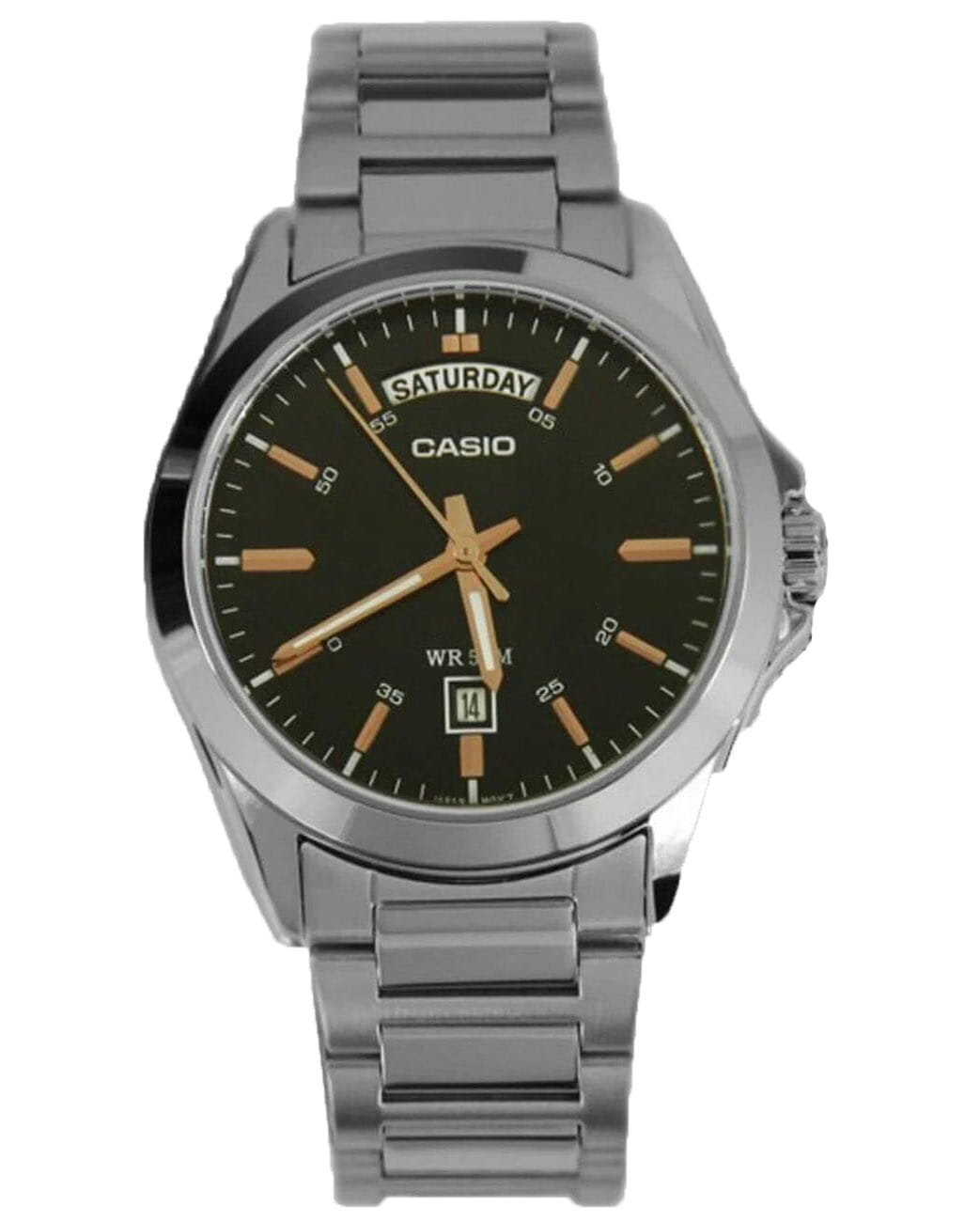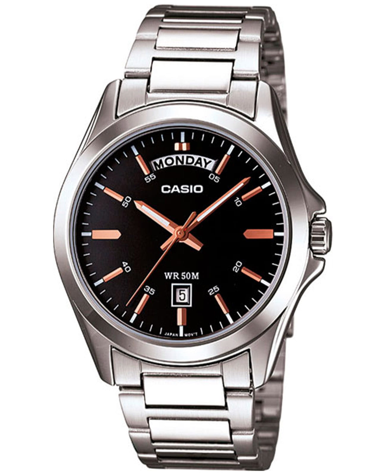 Японские мужские наручные часы с минеральным стекломМинеральное стеклоМинеральное стекло представляет собой искусственно выращенный минерал кварца. Такое стекло отличается особой устойчивостью к повреждениям и царапинам. Уступает по некоторым качествам сапфировому стеклу. Casio MTP-1370D-1A2, кварцевый механизм с высокой точностью. Класс водозащиты: 50 метров, позволит защитить корпус от случайных брызг или капель дождя. Корпус часов изготовлен из латуни. Стальной браслет на раскладной застёжке. Окошко даты находится в положении 6 часов. Заводная головка с защитой. Стрелки с люминесцентным покрытиемЛюминесцентное покрытиеПозволяет считывать показания времени в темноте. Производители наносят на стрелки, часовые индексы, безель или поверхность циферблата светонакопительный состав, дающий холодное свечение..