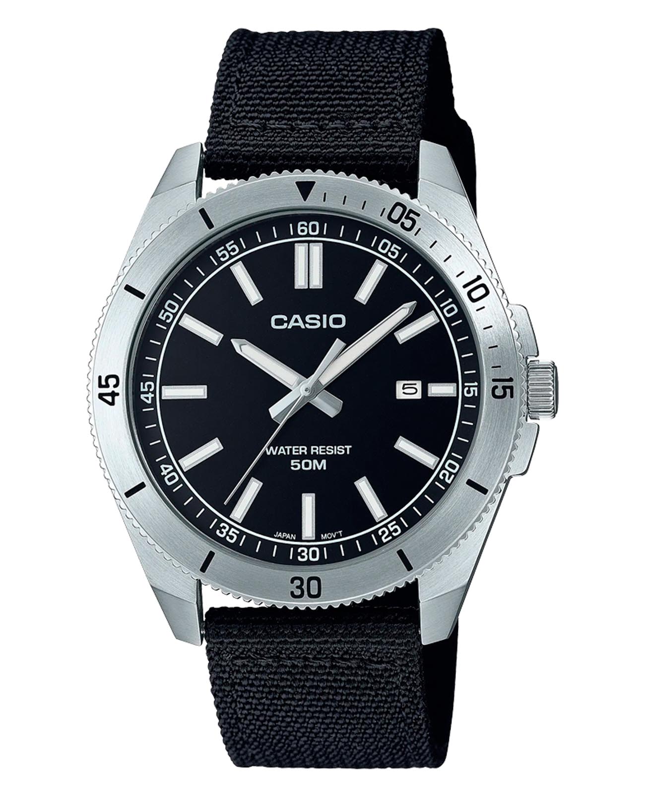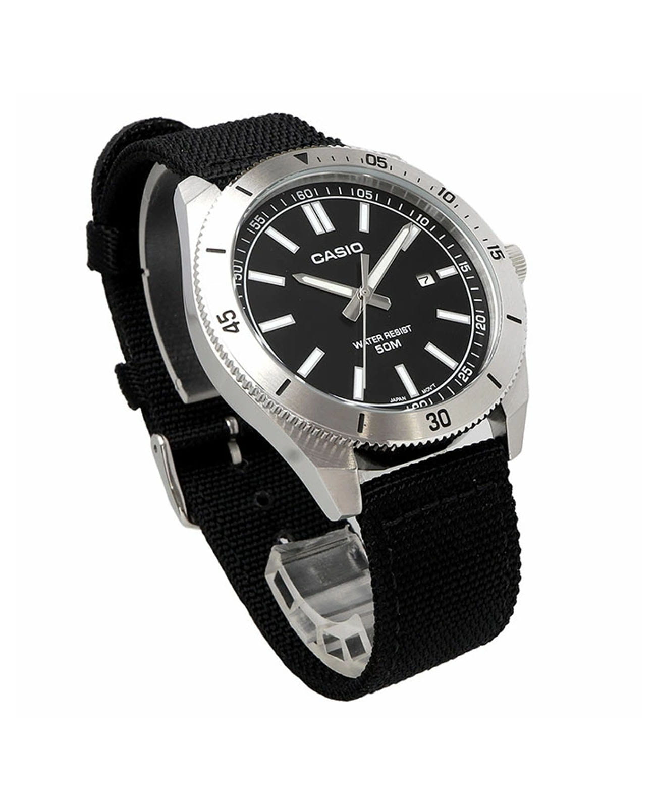 Спортивные японские мужские часы Casio Collection MTP-B155C-1EV с минеральным стекломМинеральное стеклоМинеральное стекло представляет собой искусственно выращенный минерал кварца. Такое стекло отличается особой устойчивостью к повреждениям и царапинам. Уступает по некоторым качествам сапфировому стеклу., устойчивым к мелким механическим повреждениям. Корпус часов изготовлен из нержавеющей стали. Вращающийся стальной безельБезельВнешний ободок, закрепляющий стекло. В спортивных часах так называется поворотное кольцо с делениями на циферблате, выполняет роль таймера – замеряет отрезки времени на шкале. Неподвижный безель – элемент декора. Однонаправленно вращающийся безель на дайверских часах позволяет фиксировать моменты погружения и выныривания на поверхность.. Стрелки и метки с люминесцентным покрытиемЛюминесцентное покрытиеПозволяет считывать показания времени в темноте. Производители наносят на стрелки, часовые индексы, безель или поверхность циферблата светонакопительный состав, дающий холодное свечение.. Задняя крышка с винтовым фиксатором. Батарейка рассчитана на 3 года. Окошко даты в положении 3 часа. Класс водозащиты: 50 метров, позволит защитить корпус от случайных брызг или капель дождя. Тканевый ремешок на стандартной застежке.