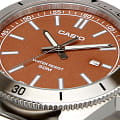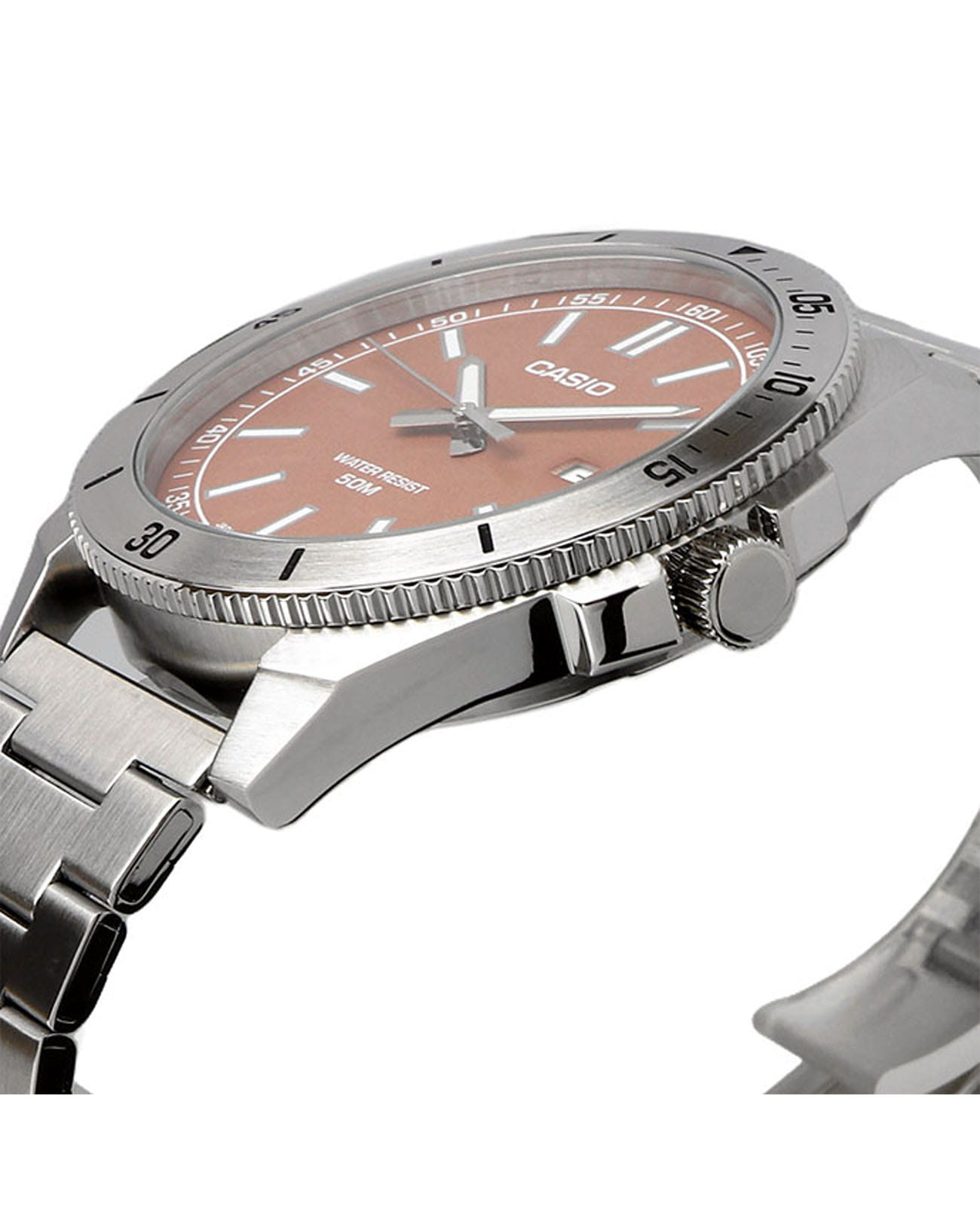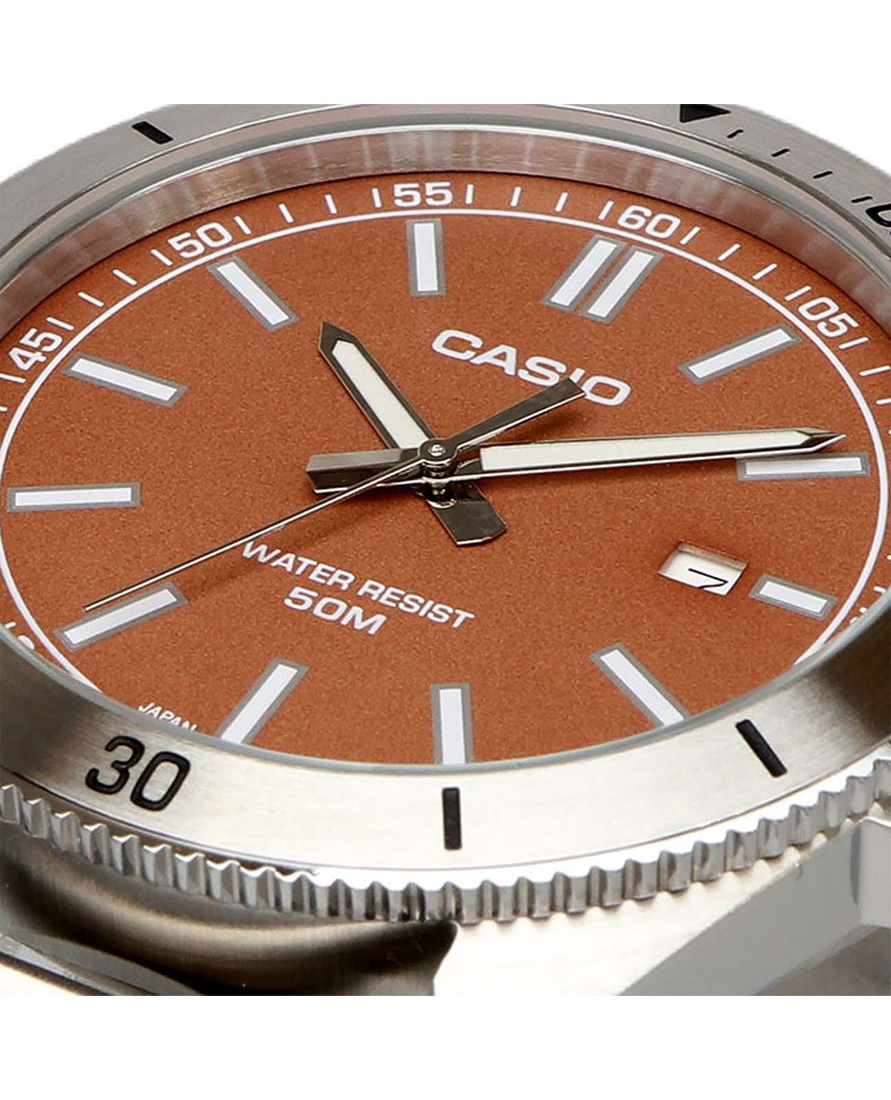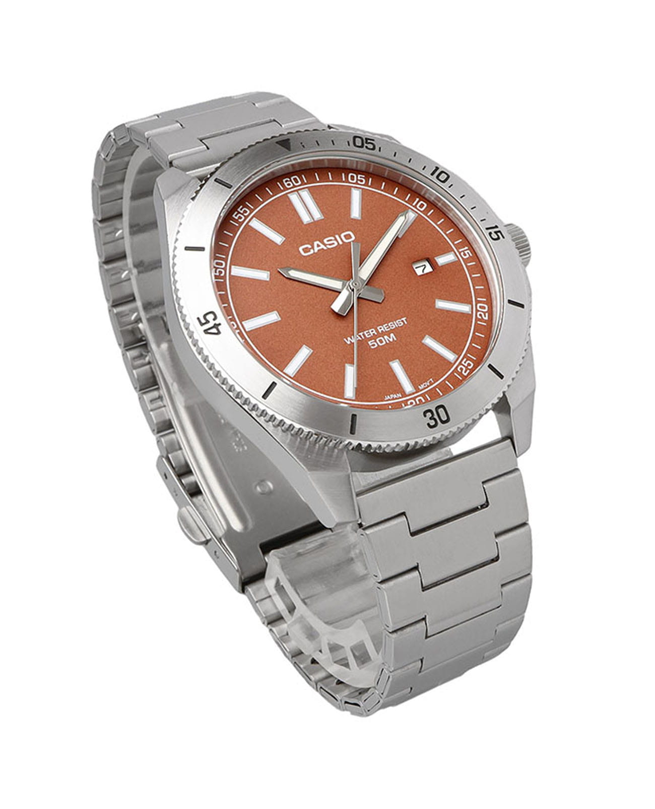 Спортивные японские мужские часы Casio Collection MTP-B155D-5EV с минеральным стекломМинеральное стеклоМинеральное стекло представляет собой искусственно выращенный минерал кварца. Такое стекло отличается особой устойчивостью к повреждениям и царапинам. Уступает по некоторым качествам сапфировому стеклу., устойчивым к мелким механическим повреждениям. Корпус часов изготовлен из нержавеющей стали. Вращающийся стальной безельБезельВнешний ободок, закрепляющий стекло. В спортивных часах так называется поворотное кольцо с делениями на циферблате, выполняет роль таймера – замеряет отрезки времени на шкале. Неподвижный безель – элемент декора. Однонаправленно вращающийся безель на дайверских часах позволяет фиксировать моменты погружения и выныривания на поверхность.. Стрелки и метки с люминесцентным покрытиемЛюминесцентное покрытиеПозволяет считывать показания времени в темноте. Производители наносят на стрелки, часовые индексы, безель или поверхность циферблата светонакопительный состав, дающий холодное свечение.. Задняя крышка с винтовым фиксатором. Батарейка рассчитана на 3 года. Окошко даты в положении 3 часа. Класс водозащиты: 50 метров, позволит защитить корпус от случайных брызг или капель дождя. Стальной браслет на раскладной застёжкеРаскладная застёжкаТакой тип застёжки используется только на браслетах из металла. Она никогда не раскрывается полностью, происходит разделение на 2 и более частей. Раскладывающая застёжка снизит вероятность потери часов к минимуму..