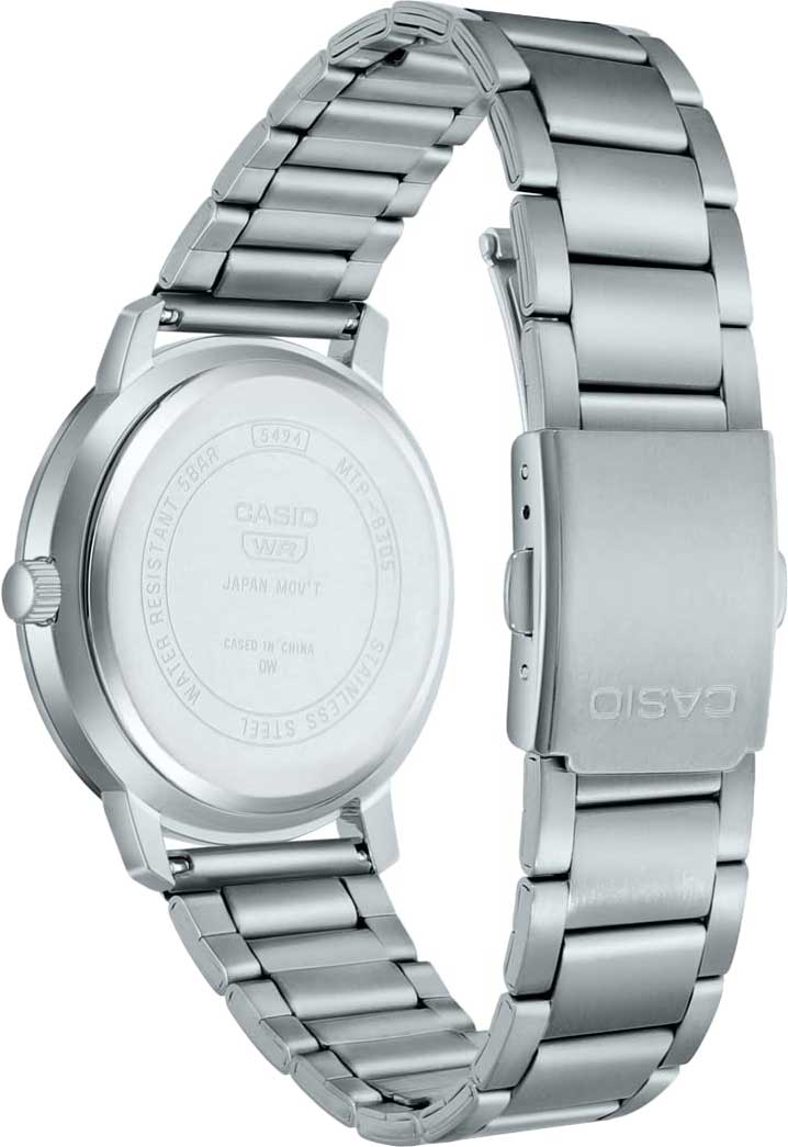 Японские мужские наручные часы Casio Collection MTP-B305D-1E с минеральным стекломМинеральное стеклоМинеральное стекло представляет собой искусственно выращенный минерал кварца. Такое стекло отличается особой устойчивостью к повреждениям и царапинам. Уступает по некоторым качествам сапфировому стеклу., кварцевый механизм с высокой точностью. Класс водозащиты: 50 метров, позволит защитить корпус от случайных брызг или капель дождя. Корпус часов изготовлен из стали, серебристого цвета. Браслет с раскладной застёжкойРаскладная застёжкаТакой тип застёжки используется только на браслетах из металла. Она никогда не раскрывается полностью, происходит разделение на 2 и более частей. Раскладывающая застёжка снизит вероятность потери часов к минимуму.. 12-ти и 24-х часовой формат времени, число и день недели вынесены на отдельные циферблаты. Метки в виде штрихов и двух римских цифр. Батарея рассчитана на 2 года.