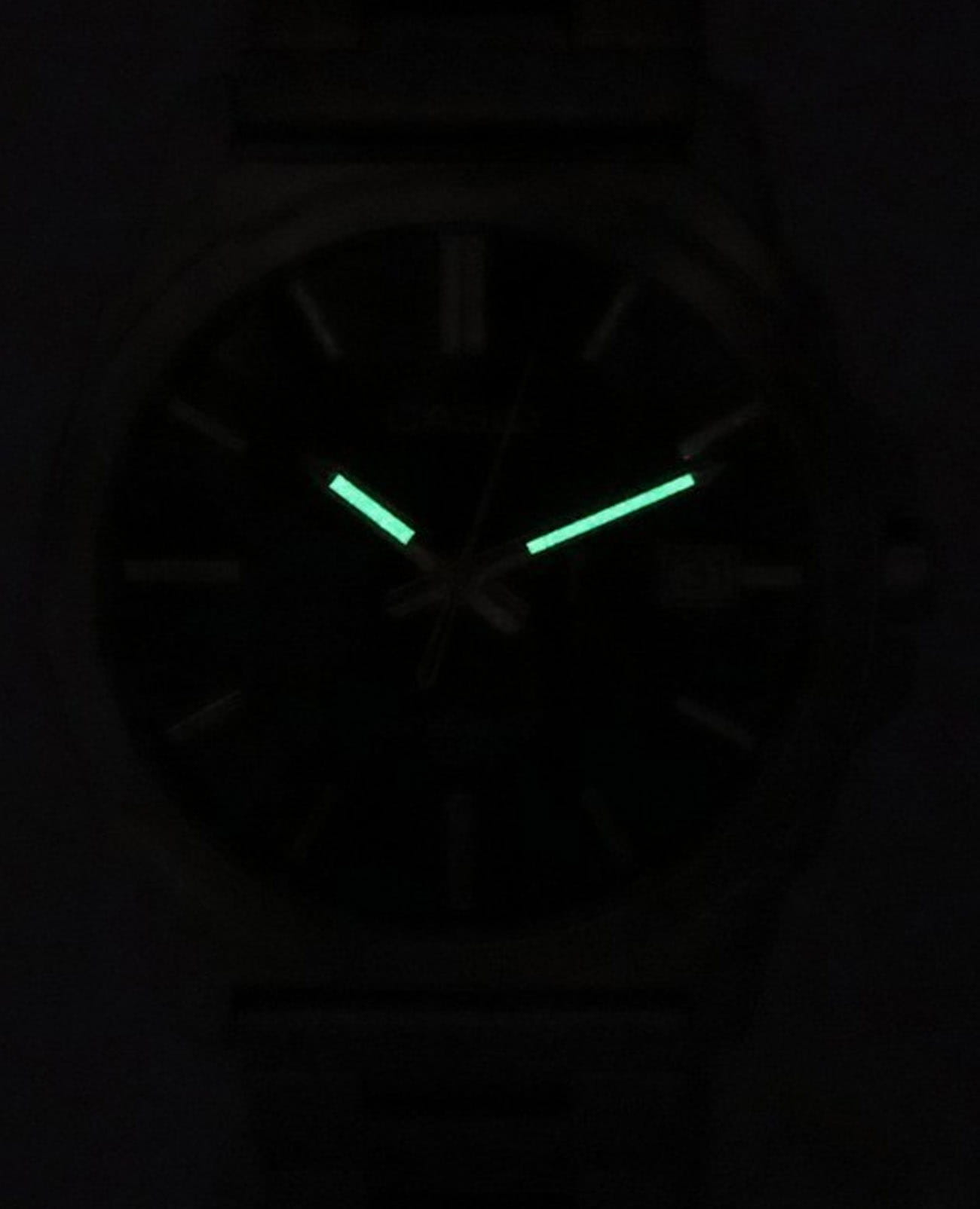 Японские мужские часы с минеральным стекломМинеральное стеклоМинеральное стекло представляет собой искусственно выращенный минерал кварца. Такое стекло отличается особой устойчивостью к повреждениям и царапинам. Уступает по некоторым качествам сапфировому стеклу. Casio Collection MTP-E720D-1A, кварцевый механизм с высокой точностью. Корпус часов изготовлен из стали. Стрелки с люминесцентным покрытиемЛюминесцентное покрытиеПозволяет считывать показания времени в темноте. Производители наносят на стрелки, часовые индексы, безель или поверхность циферблата светонакопительный состав, дающий холодное свечение.. Метки в виде штрихов. Окошко даты находится в положении 3 часа. Заводная головка с защитой. Класс водозащиты: 50 метров, позволит защитить корпус от случайных брызг или капель дождя. Стальной браслет на раскладной застёжкеРаскладная застёжкаТакой тип застёжки используется только на браслетах из металла. Она никогда не раскрывается полностью, происходит разделение на 2 и более частей. Раскладывающая застёжка снизит вероятность потери часов к минимуму..