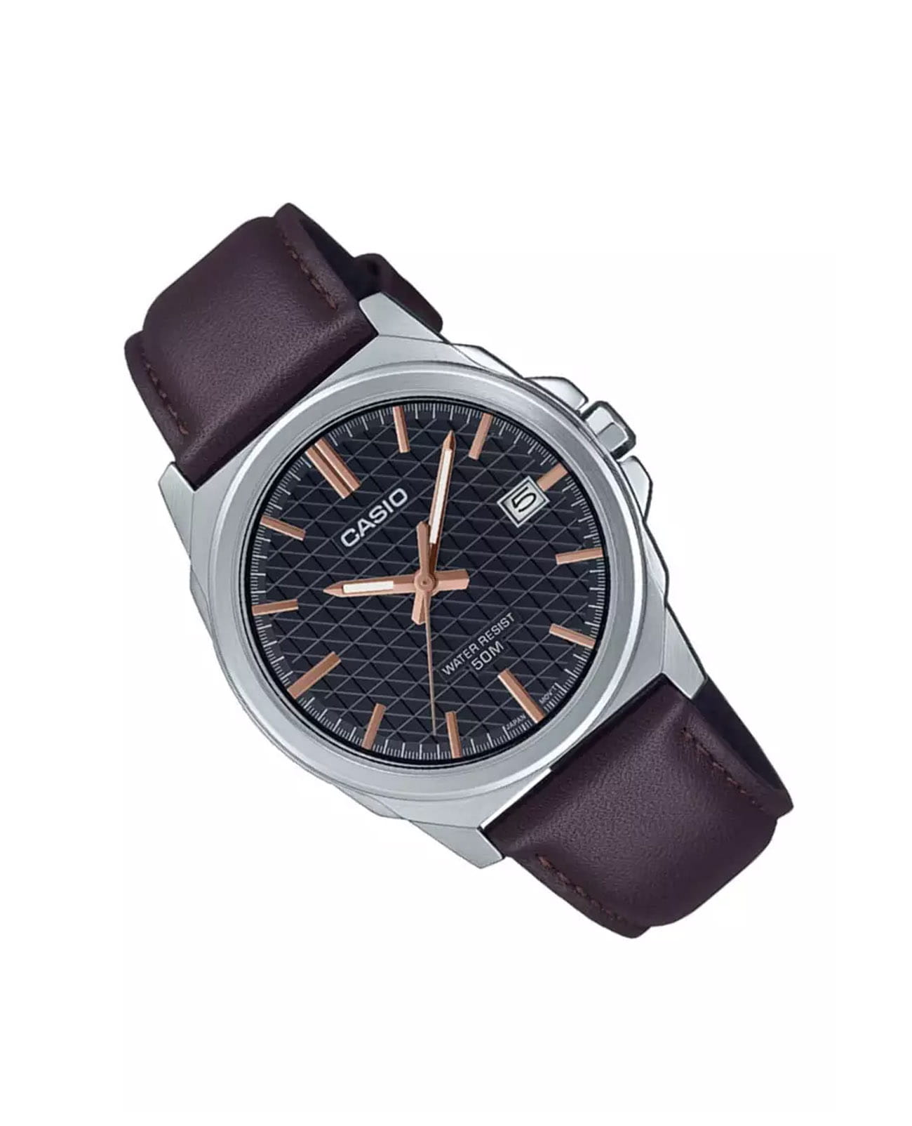 Японские мужские часы с минеральным стекломМинеральное стеклоМинеральное стекло представляет собой искусственно выращенный минерал кварца. Такое стекло отличается особой устойчивостью к повреждениям и царапинам. Уступает по некоторым качествам сапфировому стеклу. Casio Collection MTP-E720L-5A, кварцевый механизм с высокой точностью. Корпус часов изготовлен из стали. Стрелки с люминесцентным покрытиемЛюминесцентное покрытиеПозволяет считывать показания времени в темноте. Производители наносят на стрелки, часовые индексы, безель или поверхность циферблата светонакопительный состав, дающий холодное свечение.. Метки в виде штрихов. Окошко даты находится в положении 3 часа. Батарея рассчитана на 3 года. Заводная головка с защитой. Класс водозащиты: 50 метров, позволит защитить корпус от случайных брызг или капель дождя. Кожаный ремешок на стандартной застёжке.
