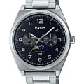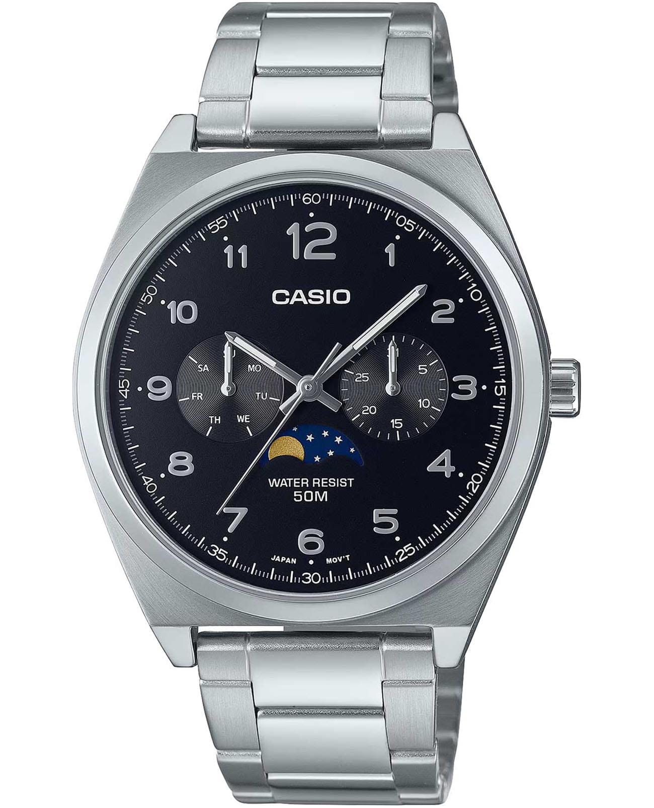 Японские мужские часы Casio Classic MTP-M300D-1A с минеральным стекломМинеральное стеклоМинеральное стекло представляет собой искусственно выращенный минерал кварца. Такое стекло отличается особой устойчивостью к повреждениям и царапинам. Уступает по некоторым качествам сапфировому стеклу., устойчивым к мелким механическим повреждениям. Корпус часов изготовлен из нержавеющей стали. Стрелки с люминесцентным покрытиемЛюминесцентное покрытиеПозволяет считывать показания времени в темноте. Производители наносят на стрелки, часовые индексы, безель или поверхность циферблата светонакопительный состав, дающий холодное свечение.. Класс водозащиты: 50 метров, позволит защитить корпус от случайных брызг или капель дождя. Особенностью модели является наличие индикатора фазы луны над шестью часами по циферблату. Индикатор имеет 4 положения и отображается новолуние и полнолуние, а также растущую и убывающую Луну. Стальной браслет на раскладной застёжкеРаскладная застёжкаТакой тип застёжки используется только на браслетах из металла. Она никогда не раскрывается полностью, происходит разделение на 2 и более частей. Раскладывающая застёжка снизит вероятность потери часов к минимуму..