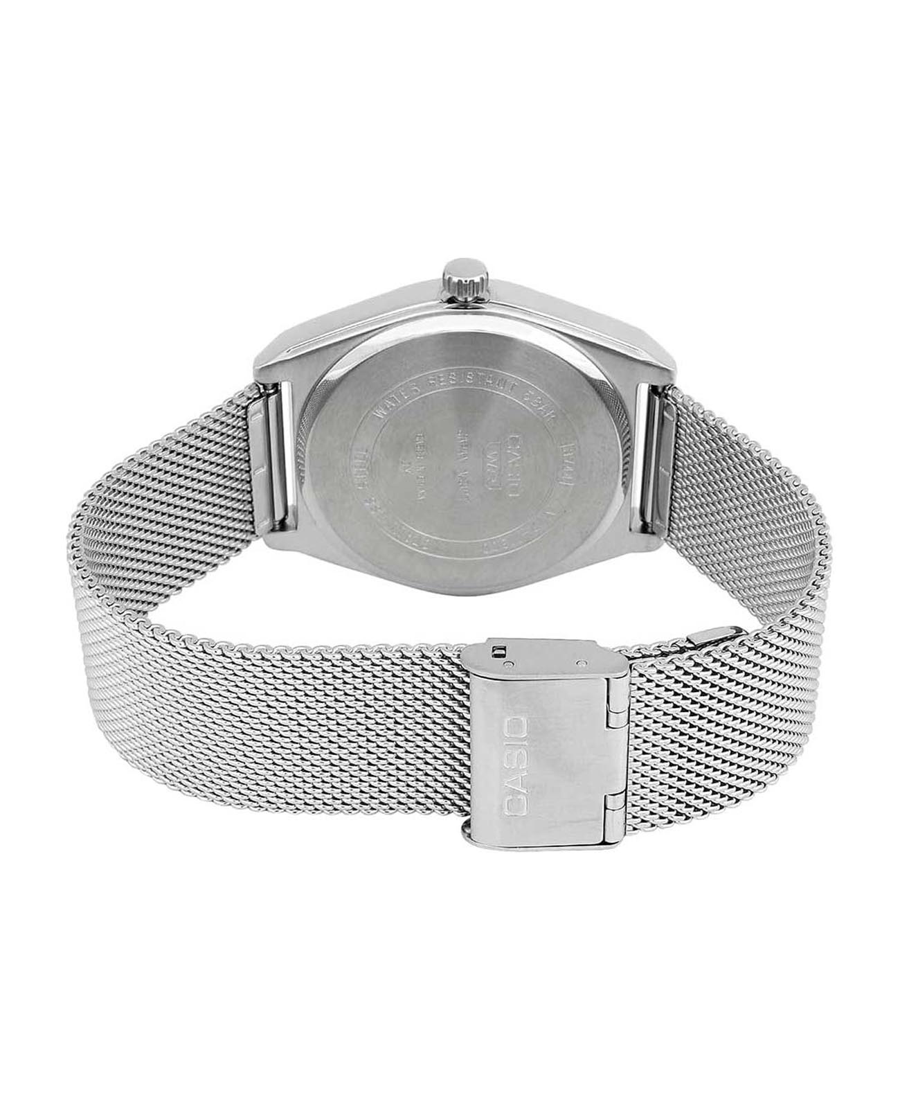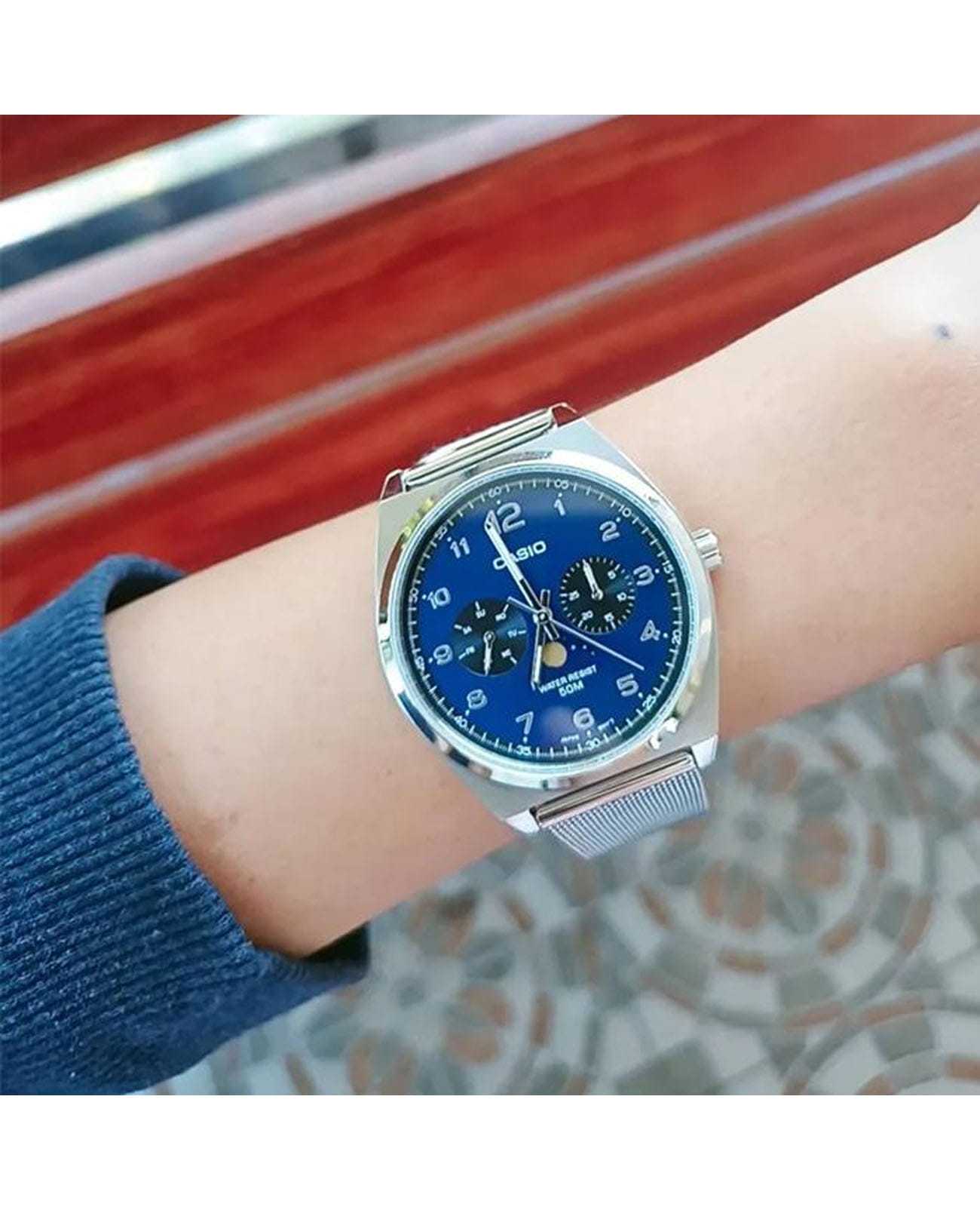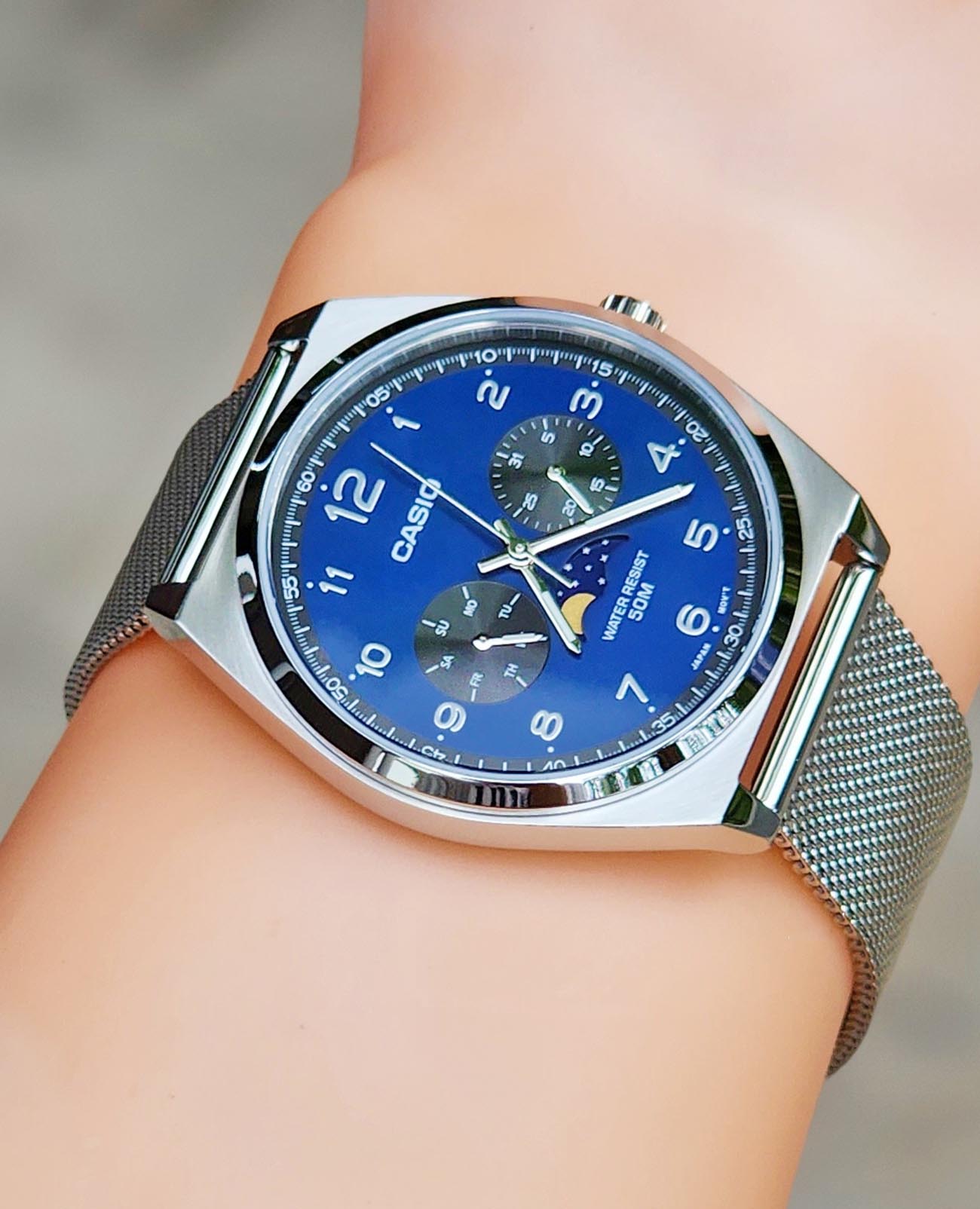 Японские мужские кварцевые часы с минеральным стекломМинеральное стеклоМинеральное стекло представляет собой искусственно выращенный минерал кварца. Такое стекло отличается особой устойчивостью к повреждениям и царапинам. Уступает по некоторым качествам сапфировому стеклу. Casio Collection MTP-M300M-2A, кварцевый механизм с высокой точностью. Корпус часов изготовлен из нержавеющей стали. Циферблат с метками в виде штрихов. Стрелки с люминесцентным покрытиемЛюминесцентное покрытиеПозволяет считывать показания времени в темноте. Производители наносят на стрелки, часовые индексы, безель или поверхность циферблата светонакопительный состав, дающий холодное свечение.. Особенностью модели является наличие индикатора фазы луны над шестью часами по циферблату. Индикатор имеет 4 положения и отображается новолуние и полнолуние, а также растущую и убывающую Луну. Батарейка рассчитана на 3 года. Класс водозащиты: 50 метров, позволит защитить корпус от случайных брызг или капель дождя. Стальной браслет миланского плетения на раскладном замкеРаскладной замокДанный вариант застежки используется только на часах с металлическим браслетом. Отличительная особенность такого крепления в том, что длина браслета становится универсальной и вы можете самостоятельно отрегулировать нужный вам размер – застежка просто двигается по браслету часов..