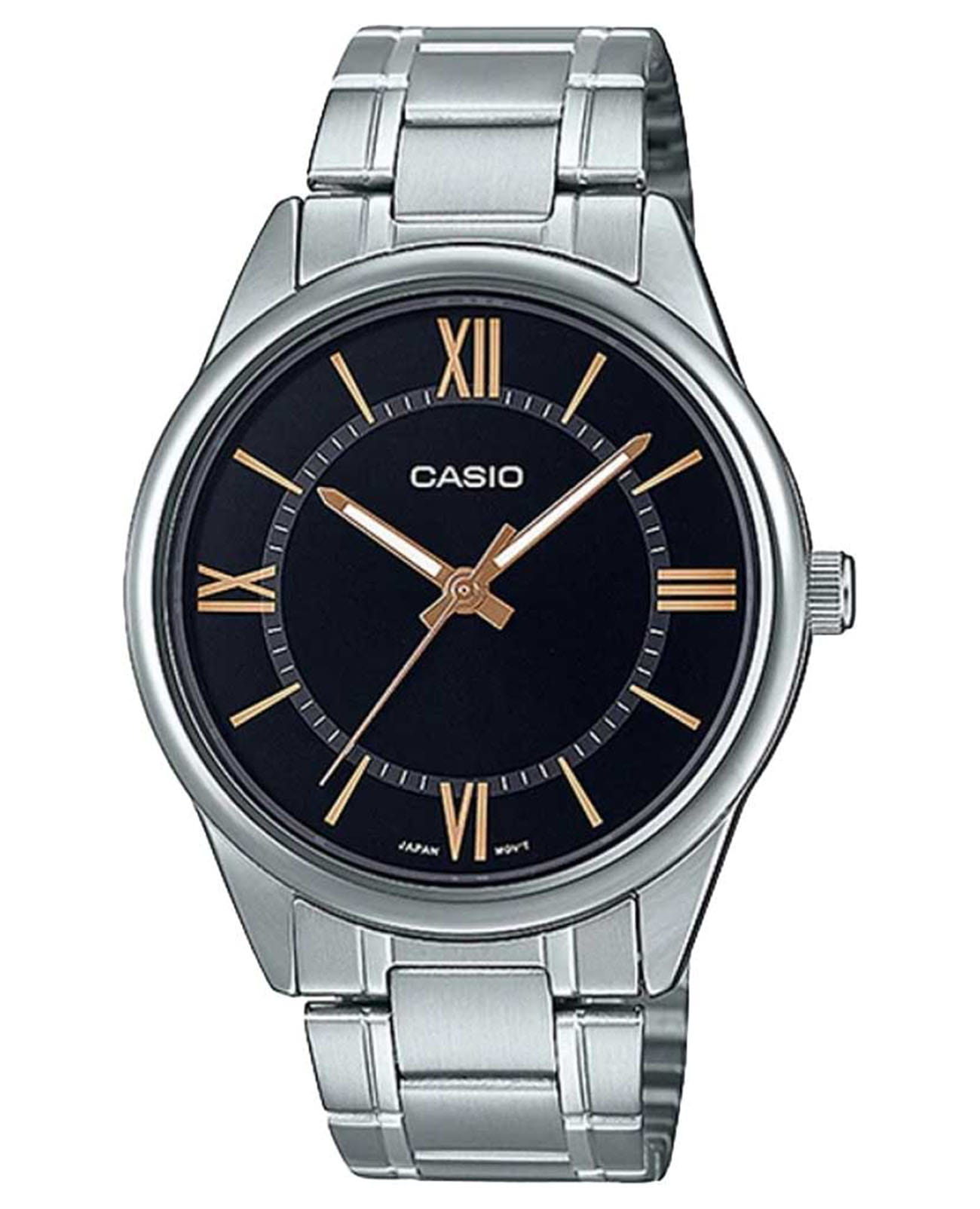 Японские мужские наручные часы с минеральным стекломМинеральное стеклоМинеральное стекло представляет собой искусственно выращенный минерал кварца. Такое стекло отличается особой устойчивостью к повреждениям и царапинам. Уступает по некоторым качествам сапфировому стеклу. Casio Collection MTP-V005D-1B5, кварцевый механизм с высокой точностью. Корпус часов изготовлен из нержавеющей стали. Стрелки с люминесцентной подсветкойЛюминесцентное покрытиеПозволяет считывать показания времени в темноте. Производители наносят на стрелки, часовые индексы, безель или поверхность циферблата светонакопительный состав, дающий холодное свечение.. Класс водозащиты: 30 метров, позволит защитить корпус от случайных брызг или капель дождя. Стальной браслет на раскладной застёжкеРаскладная застёжкаТакой тип застёжки используется только на браслетах из металла. Она никогда не раскрывается полностью, происходит разделение на 2 и более частей. Раскладывающая застёжка снизит вероятность потери часов к минимуму..