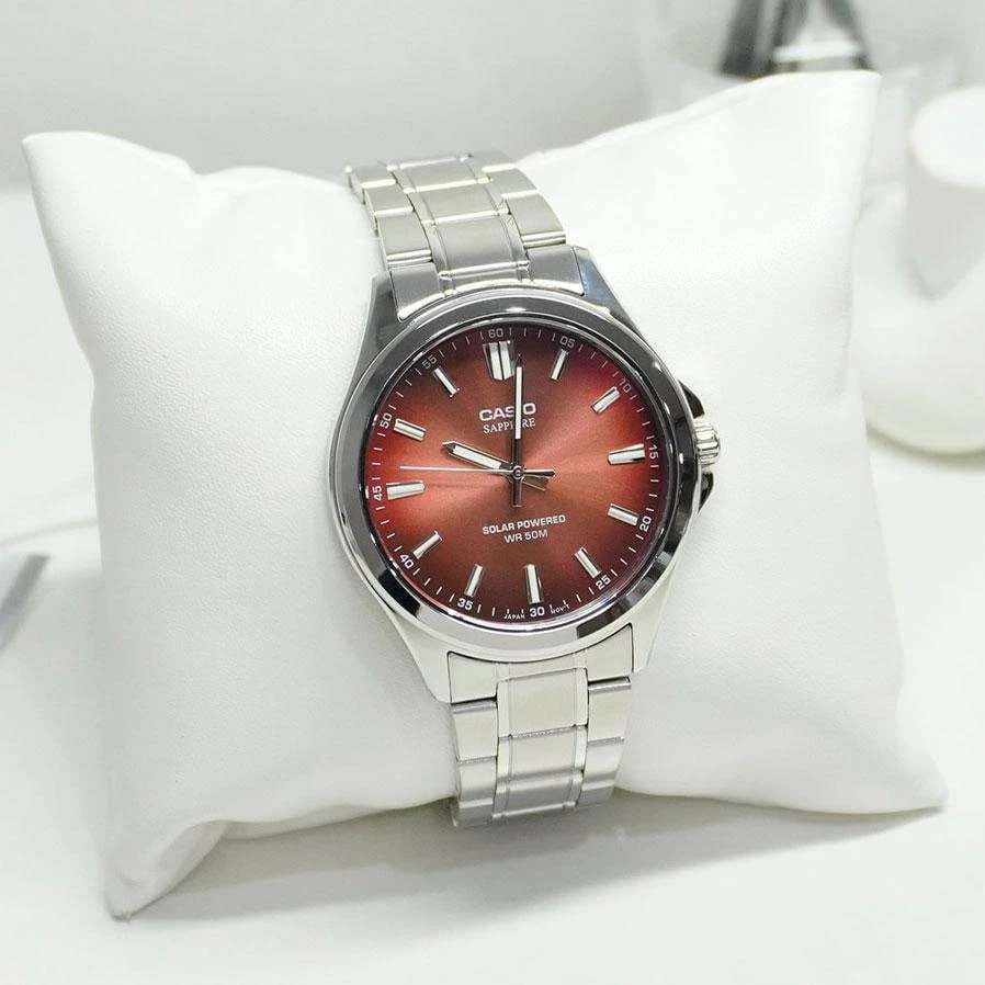 Мужские кварцевые часы Casio Collection — это современный и практичный аксессуар с питанием от солнечной энергии. Корпус размером 41,7 мм и толщиной 9,5 мм выполнен из нержавеющей стали. Циферблат красного цвета оформлен штрихами и стрелками. Циферблат защищён сапфировым стекломСапфировое стеклоПрочный и надёжный материал из кристалла сапфира синтетического происхождения, характеризующийся особой твёрдостью и устойчивостью к царапинам и повреждениям. с антибликовым покрытиемАнтибликовое покрытиеСлой оксида металла в 0,13-0,3 микрон, благодаря которому стекло часов не бликует и не отражает свет. Антибликовое покрытие уменьшает отражение света в 10 раз, обеспечивая отличную читаемость показателей циферблата.. Механизм — японский кварцевый калибр Miyota с центральной секундной стрелкой. Часы оснащены стальным браслетом из нержавеющей стали на раскладной застёжкеРаскладная застёжкаТакой тип застёжки используется только на браслетах из металла. Она никогда не раскрывается полностью, происходит разделение на 2 и более частей. Раскладывающая застёжка снизит вероятность потери часов к минимуму.. Заводная головка с защитой повышает надёжность. Водонепроницаемость 50 м позволяет использовать часы при мытье рук или в дождь. Идеальный выбор для тех, кто ценит японское качество и универсальный дизайн.