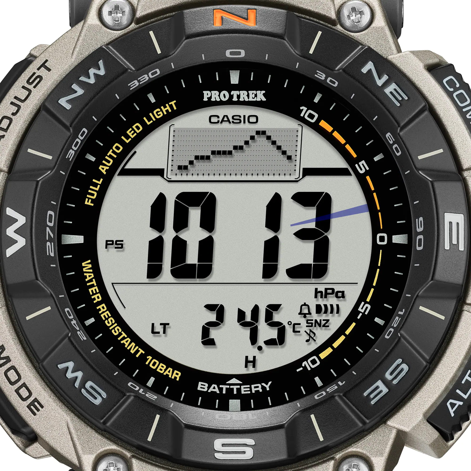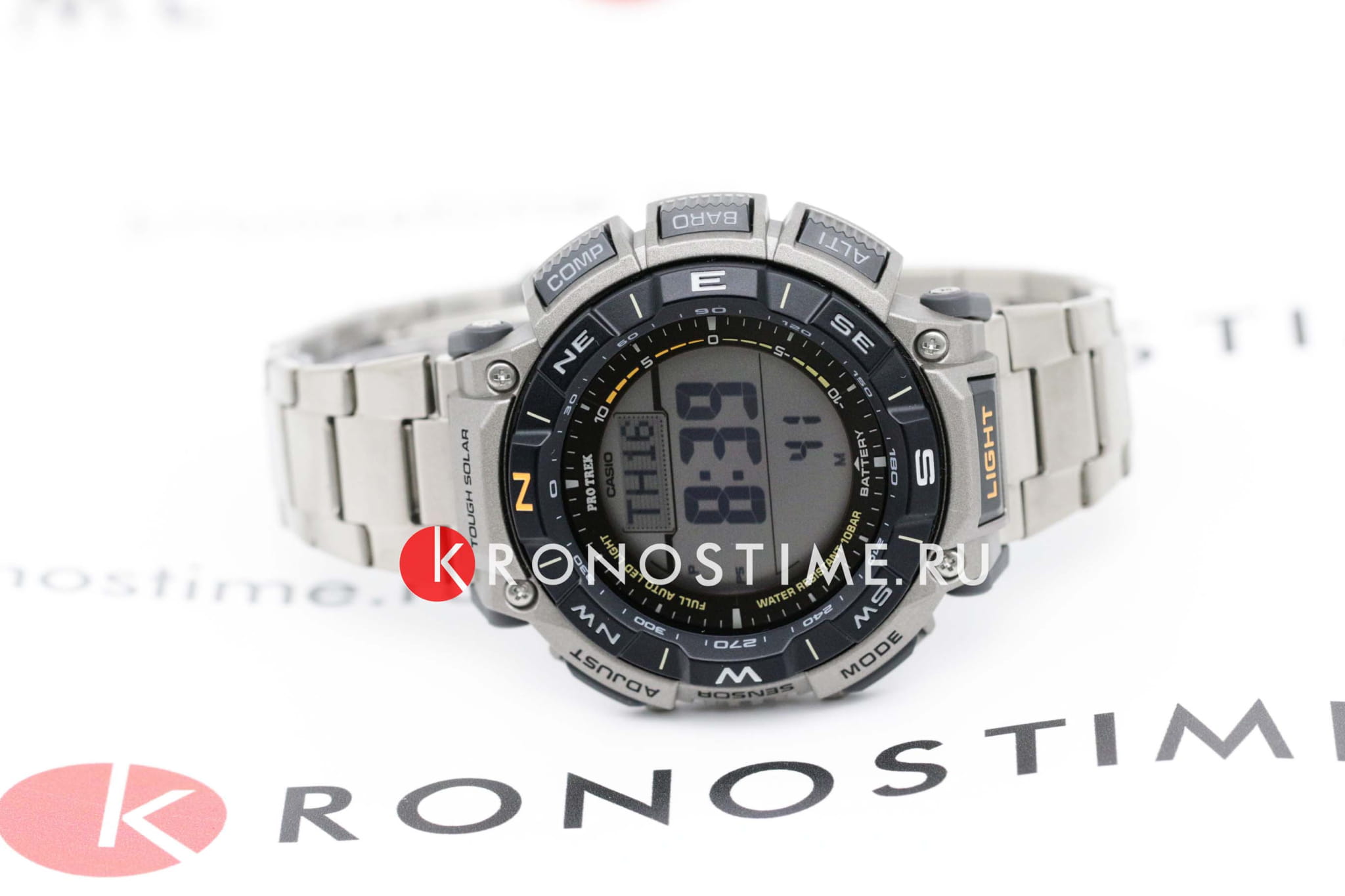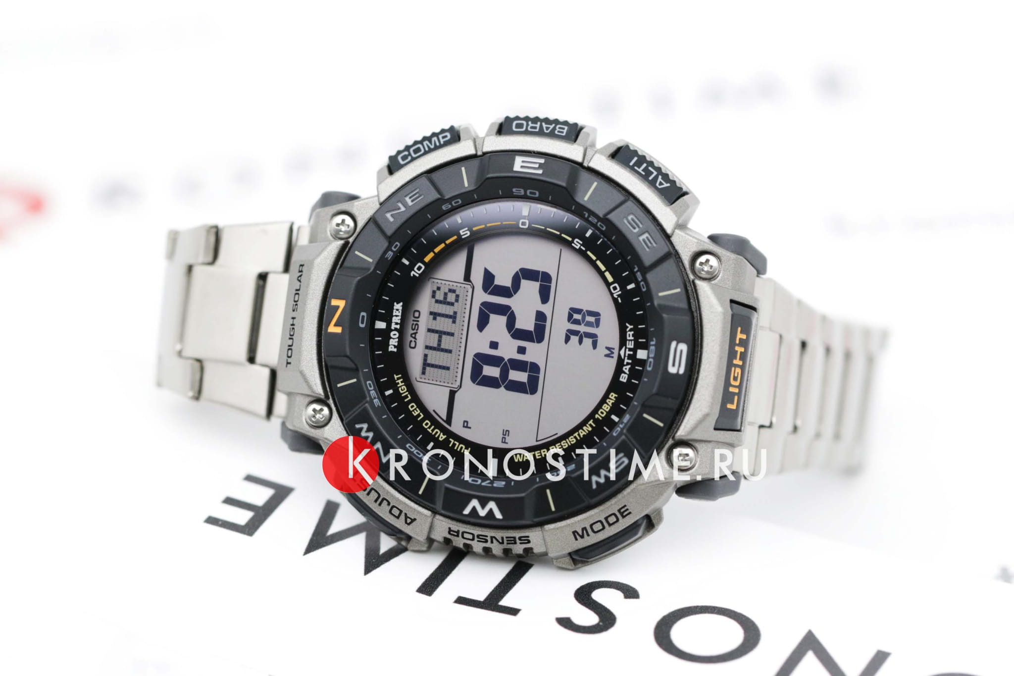 Мужские японские часы на солнечной батарее Casio Pro Trek PRG-340T-7E, электронный механизм с высокой точностью. Класс водозащиты: 100 метров, позволит плавать, нырять и заниматься другими водными видами спорта. Корпус часов изготовлен из пластика. Модель в серии Pro Trek создана из экологически чистых материалов. Питание от солнечной энергии Tough SolarTough SolarТехнология основана на подзарядке аккумулятора от источника солнечного света, специальная панель улавливает солнечные лучи и преобразует их в энергию для работы часов. Достаточно пары минут нахождения на солнце для функционирования часов в течении суток. - солнечные батарейки большой мощности, индикатор заряда батареи. Функция автоматического сохранения энергии. Модуль часов рассчитан на работу при низких температурах до -10°С. Циферблат с светодиодной подсветкойСветодиодная подсветкаСветодиодная или LED-подсветка обеспечивает появление яркого холодного свечения за счёт LED-элементов - маленьких лампочек. Они потребляют минимальное количество энергии, чаще всего можно встретить 1 светодиод, в нижней части циферблата.. Цвет подсветки: белый. 12-ти и 24-х часовой формат времени. СекундомерСекундомерСекундоме́р — прибор, способный измерять интервалы времени с точностью до долей секунды. с двумя точностью показаний. Сплит-хронографСплит-хронографИспользуется для измерения продолжительности нескольких временных отрезков, начинающихся одновременно, а заканчивающихся в разное время.. ТаймерТаймерОтсчитывает секунды в обратном направлении в заданном интервале времени. обратного отсчета от 1с до 24ч. Мировое времяМировое время Полезное часовое усложнение, отображающее время в основных городах и известных областях по всему миру, оно связано с часовыми поясами, удобно для путешественников и бизнесменов. – 48 городов (31 часовой пояс). Функция включения/отключения летнего времени. Технология Triple Sensor позволяет точно и легко определять сторону света, температуру и атмосферное давление. Термометр. Барометр - измерение атмосферного давления. График тенденции и перепада атмосферного давления. Встроенный цифровой компас измеряет и отображает направление в виде одной из 16 точек. Графический указатель направления. Двунаправленная калибровка. Коррекция магнитного склонения. Высотомер - встроенный датчик барометрического давления с возможностью вывода результатов в единицах высоты над уровнем моря. График набора высоты. Хранение до 30 записей о высотных точках рельефа местности - измеренной абсолютной высоты, даты и времени. Время восхода и захода Солнца. Двухслойный ЖК-дисплей позволяет одновременно отображать компас на верхнем слое, время или различные измерения на нижнем слое. Удобное расположение кнопок позволяет управлять устройством в одно касание. Функция отключения/включения звука кнопок. Вращающийся безельБезельВнешний ободок, закрепляющий стекло. В спортивных часах так называется поворотное кольцо с делениями на циферблате, выполняет роль таймера – замеряет отрезки времени на шкале. Неподвижный безель – элемент декора. Однонаправленно вращающийся безель на дайверских часах позволяет фиксировать моменты погружения и выныривания на поверхность.. Водонепроницаемость в соответствии с ISO 2281. Браслет с тройной раскладной застёжкойРаскладная застёжкаТакой тип застёжки используе
