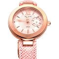 Утончённая модель привлекает лёгким оттенком винтажа благодаря изящным римским цифрам. Наручные часы позволят создать образ романтичной натуры, станут идеальным дополнением к повседневному образу. Розовый циферблат имеет миниатюрные счётчики для отображения времени в 12/24-ом формате, индикации числа и дня недели. В качестве украшения используются стразы Swarovski. Ремешок из натуральной кожи. Ударопрочный корпусУдаропрочный корпусМеханизм заключён в корпус, выполненный из современных материалов, устойчивых к ударам, механическим повреждениям и падению с высоты: инновационный пластик, карбон, нержавеющая сталь, титан.. Водонепроницаемость 5 бар. Минеральное стекло. Габариты: 41,3 x 34 x 9,2 мм.