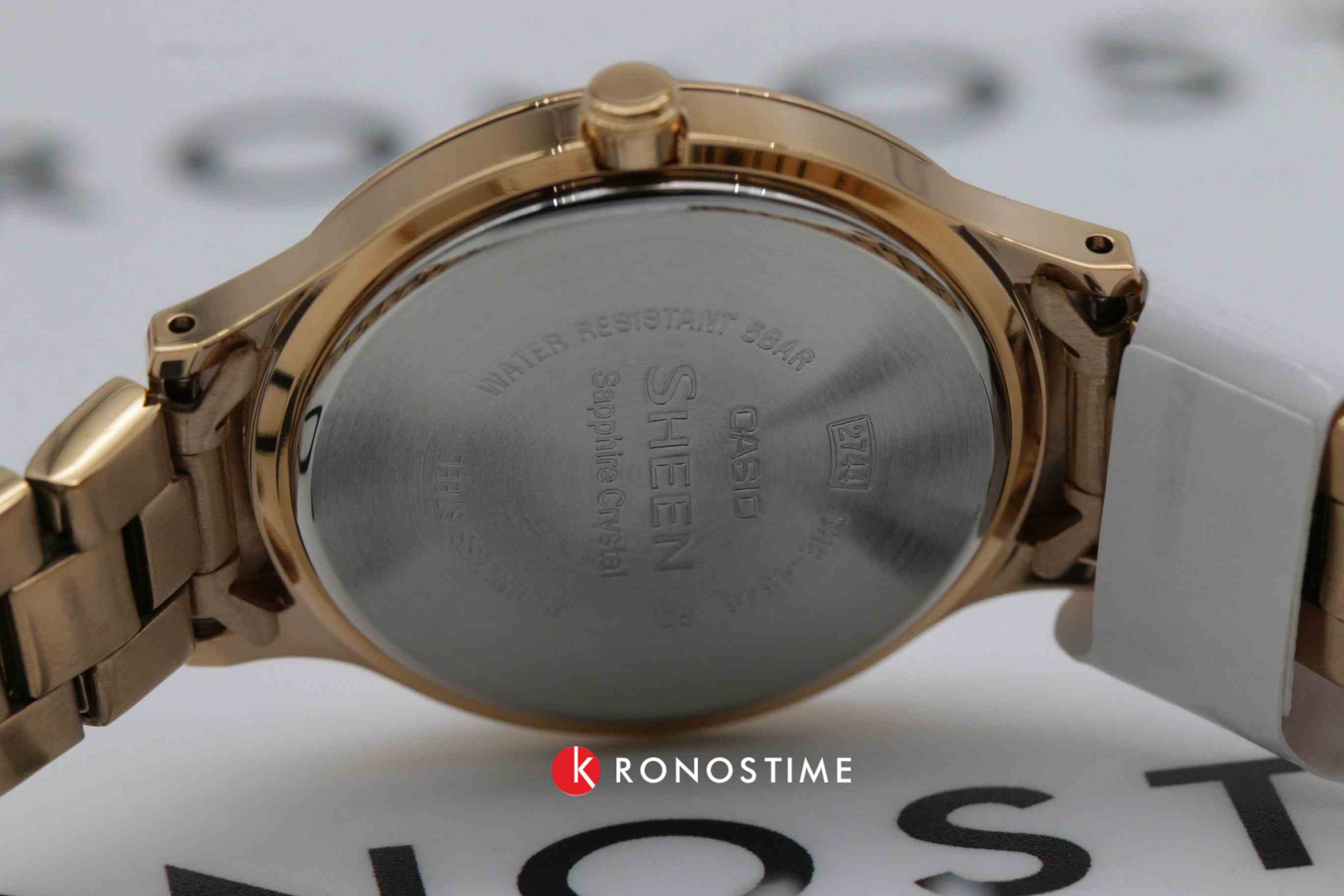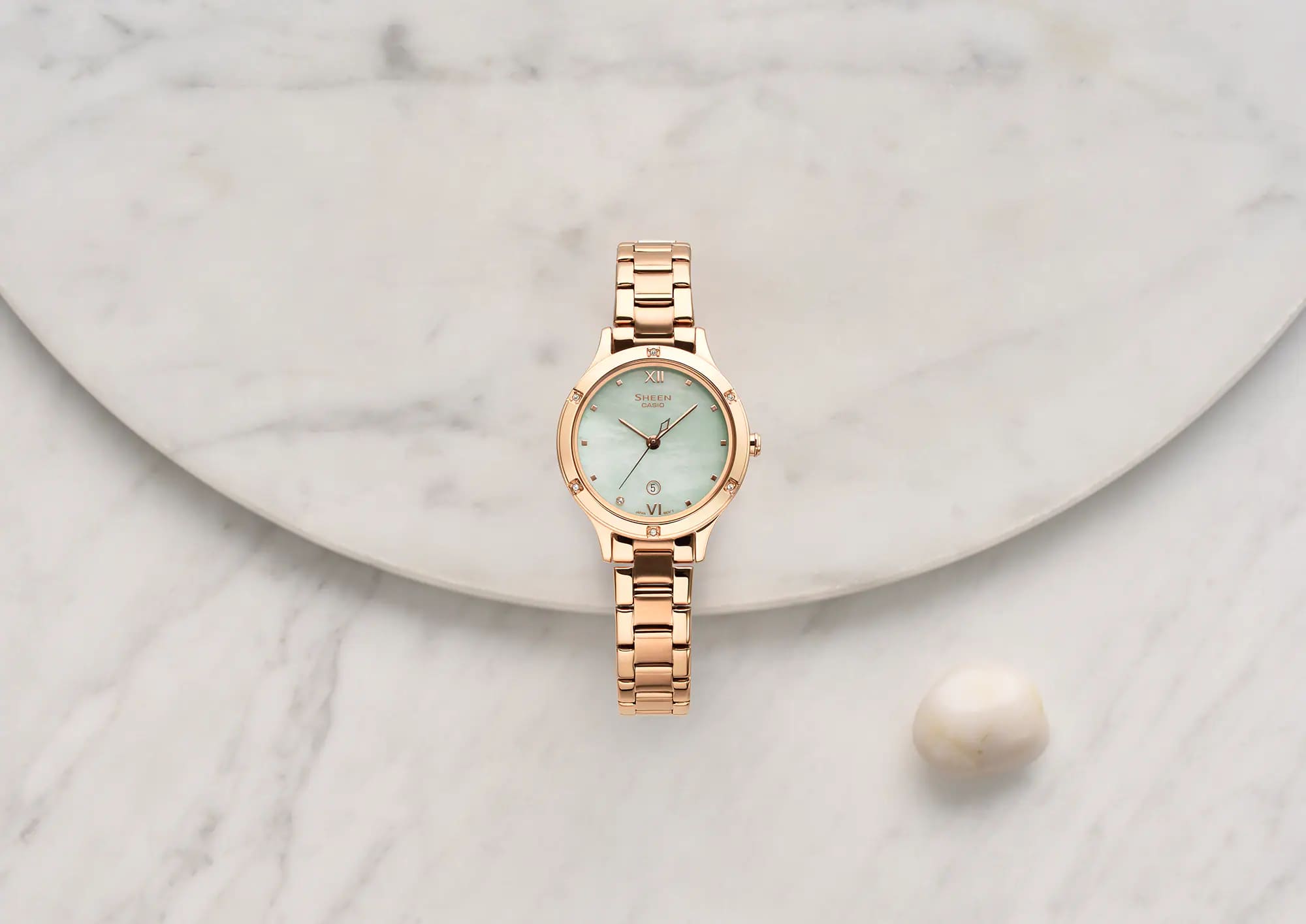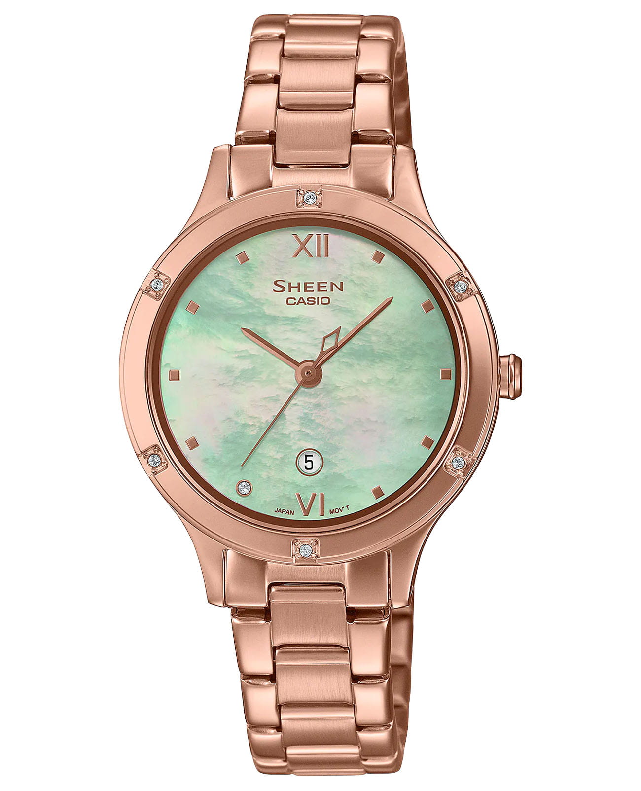 Женские японские часы Casio Sheen SHE-4546PG-3A, кварцевый механизм с высокой точностью. Класс водозащиты: 50 метров, позволит защитить корпус от случайных брызг или капель дождя. Круглый стальной корпус изготовлен из нержавеющей стали с IP-покрытиемIP-покрытиеМетод ионного напыления. Демонстрирует повышенную устойчивость к истиранию, окислению и химическим веществам. Под воздействием высокого давления и температуры около 1500°C молекулы металла надёжно соединяются с частицами корпуса часов. розового цвета. БезельБезельВнешний ободок, закрепляющий стекло. В спортивных часах так называется поворотное кольцо с делениями на циферблате, выполняет роль таймера – замеряет отрезки времени на шкале. Неподвижный безель – элемент декора. Однонаправленно вращающийся безель на дайверских часах позволяет фиксировать моменты погружения и выныривания на поверхность. украшен кристаллами, как и отметка 7-ми часов. Окошко даты на отметке 6 часов. Полированный стальной браслет с IP-покрытиемIP-покрытиеМетод ионного напыления. Демонстрирует повышенную устойчивость к истиранию, окислению и химическим веществам. Под воздействием высокого давления и температуры около 1500°C молекулы металла надёжно соединяются с частицами корпуса часов. имеет скользящую застежку