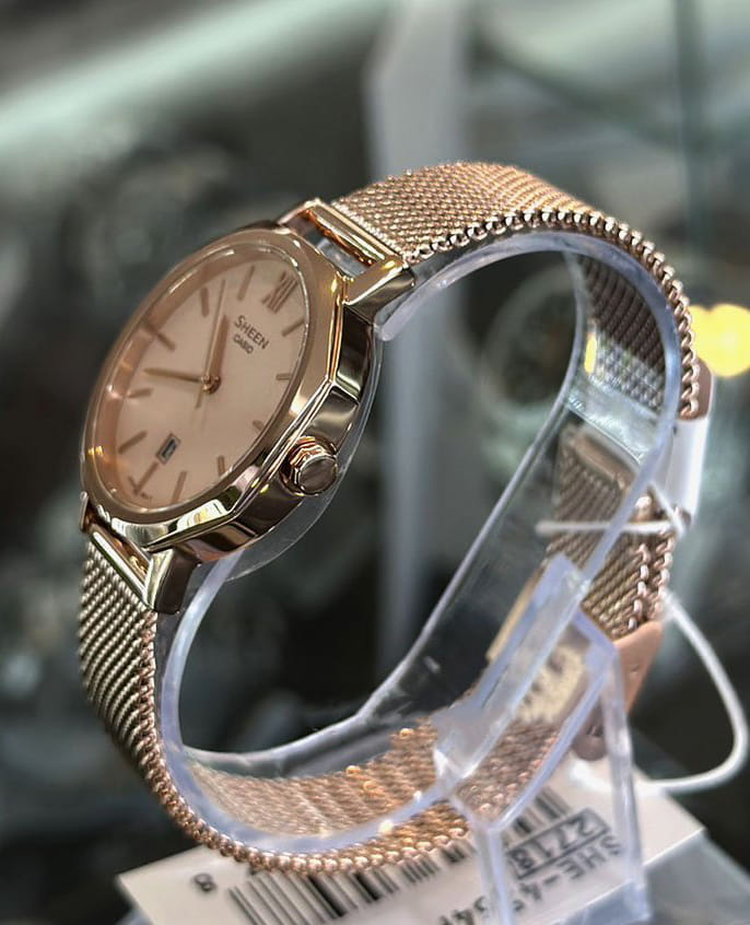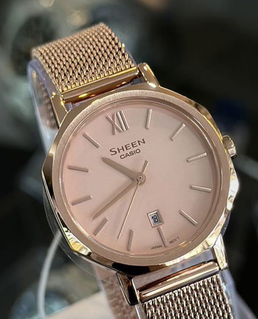 Японские женские часы Casio Sheen SHE-4554PGM-4AUEF, кварцевый механизм с высокой точностью. Корпус выполнен из нержавеющей стали. Окошко даты в положении 6 часов. Класс водозащиты: 50 метров, позволит защитить корпус от случайных брызг или капель дождя. Стальной браслет миланского плетения на раскладной застёжкеРаскладная застёжкаТакой тип застёжки используется только на браслетах из металла. Она никогда не раскрывается полностью, происходит разделение на 2 и более частей. Раскладывающая застёжка снизит вероятность потери часов к минимуму..