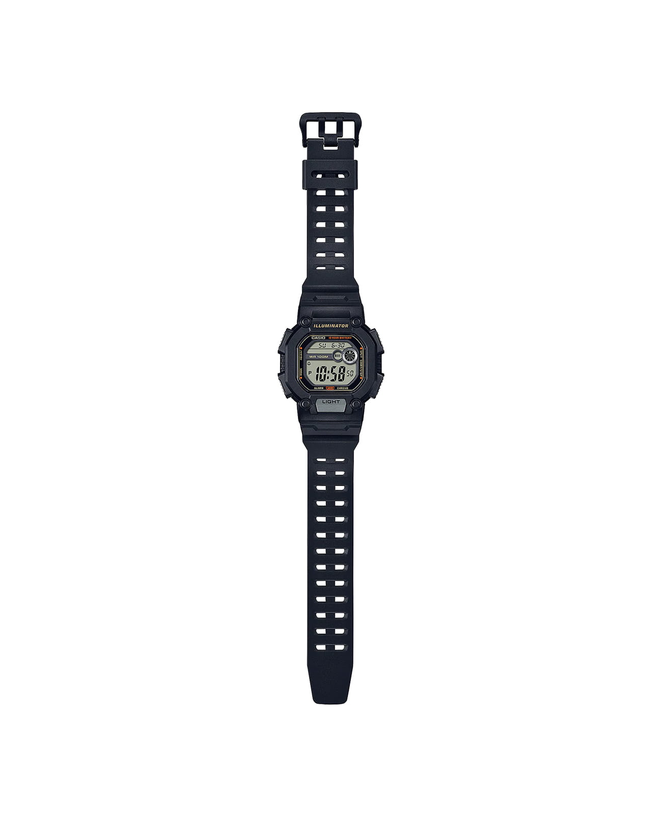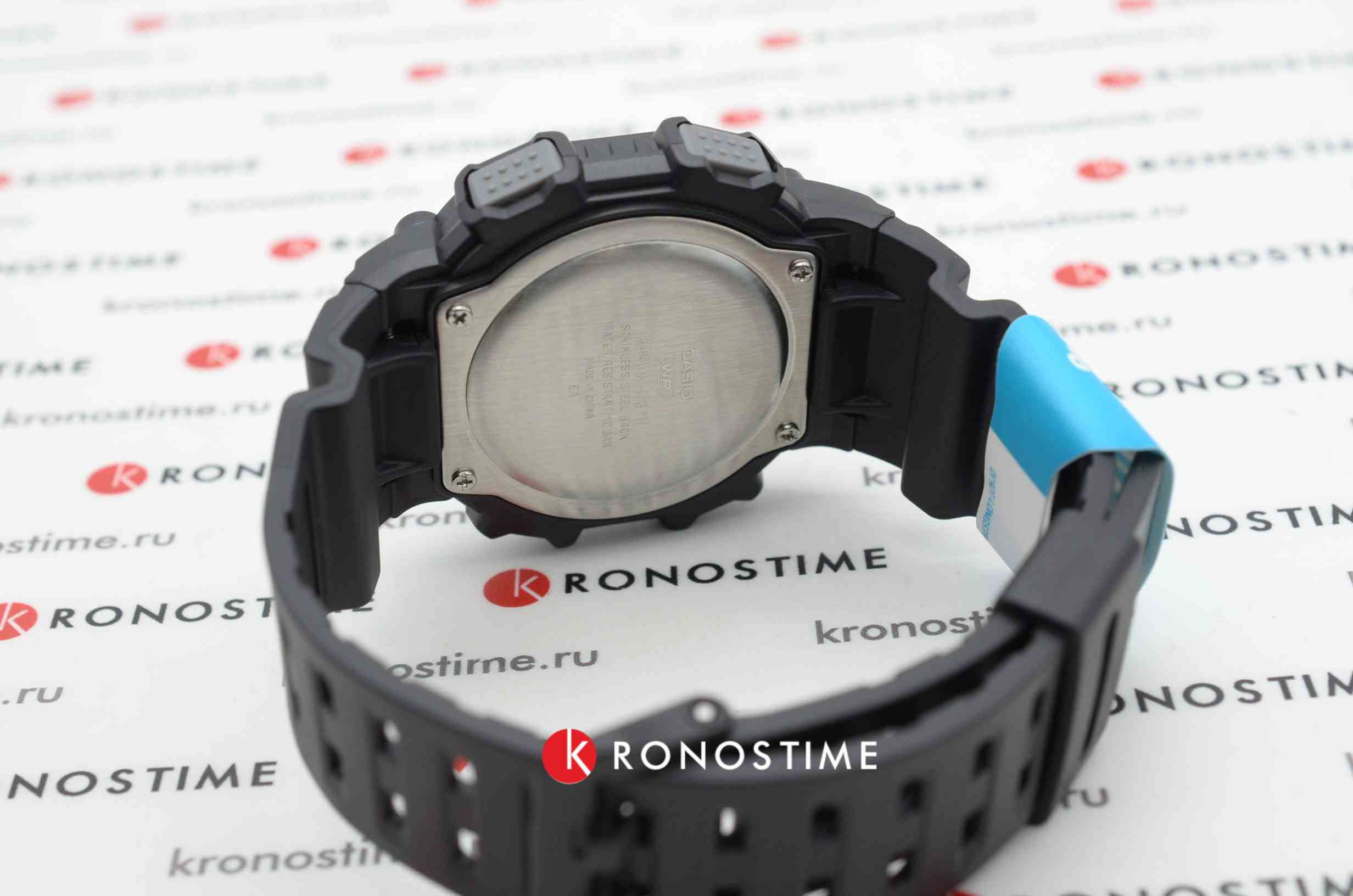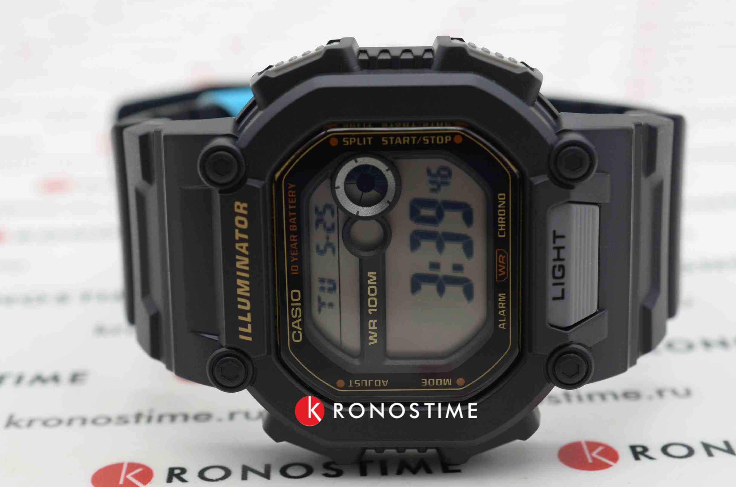 Спортивные мужские часы. Секундомер. Отображение времени в двух часовых поясах. Таймер. Будильник. Мировое время. Подсветка циферблата. Корпус - Пластиковый; Стекло - Пластик; Водозащита - 100 м. (WR 100); Материал ремешка - Пластиковый; Цвет ремешка - Черный; Цвет циферблата - Lcd.
