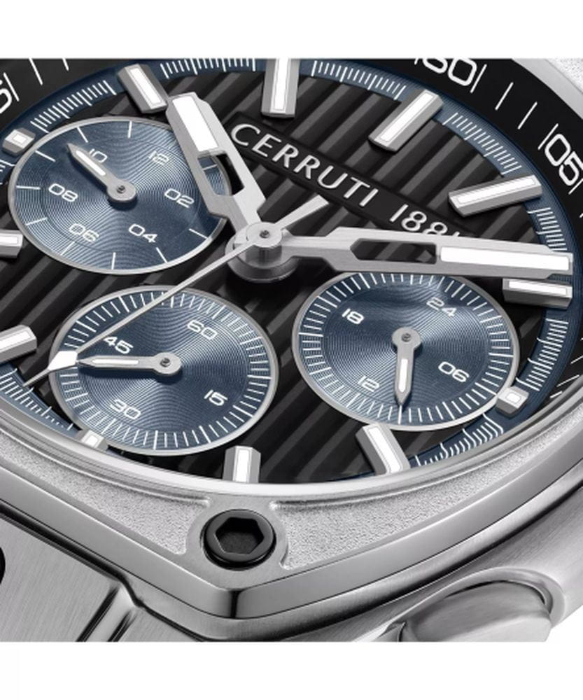 Cerruti 1881 CIWGO0085001 — эффектные мужские часы, сочетающие индустриальную мощь и современную элегантность. Корпус из нержавеющей стали с массивным восьмигранным безелемБезельВнешний ободок, закрепляющий стекло. В спортивных часах так называется поворотное кольцо с делениями на циферблате, выполняет роль таймера – замеряет отрезки времени на шкале. Неподвижный безель – элемент декора. Однонаправленно вращающийся безель на дайверских часах позволяет фиксировать моменты погружения и выныривания на поверхность. и декоративными винтами подчёркивает силу и характер дизайна. Глубокий чёрный циферблат с тремя счётчиками хронографаХронографФункция позволяет измерять отрезки времени с особой точностью: часы, минуты, секунды. Верным признаком хронографа является наличие на циферблате 3 дополнительных окошек-счётчиков. и рельефной текстурой придаёт модели динамичность, а контрастные стрелки и метки с люминесцентным покрытиемЛюминесцентное покрытиеПозволяет считывать показания времени в темноте. Производители наносят на стрелки, часовые индексы, безель или поверхность циферблата светонакопительный состав, дающий холодное свечение. обеспечивают превосходную читаемость при любом освещении. Прочное минеральное стеклоМинеральное стеклоМинеральное стекло представляет собой искусственно выращенный минерал кварца. Такое стекло отличается особой устойчивостью к повреждениям и царапинам. Уступает по некоторым качествам сапфировому стеклу. защищает циферблат от царапин, а мягкий каучуковый ремешок обеспечивает комфорт при ежедневном ношении. Cerruti 1881 — это воплощение итальянского стиля, надёжности и уверенности, идеально подходящее для мужчин, ценящих современные формы и функциональную эстетику.