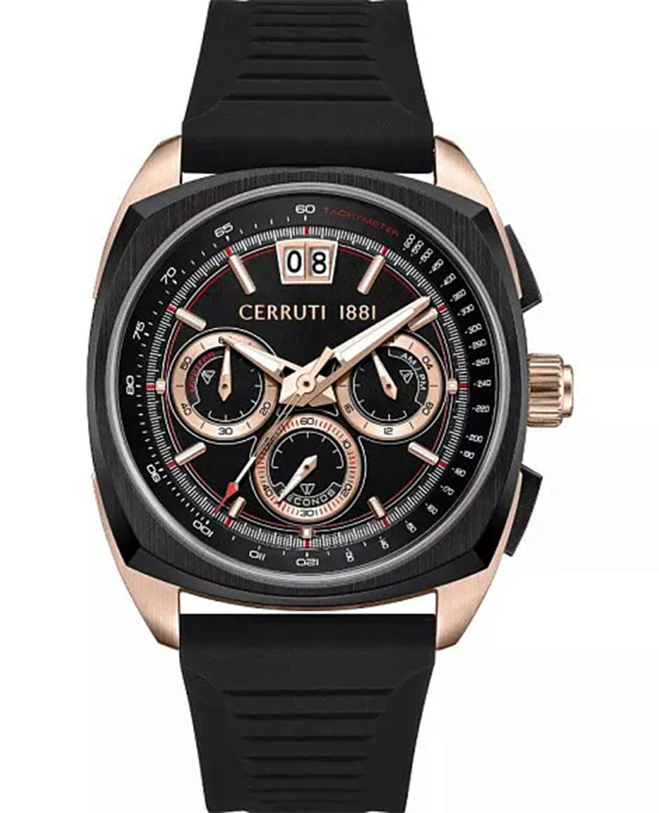 Мужские кварцевые часы Cerruti 1881 Cuneo CIWGO0085102 — спортивный аксессуар с французским дизайном и расширенным функционалом. Корпус из нержавеющей стали 316L с IP-покрытиемIP-покрытиеМетод ионного напыления. Демонстрирует повышенную устойчивость к истиранию, окислению и химическим веществам. Под воздействием высокого давления и температуры около 1500°C молекулы металла надёжно соединяются с частицами корпуса часов., размером 41.3 мм. Циферблат — чёрный с золотыми элементами, с штриховыми метками и окошком даты в положении 12 часов. Стекло — минеральноеМинеральное стеклоМинеральное стекло представляет собой искусственно выращенный минерал кварца. Такое стекло отличается особой устойчивостью к повреждениям и царапинам. Уступает по некоторым качествам сапфировому стеклу. с сапфировым покрытием. Стрелки и метки с люминесцентным покрытиемЛюминесцентное покрытиеПозволяет считывать показания времени в темноте. Производители наносят на стрелки, часовые индексы, безель или поверхность циферблата светонакопительный состав, дающий холодное свечение.. Функции: хронографХронографФункция позволяет измерять отрезки времени с особой точностью: часы, минуты, секунды. Верным признаком хронографа является наличие на циферблате 3 дополнительных окошек-счётчиков., тахиметрТахиметрРазмеченная шкала, располагается на ободке или безеле часов. Тахиметр позволяет рассчитать скорость на определённом участке пути, расстояние измеряется в километрах или милях., секундомер. Ремешок — чёрный силиконовый на стандартной застёжке. Водонепроницаемость 50 м. Идеальный выбор для тех, кто ценит французский дизайн и спортивный стиль.