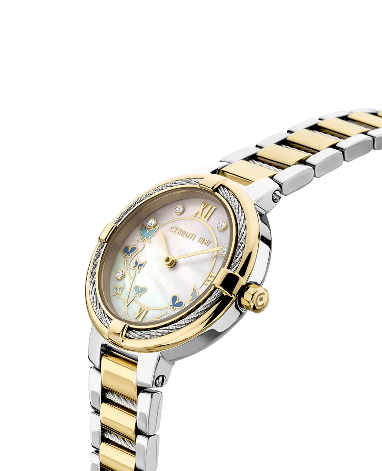 Французские женские часы с кристаллами Cerruti 1881 Gardena CIWLG0008303, кварцевый механизм с высокой точностью. Минеральное стеклоМинеральное стеклоМинеральное стекло представляет собой искусственно выращенный минерал кварца. Такое стекло отличается особой устойчивостью к повреждениям и царапинам. Уступает по некоторым качествам сапфировому стеклу. устойчивое к мелким механическим повреждениям. Корпус часов изготовлен из стали. БезельБезельВнешний ободок, закрепляющий стекло. В спортивных часах так называется поворотное кольцо с делениями на циферблате, выполняет роль таймера – замеряет отрезки времени на шкале. Неподвижный безель – элемент декора. Однонаправленно вращающийся безель на дайверских часах позволяет фиксировать моменты погружения и выныривания на поверхность. с частичным IP-покрытиемIP-покрытиеМетод ионного напыления. Демонстрирует повышенную устойчивость к истиранию, окислению и химическим веществам. Под воздействием высокого давления и температуры около 1500°C молекулы металла надёжно соединяются с частицами корпуса часов.. Циферблат украшен кристаллами. Класс водозащиты: 50 метров, позволит защитить корпус от случайных брызг или капель дождя. Стальной браслет с частичным IP-покрытиемIP-покрытиеМетод ионного напыления. Демонстрирует повышенную устойчивость к истиранию, окислению и химическим веществам. Под воздействием высокого давления и температуры около 1500°C молекулы металла надёжно соединяются с частицами корпуса часов. на застёжке-бабочке с кнопкамиЗастёжка "бабочка"Такой вид застёжки дополняется предохранителями, помогающими избежать случайного раскрытия браслета. Обладают изящным исполнением. .
