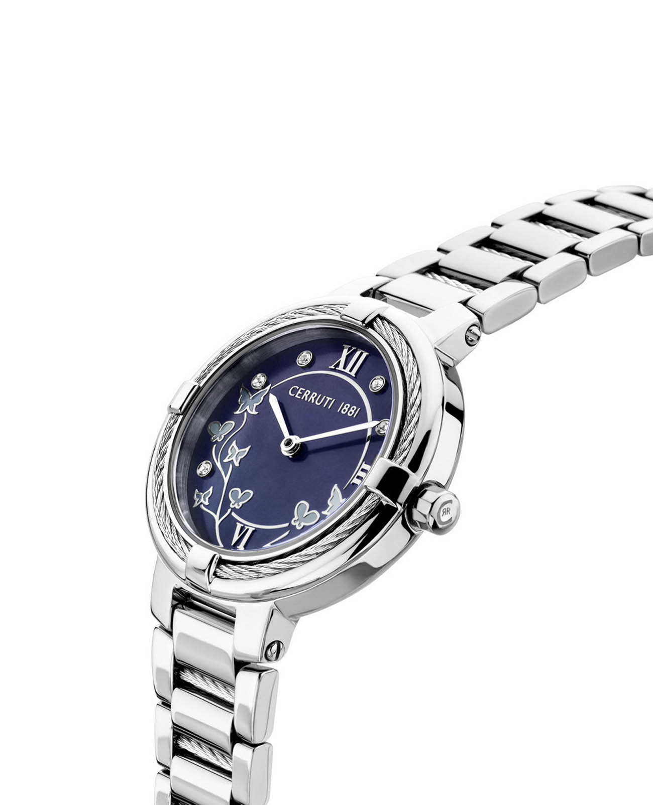 Французские женские часы с кристаллами Cerruti 1881 Gardena CIWLG0008304, кварцевый механизм с высокой точностью. Минеральное стеклоМинеральное стеклоМинеральное стекло представляет собой искусственно выращенный минерал кварца. Такое стекло отличается особой устойчивостью к повреждениям и царапинам. Уступает по некоторым качествам сапфировому стеклу. устойчивое к мелким механическим повреждениям. Корпус часов изготовлен из стали. Циферблат украшен кристаллами. Метки в виде римских цифр и кристаллов. Класс водозащиты: 50 метров, позволит защитить корпус от случайных брызг или капель дождя. Стальной браслет на застёжке-бабочке с кнопкамиЗастёжка "бабочка"Такой вид застёжки дополняется предохранителями, помогающими избежать случайного раскрытия браслета. Обладают изящным исполнением. .