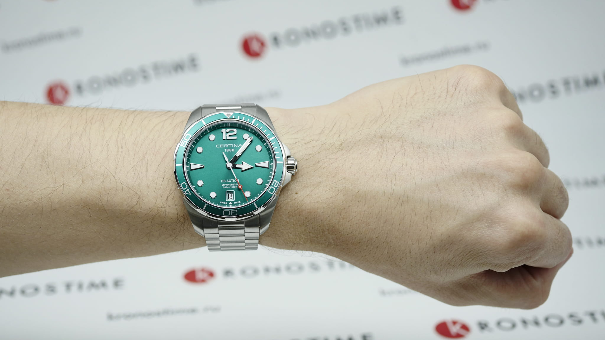 Это превосходная модель в серебристо-зелёной расцветке для тех, кто не готов соглашаться на меньшее. Наручные часы отличаются безупречными характеристиками по всем параметрам: ударопрочный корпусУдаропрочный корпусМеханизм заключён в корпус, выполненный из современных материалов, устойчивых к ударам, механическим повреждениям и падению с высоты: инновационный пластик, карбон, нержавеющая сталь, титан. из хирургической стали 316L, устойчивое к царапинам сапфировое стекло с антибликовой поверхностью, водостойкость до 30 бар, повышенная точность хода кварцевого швейцарского калибра ETA F07.412 Precidrive™Precidrive™Инновационный кварцевый механизм Certina. Часы, оснащённые этим швейцарским калибром, приравниваются к точности к сертифицированным хронометрам, точность хода составляет +/-10 секунд в год., подтверждённая сертификатом COSCСертификат COSCОфициальный сертификат, подтверждающий то, что часы ходят с особо высокой точностью. Для получения документа часы подвергаются тестовым испытаниям, разработанным швейцарским институтом тестирования хронометров COSC. Допустимая норма для механических часов -4/+6 секунд в день, для кварцевых моделей +/- 0,07 секунд в день.. Алюминиевый вращающийся безельБезельВнешний ободок, закрепляющий стекло. В спортивных часах так называется поворотное кольцо с делениями на циферблате, выполняет роль таймера – замеряет отрезки времени на шкале. Неподвижный безель – элемент декора. Однонаправленно вращающийся безель на дайверских часах позволяет фиксировать моменты погружения и выныривания на поверхность.. Закручивающиеся кнопки, заводная головка с системой защиты, задняя крышка. Индикатор EOLEOLПредставляет собой систему, уведомляющую владельца часов о необходимости замены элемента питания. За 2 недели до полного разряда батарейки секундная стрелка перестаёт ходить чётко и начинает перепрыгивать на 3-4 деления.. Апертура даты. Застёжка с фиксатором и удлинением для дайверовУдлинение для дайверовЗастёжка с удлинением для дайверов представляет собой безопасное крепление, которое позволяет надевать часы поверх гидрокостюма. Гибкая застёжка удлиняется на 1-2 миллиметра.. Диаметр корпуса: 43 мм.