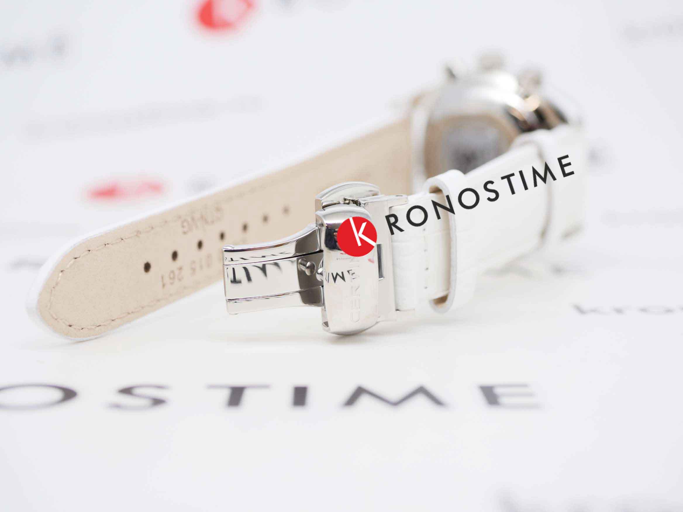 Женские швейцарские часы Certina DS-8 Lady Chronograph C033.234.36.048.01 из коллекции DS-8 – идеальное дополнение образа. Высокая точность хода швейцарского кварцевого калибра ETA G15.212 AA Precidrive™Precidrive™Инновационный кварцевый механизм Certina. Часы, оснащённые этим швейцарским калибром, приравниваются к точности к сертифицированным хронометрам, точность хода составляет +/-10 секунд в год. отмечена сертификатом COSCСертификат COSCОфициальный сертификат, подтверждающий то, что часы ходят с особо высокой точностью. Для получения документа часы подвергаются тестовым испытаниям, разработанным швейцарским институтом тестирования хронометров COSC. Допустимая норма для механических часов -4/+6 секунд в день, для кварцевых моделей +/- 0,07 секунд в день.. Сапфировое стеклоСапфировое стеклоПрочный и надёжный материал из кристалла сапфира синтетического происхождения, характеризующийся особой твёрдостью и устойчивостью к царапинам и повреждениям. с покрытием «антиблик». ХронографХронографФункция позволяет измерять отрезки времени с особой точностью: часы, минуты, секунды. Верным признаком хронографа является наличие на циферблате 3 дополнительных окошек-счётчиков., секундомер, дата, EOLEOLПредставляет собой систему, уведомляющую владельца часов о необходимости замены элемента питания. За 2 недели до полного разряда батарейки секундная стрелка перестаёт ходить чётко и начинает перепрыгивать на 3-4 деления.. Концепция Двойной Надёжности DSDS ConceptDouble Security Concept, обозначает двойную надёжность и безупречную точность часов Certina. Двойная система защиты подразумевает обеспечение максимальной устойчивости к ударам и высоких показателей водонепроницаемости.. Белый ремешок из натуральной кожи. Производство и сборка: Швейцария.