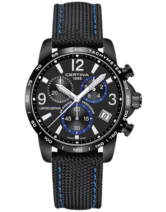 Модель из ограниченной серии поставляется в оригинальной коробке с отделкой под мотогоночный шлем, на заднюю крышку нанесено имя и номер известного участника Monster Energy Yamaha Factory Team. Динамики придают крупные цифры, счётчики и метки, тканевый ремешок с синей прострочкой удобно сидит на запястье. Спортивный хронографХронографФункция позволяет измерять отрезки времени с особой точностью: часы, минуты, секунды. Верным признаком хронографа является наличие на циферблате 3 дополнительных окошек-счётчиков. оснащён кварцевым калибром Precidrive™Precidrive™Инновационный кварцевый механизм Certina. Часы, оснащённые этим швейцарским калибром, приравниваются к точности к сертифицированным хронометрам, точность хода составляет +/-10 секунд в год., обеспечивающим высокую точность хода. Ударопрочный корпус с PVD-покрытиемPVDУльтратонкое покрытие наносится в технике вакуумного напыления, сочетает в себе нитрид титана особой прочности со слоем золота или оксида хрома. Несёт в себе декоративную или защитную функцию.. Антибликовое покрытие стекла из сапфира. Заводная головка с системой защиты. Диаметр корпуса: 41 мм.