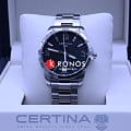 Дизайн аксессуара с чёрным циферблатом тщательно продуман, спортивное оформление перекликается с элементами лаконичной классики. Благодаря крупной индикации времени обеспечивается превосходная читаемость циферблата даже при мимолётном взгляде на запястье. Наручные часы отображают время с хронометрической точностью, что подтверждается официальным сертификатом COSCСертификат COSCОфициальный сертификат, подтверждающий то, что часы ходят с особо высокой точностью. Для получения документа часы подвергаются тестовым испытаниям, разработанным швейцарским институтом тестирования хронометров COSC. Допустимая норма для механических часов -4/+6 секунд в день, для кварцевых моделей +/- 0,07 секунд в день.. Швейцарский кварцевый калибр ETA F07.412 Precidrive™Precidrive™Инновационный кварцевый механизм Certina. Часы, оснащённые этим швейцарским калибром, приравниваются к точности к сертифицированным хронометрам, точность хода составляет +/-10 секунд в год.. Ударопрочный корпусУдаропрочный корпусМеханизм заключён в корпус, выполненный из современных материалов, устойчивых к ударам, механическим повреждениям и падению с высоты: инновационный пластик, карбон, нержавеющая сталь, титан. и браслет из нержавеющей стали 316L. DS ConceptDS ConceptDouble Security Concept, обозначает двойную надёжность и безупречную точность часов Certina. Двойная система защиты подразумевает обеспечение максимальной устойчивости к ударам и высоких показателей водонепроницаемости.. Заводная головка с системой защиты. Водостойкость 10 бар. Люминесцентная подсветкаЛюминесцентное покрытиеПозволяет считывать показания времени в темноте. Производители наносят на стрелки, часовые индексы, безель или поверхность циферблата светонакопительный состав, дающий холодное свечение.. Апертура даты. . Индикатор EOLEOLПредставляет собой систему, уведомляющую владельца часов о необходимости замены элемента питания. За 2 недели до полного разряда батарейки секундная стрелка перестаёт ходить чётко и начинает перепрыгивать на 3-4 деления.. Диаметр корпуса: 40 мм.