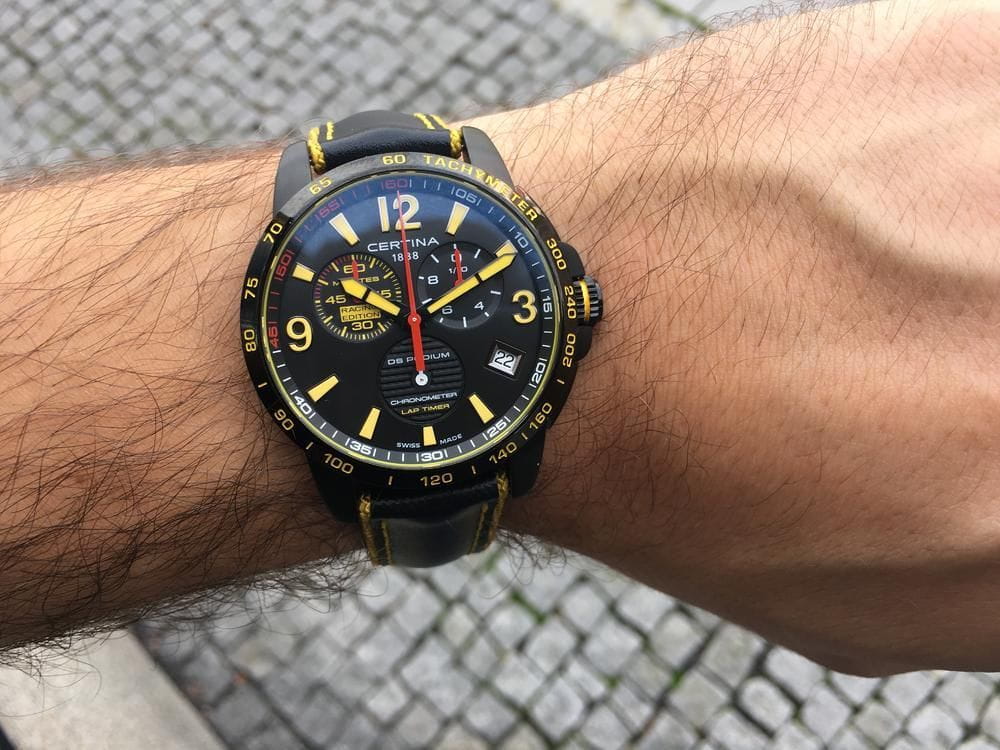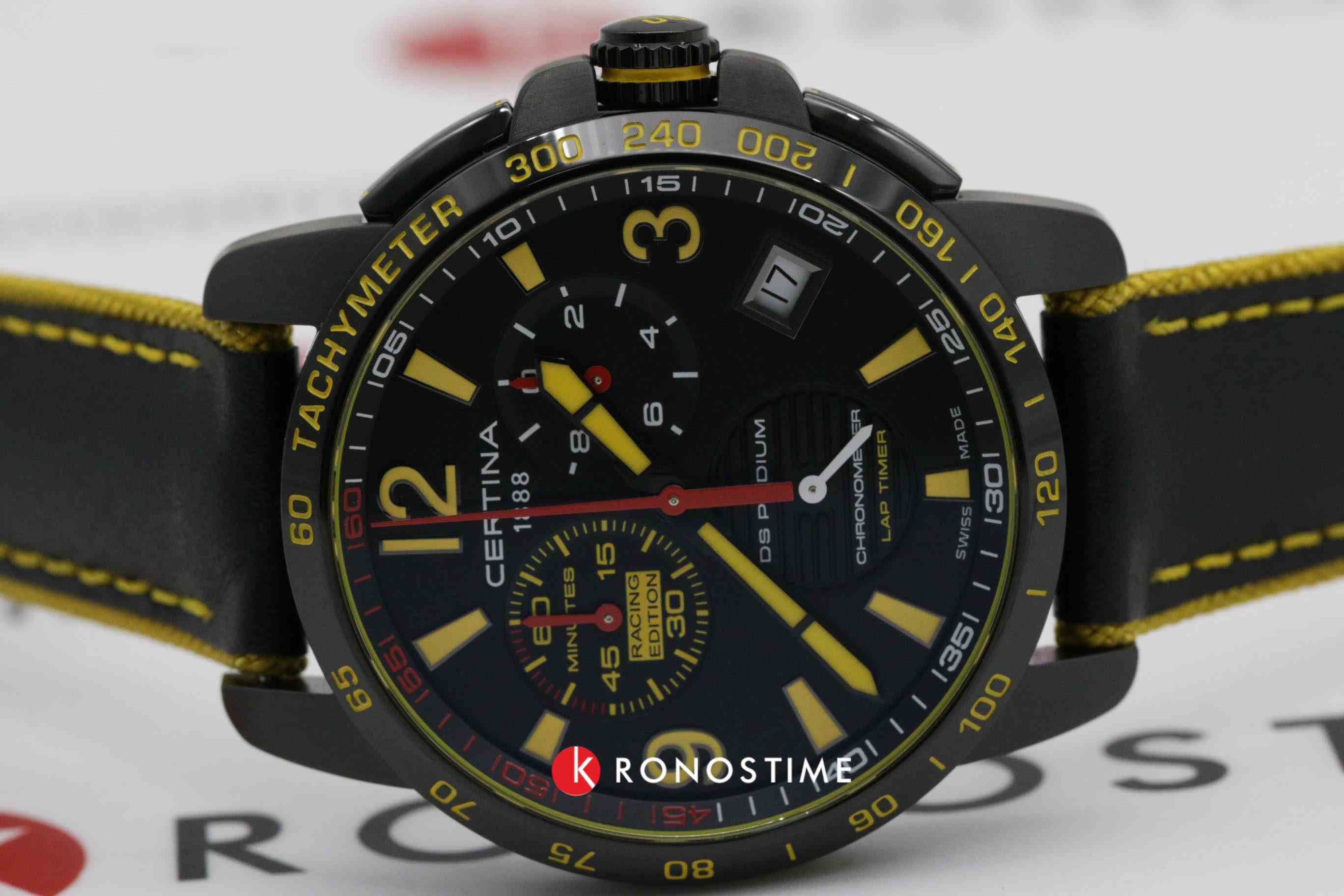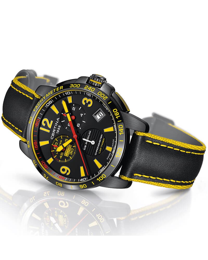 Наручные часы в спортивном стиле дополнены красными и жёлтыми деталями, что символизирует скоростное напряжение на гоночной трассе. Отличным дополнением стал кожаный ремешок. Кварцевый швейцарский механизм ETA G10.212 Precidrive™Precidrive™Инновационный кварцевый механизм Certina. Часы, оснащённые этим швейцарским калибром, приравниваются к точности к сертифицированным хронометрам, точность хода составляет +/-10 секунд в год. с повышенной точностью хода, подтверждённой сертификатом COSCСертификат COSCОфициальный сертификат, подтверждающий то, что часы ходят с особо высокой точностью. Для получения документа часы подвергаются тестовым испытаниям, разработанным швейцарским институтом тестирования хронометров COSC. Допустимая норма для механических часов -4/+6 секунд в день, для кварцевых моделей +/- 0,07 секунд в день.. Система DS ConceptDS ConceptDouble Security Concept, обозначает двойную надёжность и безупречную точность часов Certina. Двойная система защиты подразумевает обеспечение максимальной устойчивости к ударам и высоких показателей водонепроницаемости.. Двухстороннее антибликовое покрытие для стекла из сапфира. Корпус из нержавеющей стали с PVD-покрытиемPVDУльтратонкое покрытие наносится в технике вакуумного напыления, сочетает в себе нитрид титана особой прочности со слоем золота или оксида хрома. Несёт в себе декоративную или защитную функцию.. Стрелки и индексы с составом SuperLumiNovaЛюминесцентное покрытиеПозволяет считывать показания времени в темноте. Производители наносят на стрелки, часовые индексы, безель или поверхность циферблата светонакопительный состав, дающий холодное свечение.. Заводная головка с защитой. ХронографХронографФункция позволяет измерять отрезки времени с особой точностью: часы, минуты, секунды. Верным признаком хронографа является наличие на циферблате 3 дополнительных окошек-счётчиков., шкала тахиметраТахиметрРазмеченная шкала, располагается на ободке или безеле часов. Тахиметр позволяет рассчитать скорость на определённом участке пути, расстояние измеряется в километрах или милях., календарь, секундомер, индикатор EOLEOLПредставляет собой систему, уведомляющую владельца часов о необходимости замены элемента питания. За 2 недели до полного разряда батарейки секундная стрелка перестаёт ходить чётко и начинает перепрыгивать на 3-4 деления., Lap-функция измерения промежуточного времени (круга). Диаметр корпуса: 41 мм.