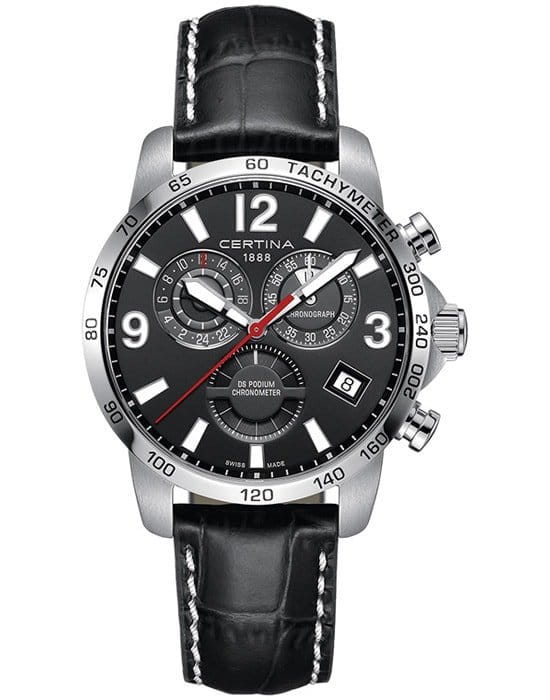 Наручные часы стали отображением спортивного стиля в классической элегантности, яркой деталью стали красные секундные стрелки. Брендовый хронографХронографФункция позволяет измерять отрезки времени с особой точностью: часы, минуты, секунды. Верным признаком хронографа является наличие на циферблате 3 дополнительных окошек-счётчиков. показывает время с абсолютной точностью благодаря швейцарскому кварцевому механизму ETA G10.962 Precidrive™Precidrive™Инновационный кварцевый механизм Certina. Часы, оснащённые этим швейцарским калибром, приравниваются к точности к сертифицированным хронометрам, точность хода составляет +/-10 секунд в год.. Такая особенность не осталась незамеченной, часы имеют сертификат хронометра COSCСертификат COSCОфициальный сертификат, подтверждающий то, что часы ходят с особо высокой точностью. Для получения документа часы подвергаются тестовым испытаниям, разработанным швейцарским институтом тестирования хронометров COSC. Допустимая норма для механических часов -4/+6 секунд в день, для кварцевых моделей +/- 0,07 секунд в день.. Чёрный ремешок из натуральной кожи. Система DS ConceptDS ConceptDouble Security Concept, обозначает двойную надёжность и безупречную точность часов Certina. Двойная система защиты подразумевает обеспечение максимальной устойчивости к ударам и высоких показателей водонепроницаемости.. Стрелки и метки с люминесцентным покрытиемЛюминесцентное покрытиеПозволяет считывать показания времени в темноте. Производители наносят на стрелки, часовые индексы, безель или поверхность циферблата светонакопительный состав, дающий холодное свечение.. Заводная головка с защитой. Сапфировое стекло. Степень водостойкости WR 100. Секундомер, GMTGMTОтображение времени второго часового пояса.Такая функция особенно актуальна для путешественников и бизнесменов,которые общаются с людьми из разных стран,теперь вы всегда будете знать,какой час у вашего партнёра или близкого человека., индикация числа, функция EOLEOLПредставляет собой систему, уведомляющую владельца часов о необходимости замены элемента питания. За 2 недели до полного разряда батарейки секундная стрелка перестаёт ходить чётко и начинает перепрыгивать на 3-4 деления.. Диаметр корпуса: 42 мм.