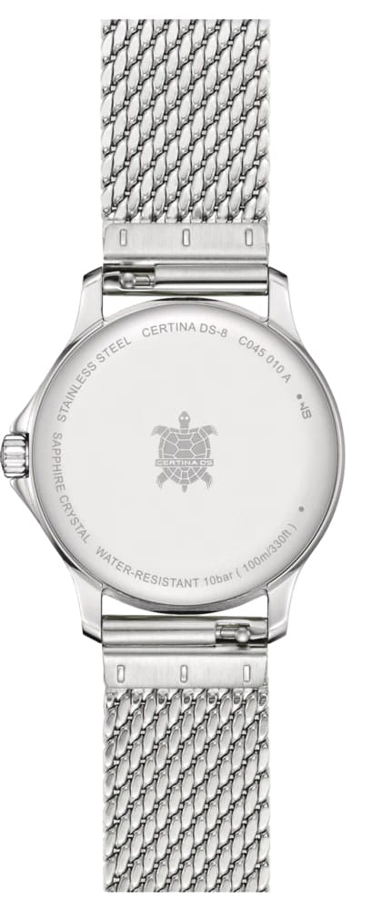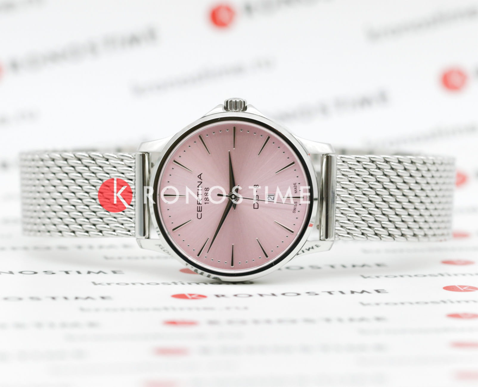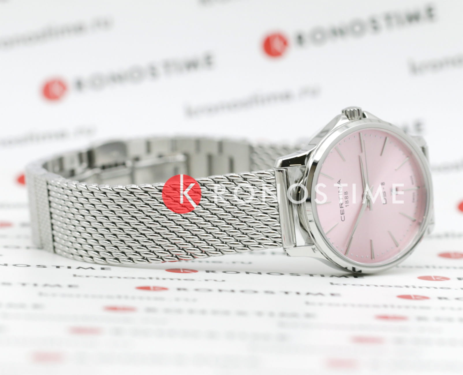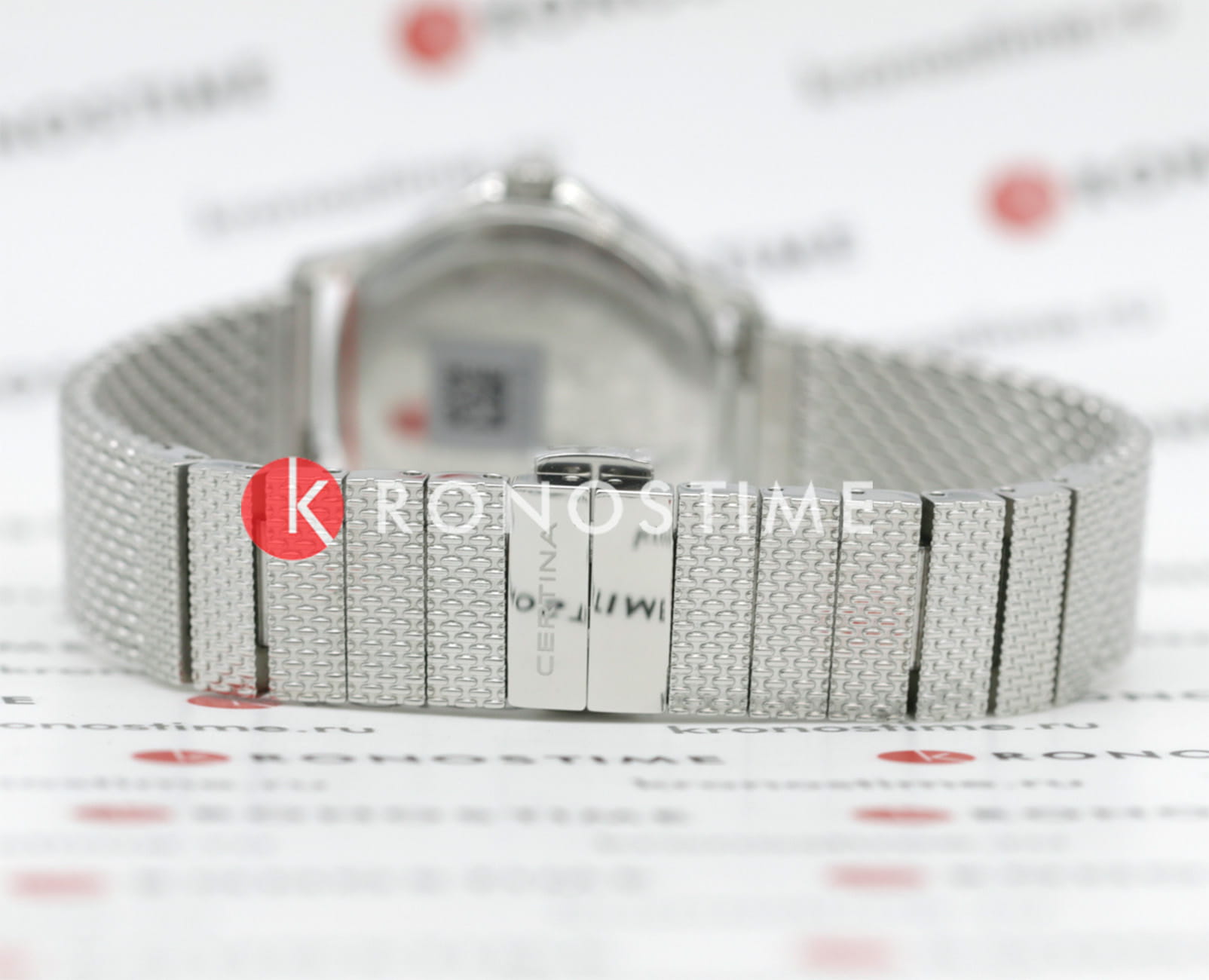 Стальной браслет из нескольких рядов переплетающихся звеньев элегантно выглядит на запястье. Ударопрочность и водонепроницаемость 10 бар – концепция DS ConceptDS ConceptDouble Security Concept, обозначает двойную надёжность и безупречную точность часов Certina. Двойная система защиты подразумевает обеспечение максимальной устойчивости к ударам и высоких показателей водонепроницаемости.. Одностороннее антибликовое покрытие стекла из сапфира. . Индикация текущего числа, функция EOLEOLПредставляет собой систему, уведомляющую владельца часов о необходимости замены элемента питания. За 2 недели до полного разряда батарейки секундная стрелка перестаёт ходить чётко и начинает перепрыгивать на 3-4 деления.. Диаметр корпуса: 31 мм.