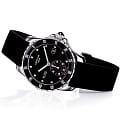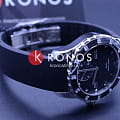 Стальной корпус дополнен керамическим безелемБезельВнешний ободок, закрепляющий стекло. В спортивных часах так называется поворотное кольцо с делениями на циферблате, выполняет роль таймера – замеряет отрезки времени на шкале. Неподвижный безель – элемент декора. Однонаправленно вращающийся безель на дайверских часах позволяет фиксировать моменты погружения и выныривания на поверхность., устойчивым к царапинам. Секундный счётчик вынесен в нижнюю часть циферблата. Чёрный каучуковый ремешок отличается мягкостью и прочностью. В основе работы – швейцарский кварцевый механизм ETA G15.211. Заводная головка декорирована кабашоном.