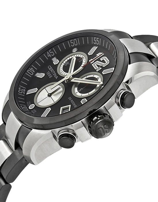 ХронографХронографФункция позволяет измерять отрезки времени с особой точностью: часы, минуты, секунды. Верным признаком хронографа является наличие на циферблате 3 дополнительных окошек-счётчиков. основан на концепции Двойной надёжности DSDS ConceptDouble Security Concept, обозначает двойную надёжность и безупречную точность часов Certina. Двойная система защиты подразумевает обеспечение максимальной устойчивости к ударам и высоких показателей водонепроницаемости.. Ударопрочный корпусУдаропрочный корпусМеханизм заключён в корпус, выполненный из современных материалов, устойчивых к ударам, механическим повреждениям и падению с высоты: инновационный пластик, карбон, нержавеющая сталь, титан. с PVD-покрытиемPVDУльтратонкое покрытие наносится в технике вакуумного напыления, сочетает в себе нитрид титана особой прочности со слоем золота или оксида хрома. Несёт в себе декоративную или защитную функцию. защищает швейцарский кварцевый механизм ETA G10.211. Люминесцентная подсветкаЛюминесцентное покрытиеПозволяет считывать показания времени в темноте. Производители наносят на стрелки, часовые индексы, безель или поверхность циферблата светонакопительный состав, дающий холодное свечение. стрелок позволяет пользоваться часами в темноте. Сапфировое стекло невозможно поцарапать.