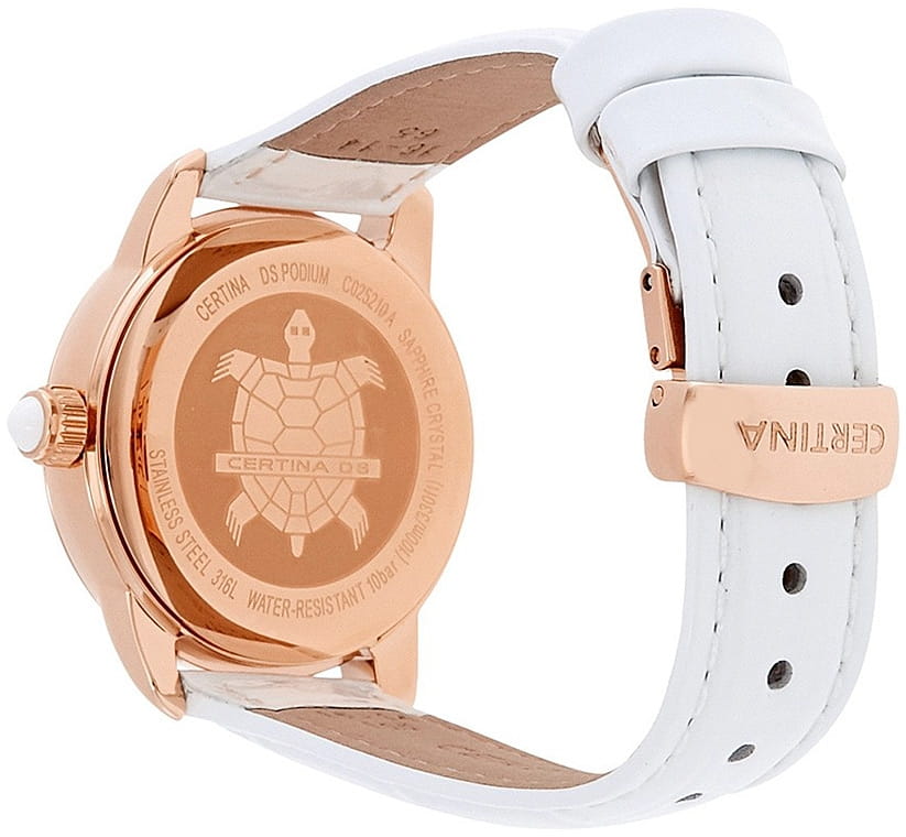 Женские швейцарские часы Certina DS Podium C025.210.36.118.00, кварцевый механизм с высокой точностью. Сапфировое стекло устойчивое к появлению царапин, обладающее высокой прозрачностью. Класс водозащиты: 100 метров, позволит плавать, нырять и заниматься другими водными видами спорта. Корпус часов изготовлен из стали, золотистого цвета.