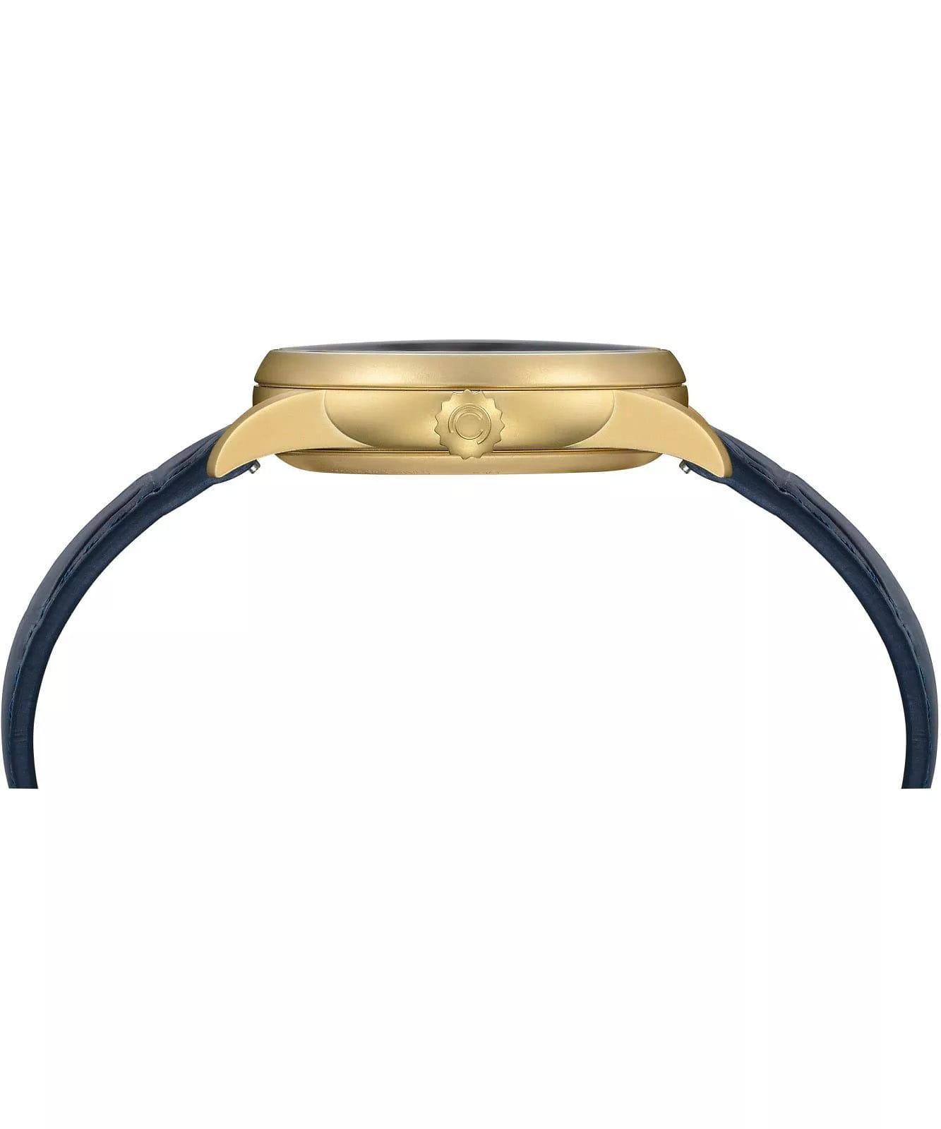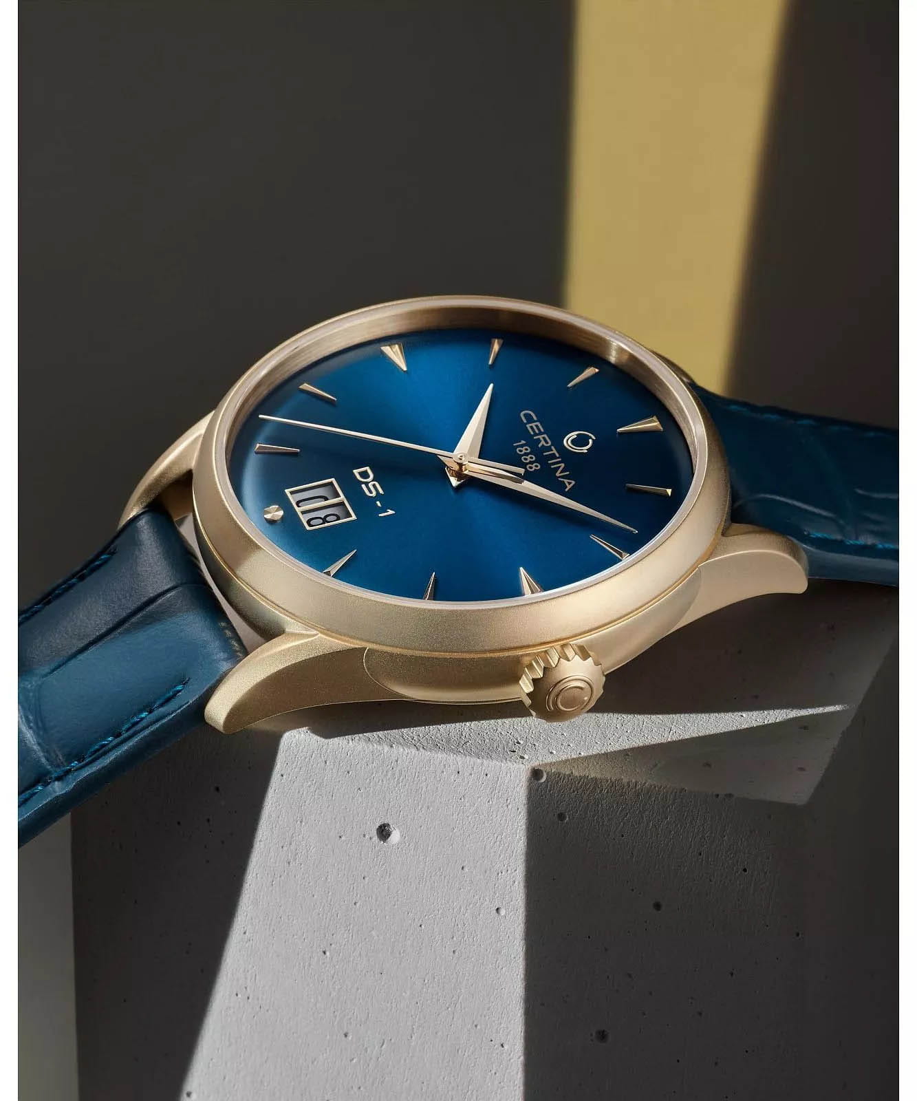 Мужские механические часы Certina C029.426.36.041.00 — это сочетание элегантности, надёжности и швейцарского мастерства. Модель выполнена из нержавеющей стали с PVD-покрытиемPVDУльтратонкое покрытие наносится в технике вакуумного напыления, сочетает в себе нитрид титана особой прочности со слоем золота или оксида хрома. Несёт в себе декоративную или защитную функцию. цвета золота, придающим корпусу благородный внешний вид и устойчивость к царапинам. Диаметр корпуса составляет 41 мм, толщина — 11 мм, что обеспечивает идеальный баланс на запястье. Циферблат синего цвета выполнен в технике sunray, создающей эффект переливающихся лучей, и дополнен золотистыми метками и стрелками. Информация о дате отображается через крупное окошко Big Date, обеспечивающее удобство чтения. Защиту циферблата обеспечивает сапфировое стеклоСапфировое стеклоПрочный и надёжный материал из кристалла сапфира синтетического происхождения, характеризующийся особой твёрдостью и устойчивостью к царапинам и повреждениям. с антибликовым покрытием, устойчивое к повреждениям и обеспечивающее чёткую видимость при любом освещении. Часы оснащены автоматическим механизмом Powermatic 80Powermatic 80Эксклюзивный калибр от швейцарской компании ETA с увеличенным запасом хода до 80 часов за счёт удлинённой заводной пружины. Характеризуется улучшенной системой спуска со сниженным трением., который обеспечивает запас хода до 80 часов. Технология DS (Double Security)Ударопрочный корпусМеханизм заключён в корпус, выполненный из современных материалов, устойчивых к ударам, механическим повреждениям и падению с высоты: инновационный пластик, карбон, нержавеющая сталь, титан. защищает механизм от ударов и вибрации, повышая его долговечность. Водонепроницаемость позволяет использовать часы при плавании и других водных активностях. Ремешок изготовлен из натуральной кожи, обеспечивая комфорт и завершая классический образ модели. Эти часы станут универсальным аксессуаром для тех, кто ценит сочетание стиля, точности и надёжности — идеальный выбор для уверенных в себе мужчин.