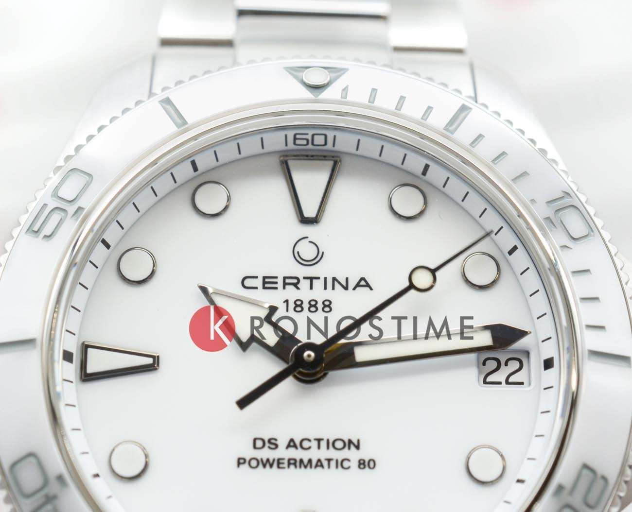 Certina DS Action Lady C032.007.11.011.00 – женские часы для поклонников ярких аксессуаров. И корпус, и браслет изготовлены из высококачественной нержавеющей стали 316L. Под твердым сапфировым стекломСапфировое стеклоПрочный и надёжный материал из кристалла сапфира синтетического происхождения, характеризующийся особой твёрдостью и устойчивостью к царапинам и повреждениям. с антибликовым покрытиемАнтибликовое покрытиеСлой оксида металла в 0,13-0,3 микрон, благодаря которому стекло часов не бликует и не отражает свет. Антибликовое покрытие уменьшает отражение света в 10 раз, обеспечивая отличную читаемость показателей циферблата. находится белый циферблат, на котором вы найдете окошко даты в положении 3 часа и маркировку, покрытую люминесцентным покрытиемЛюминесцентное покрытиеПозволяет считывать показания времени в темноте. Производители наносят на стрелки, часовые индексы, безель или поверхность циферблата светонакопительный состав, дающий холодное свечение. Super-LumiNova. Керамический безельБезельВнешний ободок, закрепляющий стекло. В спортивных часах так называется поворотное кольцо с делениями на циферблате, выполняет роль таймера – замеряет отрезки времени на шкале. Неподвижный безель – элемент декора. Однонаправленно вращающийся безель на дайверских часах позволяет фиксировать моменты погружения и выныривания на поверхность. с минутной шкалой вращается в одном направлении, что позволяет удобно измерять временные отрезки. Все это приводится в действие автоматическим механизмом Powermatic 80Powermatic 80Эксклюзивный калибр от швейцарской компании ETA с увеличенным запасом хода до 80 часов за счёт удлинённой заводной пружины. Характеризуется улучшенной системой спуска со сниженным трением..611 с пружиной Nivachron™Nivachron™Специально разработанный инновационный сплав Nivachron™ повышает устойчивость часов к воздействию магнитных полей.. Класс водозащиты: 300 метров, позволит плавать, нырять и заниматься другими водными видами спорта. Стальной браслет на застёжке-бабочке с кнопкамиЗастёжка "бабочка"Такой вид застёжки дополняется предохранителями, помогающими избежать случайного раскрытия браслета. Обладают изящным исполнением. .