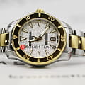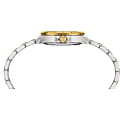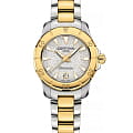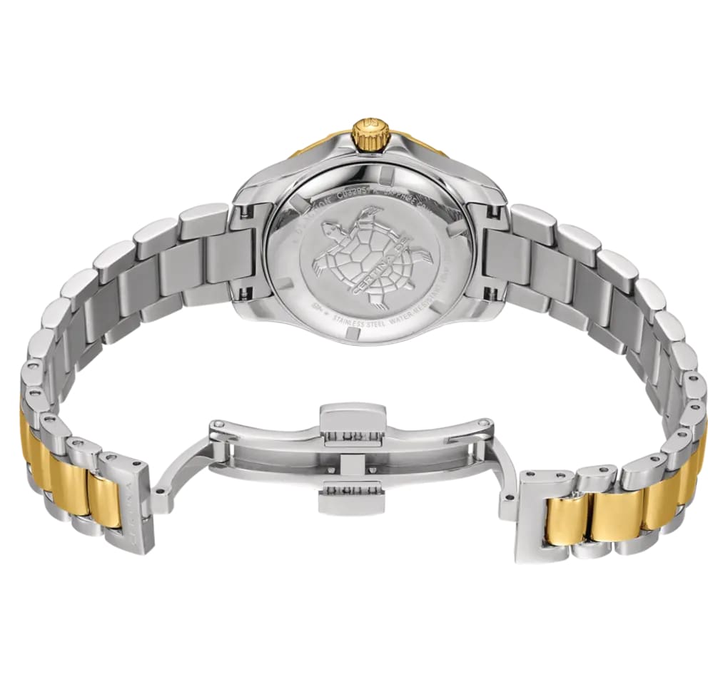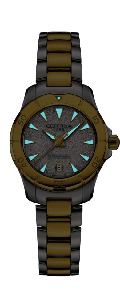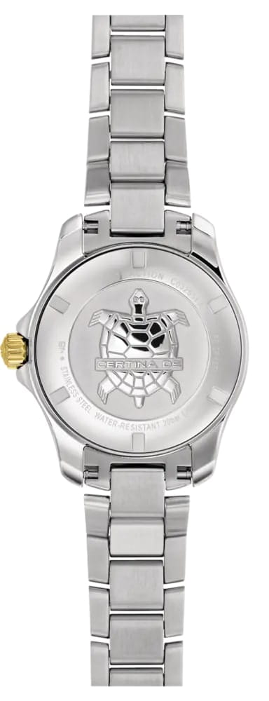 Certina DS Action Lady C032.951.22.031.01 из коллекции DS Action символизируют любовь бренда к водной стихии и высокоточным механизмам. Компактный аксессуар создан по всем правилам дайверской тематики: вращающийся безельБезельВнешний ободок, закрепляющий стекло. В спортивных часах так называется поворотное кольцо с делениями на циферблате, выполняет роль таймера – замеряет отрезки времени на шкале. Неподвижный безель – элемент декора. Однонаправленно вращающийся безель на дайверских часах позволяет фиксировать моменты погружения и выныривания на поверхность., крупная индикация времени, завинчивающаяся заводная головка и задняя крышка. Стильно смотрится серебристый циферблат в сочетании с холодным блеском нержавеющей стали 316L с PVD-покрытиемPVDУльтратонкое покрытие наносится в технике вакуумного напыления, сочетает в себе нитрид титана особой прочности со слоем золота или оксида хрома. Несёт в себе декоративную или защитную функцию..Часы оснащены швейцарским кварцевым калибром ETA F04.412 Precidrive™Precidrive™Инновационный кварцевый механизм Certina. Часы, оснащённые этим швейцарским калибром, приравниваются к точности к сертифицированным хронометрам, точность хода составляет +/-10 секунд в год., точность хода которого отмечена официальным сертификатом COSCСертификат COSCОфициальный сертификат, подтверждающий то, что часы ходят с особо высокой точностью. Для получения документа часы подвергаются тестовым испытаниям, разработанным швейцарским институтом тестирования хронометров COSC. Допустимая норма для механических часов -4/+6 секунд в день, для кварцевых моделей +/- 0,07 секунд в день.. Модель отличается максимальной водонепроницаемостью 200 метров, сапфировое стекло дополнено антибликовым покрытием. Функции: отображение даты, индикатор EOLEOLПредставляет собой систему, уведомляющую владельца часов о необходимости замены элемента питания. За 2 недели до полного разряда батарейки секундная стрелка перестаёт ходить чётко и начинает перепрыгивать на 3-4 деления.. Диаметр корпуса: 29 мм. Производство и сборка: Швейцария.