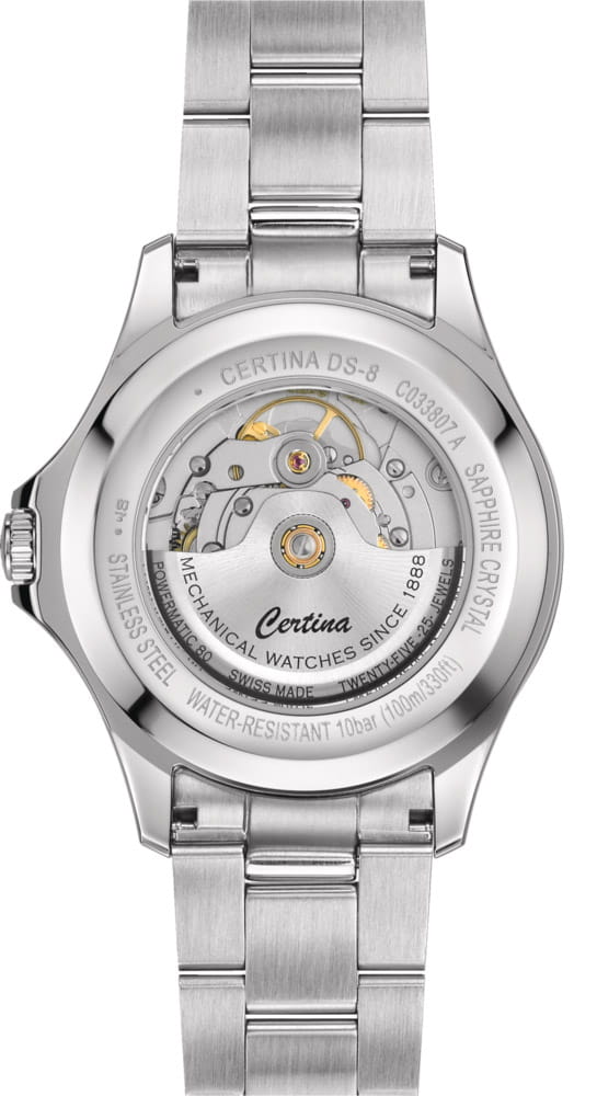 Мужские швейцарские часы Certina DS-8 C033.807.11.057.00, механический механизм (автоматический калибр) с высокой точностью. Сапфировое стекло устойчивое к появлению царапин, обладающее высокой прозрачностью. Класс водозащиты: 100 метров, позволит плавать, нырять и заниматься другими водными видами спорта. Корпус часов изготовлен из стали, цвета.