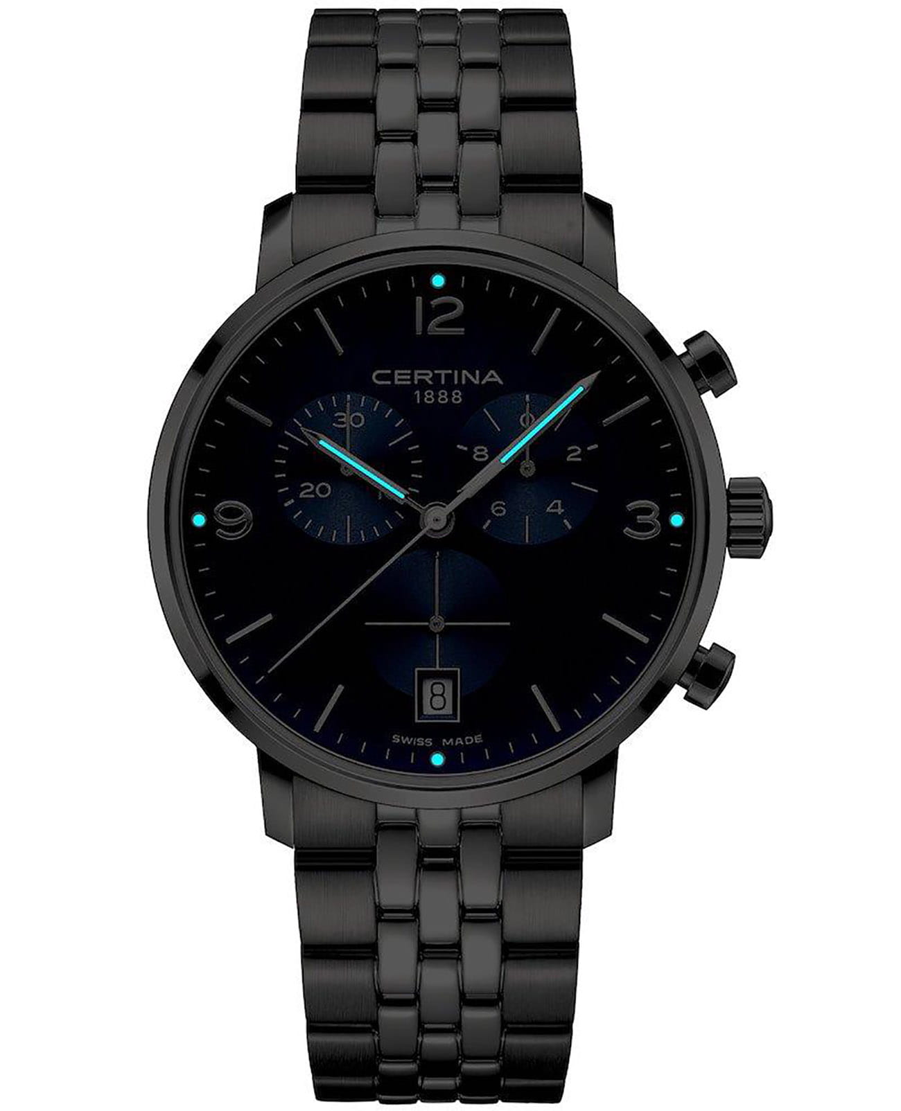 Брендовая модель поможет дополнить образ современного городского жителя. Классический стальной браслет с системой быстрой смены позволяет экспериментировать с образами. ХронографХронографФункция позволяет измерять отрезки времени с особой точностью: часы, минуты, секунды. Верным признаком хронографа является наличие на циферблате 3 дополнительных окошек-счётчиков. наделён синим циферблатом, оттенок приятно гармонирует с серебристым блеском ударопрочного корпусаУдаропрочный корпусМеханизм заключён в корпус, выполненный из современных материалов, устойчивых к ударам, механическим повреждениям и падению с высоты: инновационный пластик, карбон, нержавеющая сталь, титан.. Швейцарский кварцевый механизм ETA G10.212. Концепция Двойной надёжности DS ConceptDS ConceptDouble Security Concept, обозначает двойную надёжность и безупречную точность часов Certina. Двойная система защиты подразумевает обеспечение максимальной устойчивости к ударам и высоких показателей водонепроницаемости.. Сапфировое стекло с обработкой «антиблик». Водостойкость при давлении до 10 бар. Нержавеющая сталь 316L устойчива к царапинам и механическим воздействиям. Секундомер, отображение текущей даты. Диаметр корпуса: 42 мм.