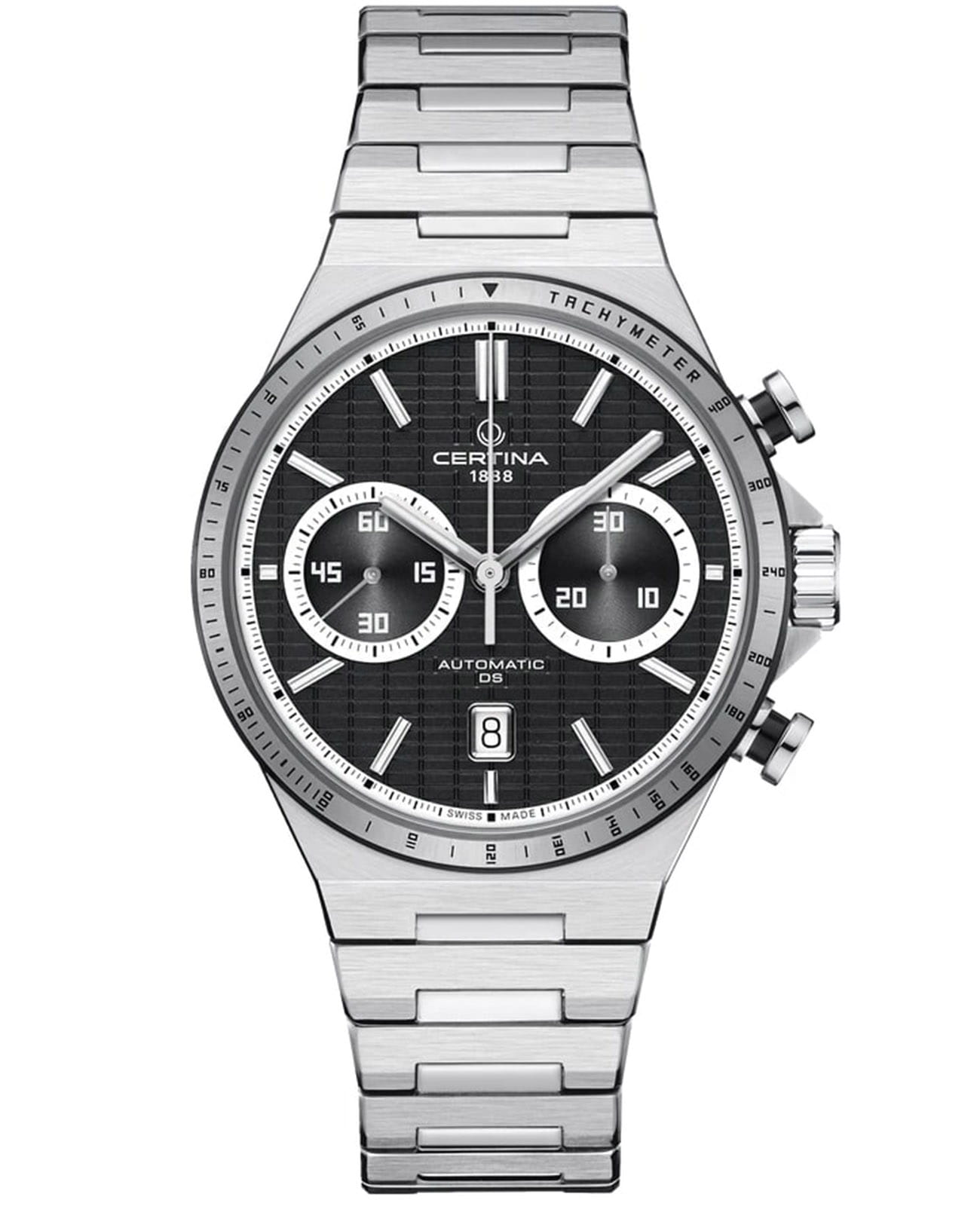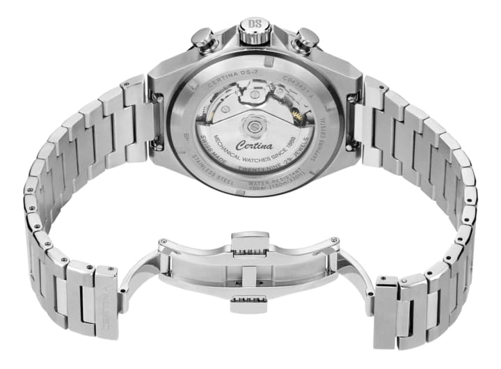 Мужские часы-хронографХронографФункция позволяет измерять отрезки времени с особой точностью: часы, минуты, секунды. Верным признаком хронографа является наличие на циферблате 3 дополнительных окошек-счётчиков. Certina DS-7 Chrono Auto C043.427.21.051.00. Корпус часов изготовлен из нержавеющей стали 316L. Под твердым сапфировым стекломСапфировое стеклоПрочный и надёжный материал из кристалла сапфира синтетического происхождения, характеризующийся особой твёрдостью и устойчивостью к царапинам и повреждениям. с антибликовым покрытиемАнтибликовое покрытиеСлой оксида металла в 0,13-0,3 микрон, благодаря которому стекло часов не бликует и не отражает свет. Антибликовое покрытие уменьшает отражение света в 10 раз, обеспечивая отличную читаемость показателей циферблата. Окошко даты в положении 6 часа, а также маркировку, покрытую люминесцентным покрытиемЛюминесцентное покрытиеПозволяет считывать показания времени в темноте. Производители наносят на стрелки, часовые индексы, безель или поверхность циферблата светонакопительный состав, дающий холодное свечение. Super-LumiNova. Класс водозащиты: 100 метров, позволит плавать, нырять и заниматься другими водными видами спорта. Стальной браслет на застёжке-бабочке с кнопкамиЗастёжка "бабочка"Такой вид застёжки дополняется предохранителями, помогающими избежать случайного раскрытия браслета. Обладают изящным исполнением. .ТахиметрТахиметрРазмеченная шкала, располагается на ободке или безеле часов. Тахиметр позволяет рассчитать скорость на определённом участке пути, расстояние измеряется в километрах или милях..